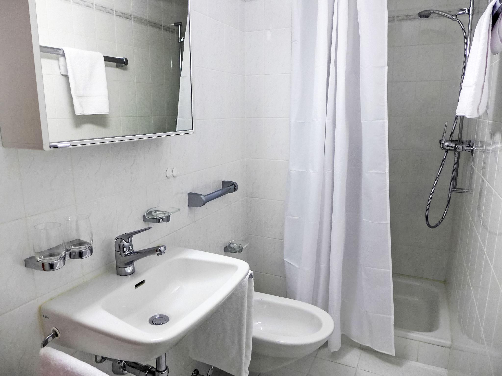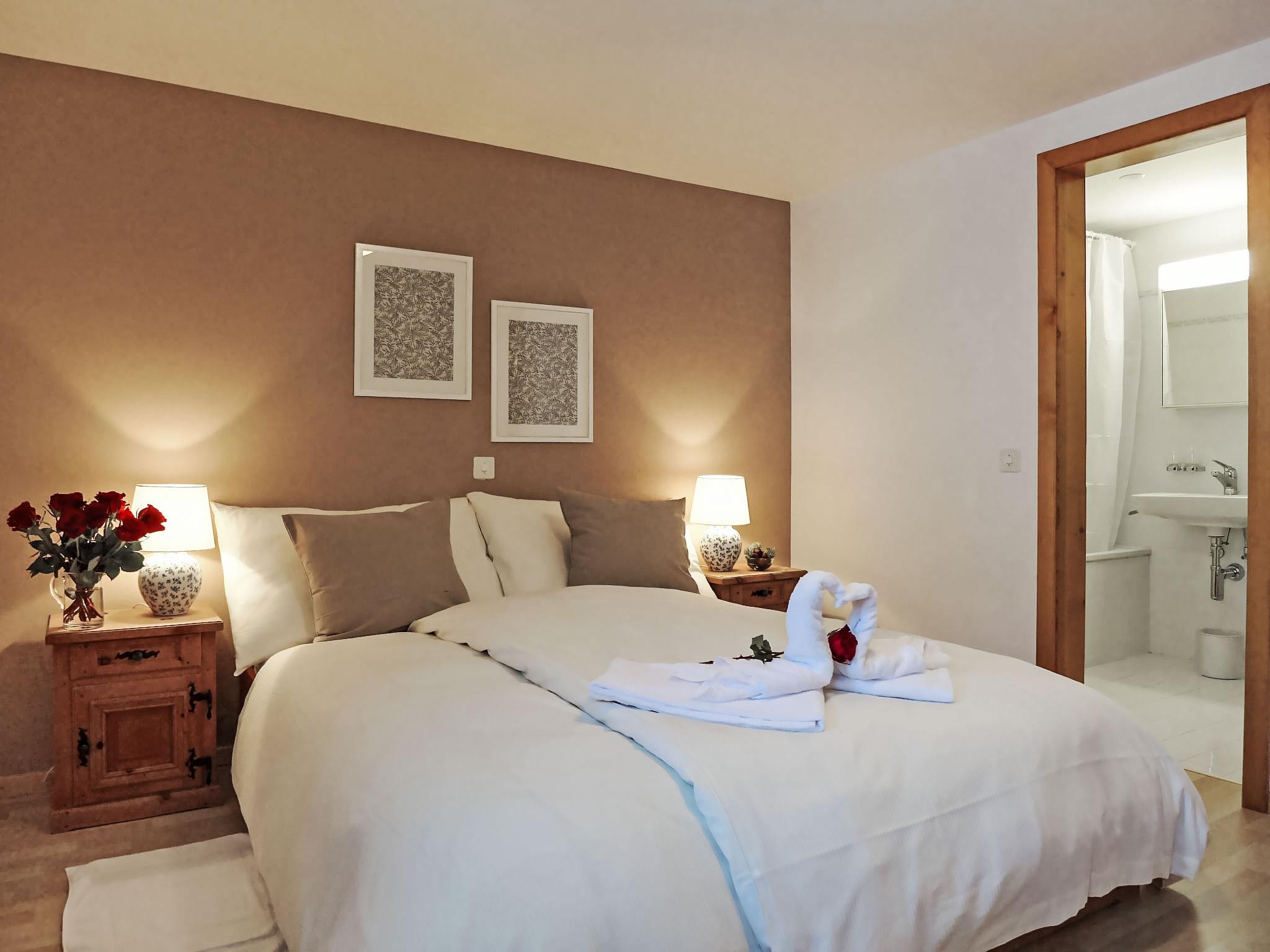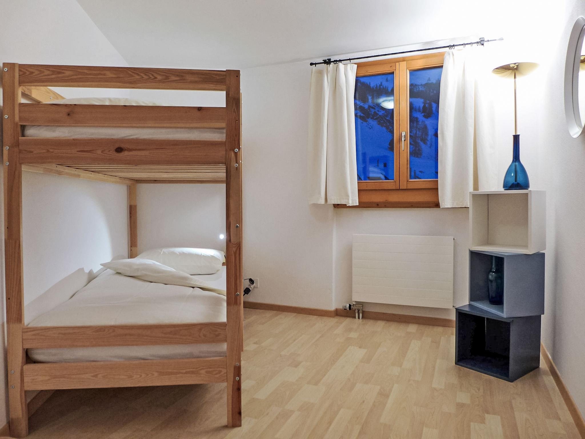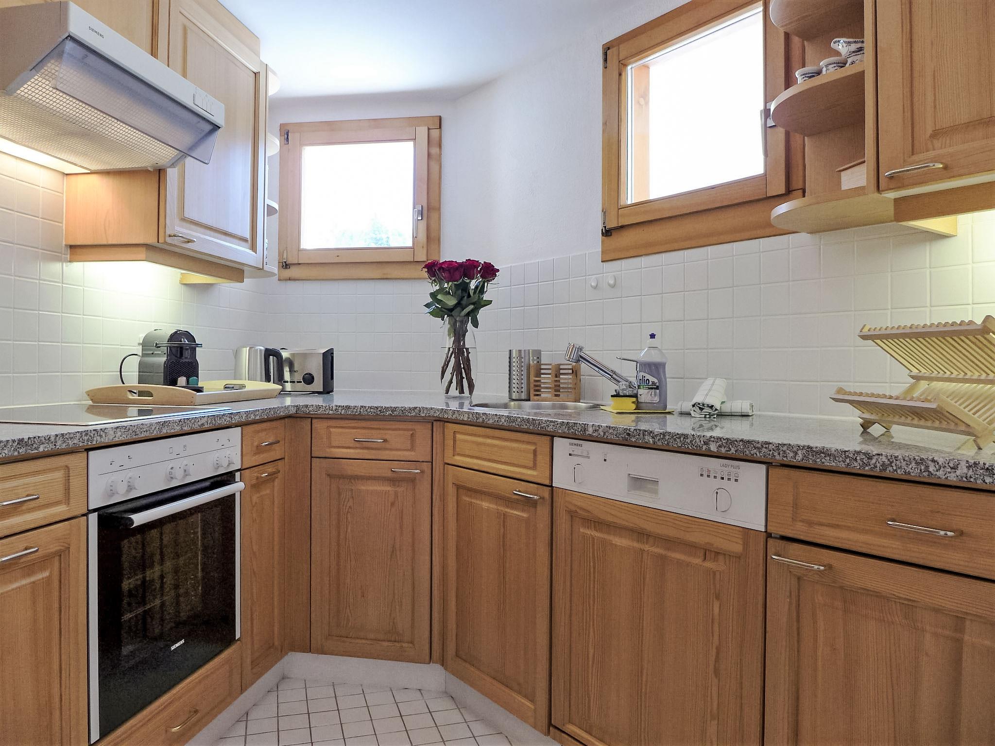 "Chesa Fuolla Verda A8", 4-room apartment 100 m2 on 1st floor. Spacious and bright, comfortable and cosy furnishings: living/dining room with open-hearth fireplace and TV (flat screen). Exit to the balcony, south facing position. 1 large double bedroom, window onto the courtyard with 1 french bed (2 x 80 cm, length 200 cm). 1 room, window onto the courtyard with 2 beds (90 cm, length 200 cm). 1 children's room, window onto the courtyard with 1 x 2 bunk beds (90 cm, length 190 cm). Open kitchen (oven, dishwasher, 4 ceramic glass hob hotplates, toaster, kettle, electric coffee machine, Capsules for coffee machine (Nespresso) extra, fondue Set (cheese)). Bath/WC, shower/WC. Balcony furniture. Beautiful view of the mountains and the countryside. Facilities: iron, hair dryer. Internet (WiFi, free). Garage space n 13/A8, height 220 cm, width 210 cm. Please note: suitable for families. Non-smokers only, non-smoking house. Maximum 1 pet/ dog allowed.