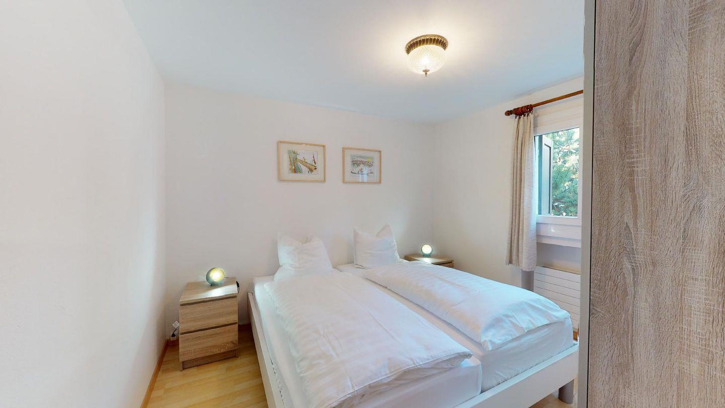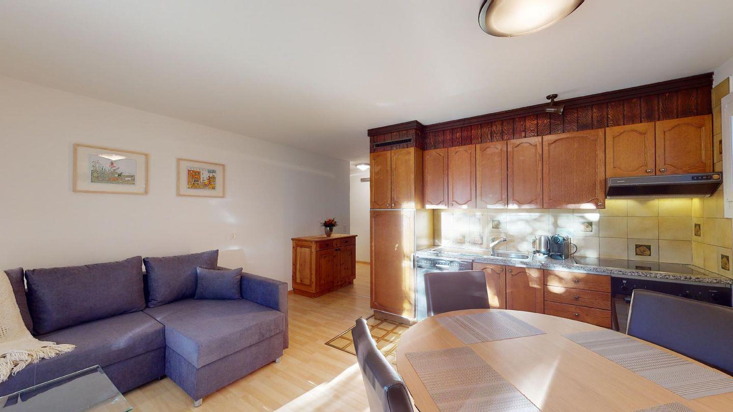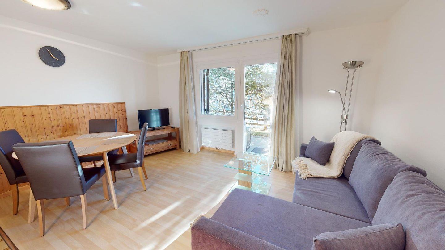 Gemütliche, zweckmässiges 3-Zimmer-Appartement im Parterre. Wohn- /Esszimmer mit Terrasse. Offene Küche. 1 Doppelschlafzimmer mit Grandlit. 1 Zimmer mit Kajüttenbetten. Bad/Dusche. Garagenplatz.