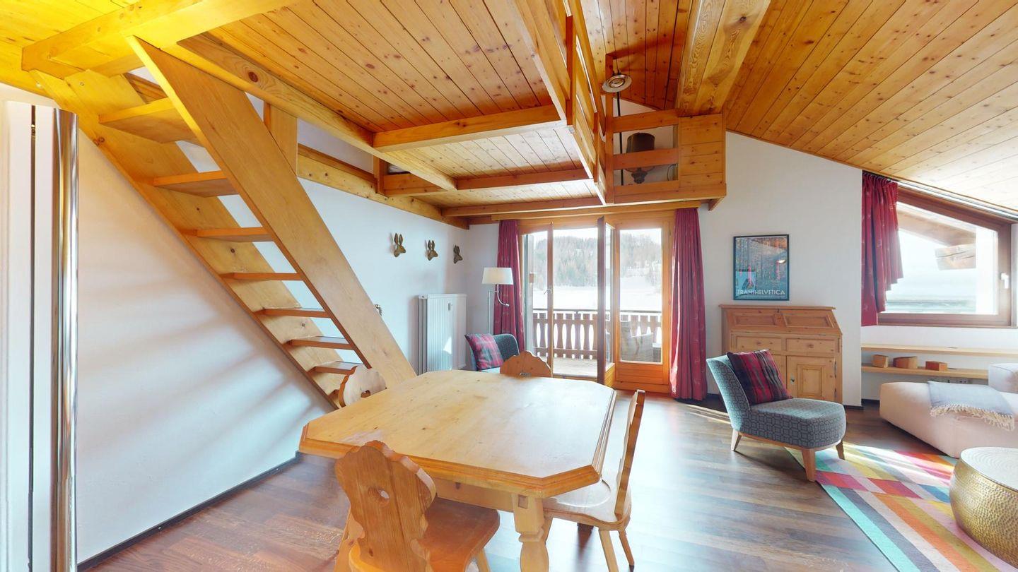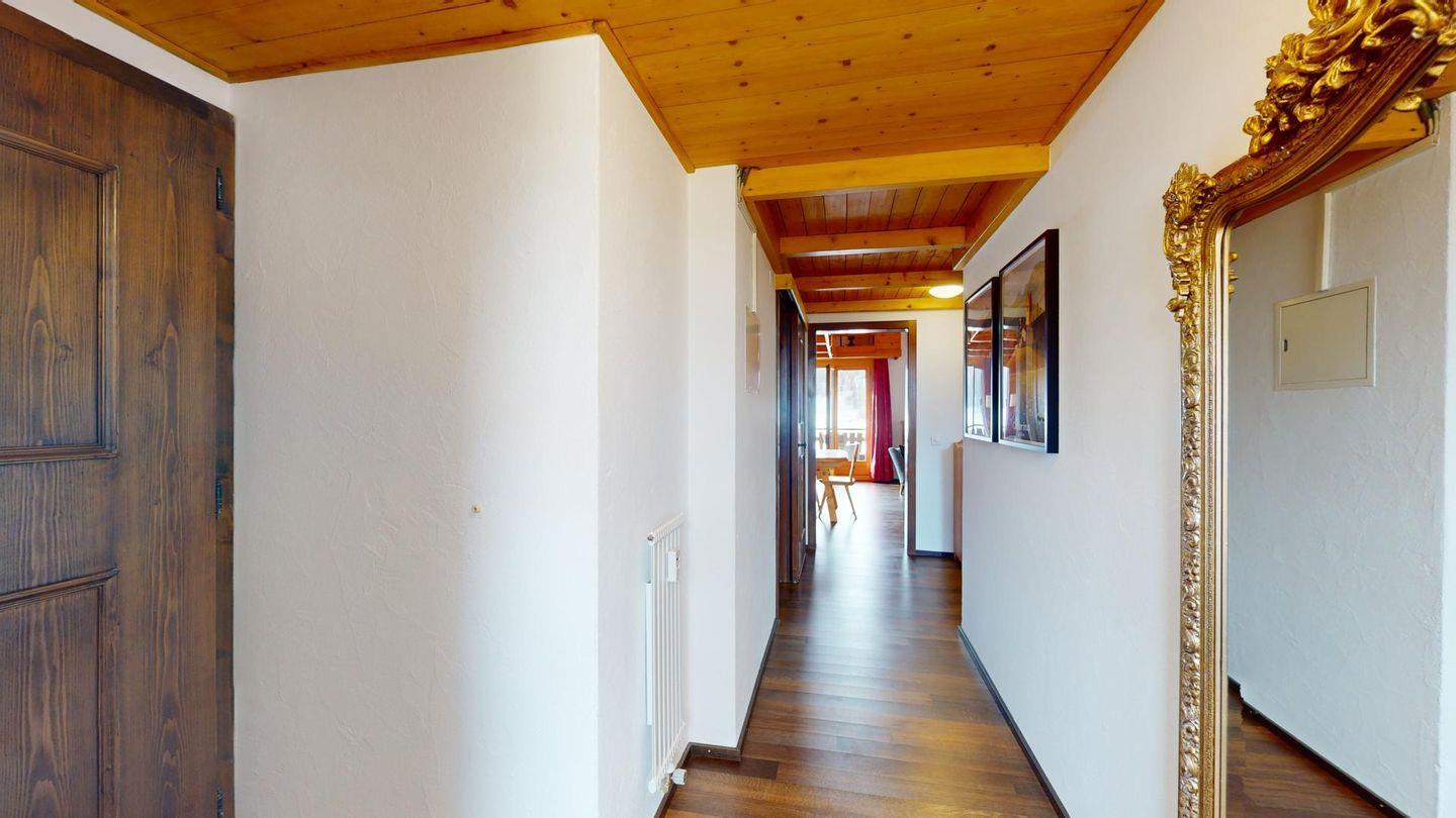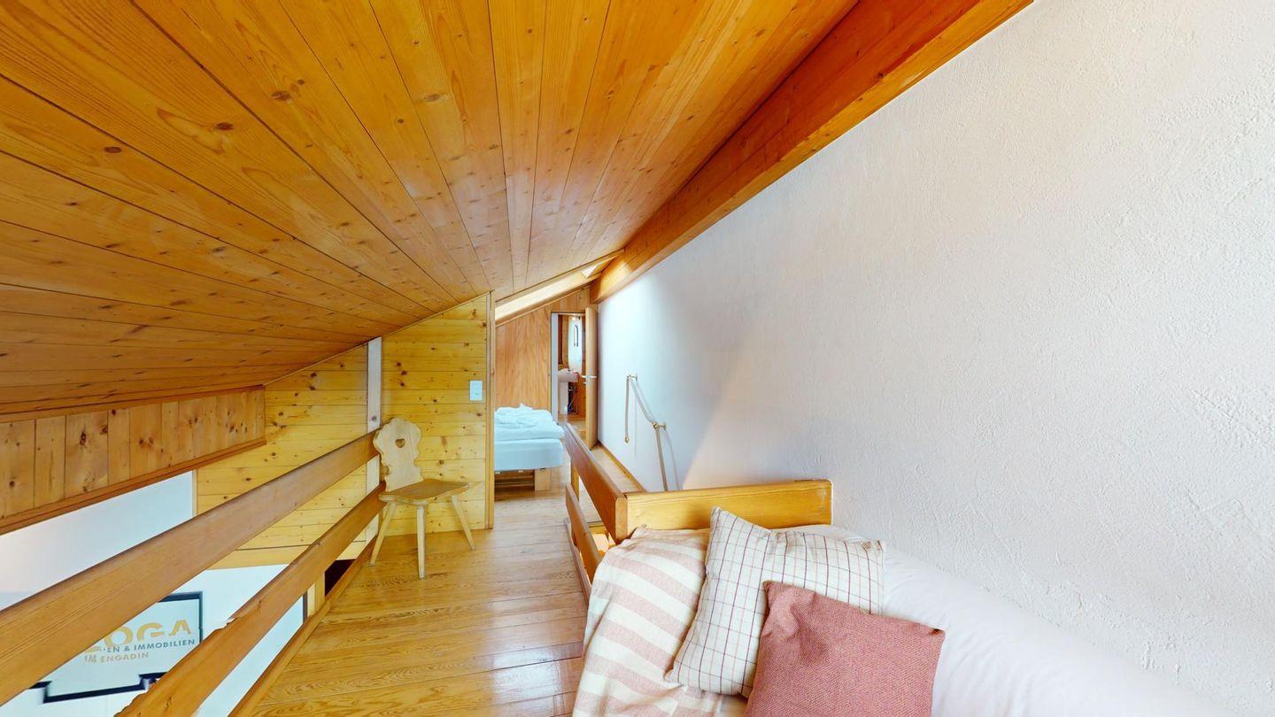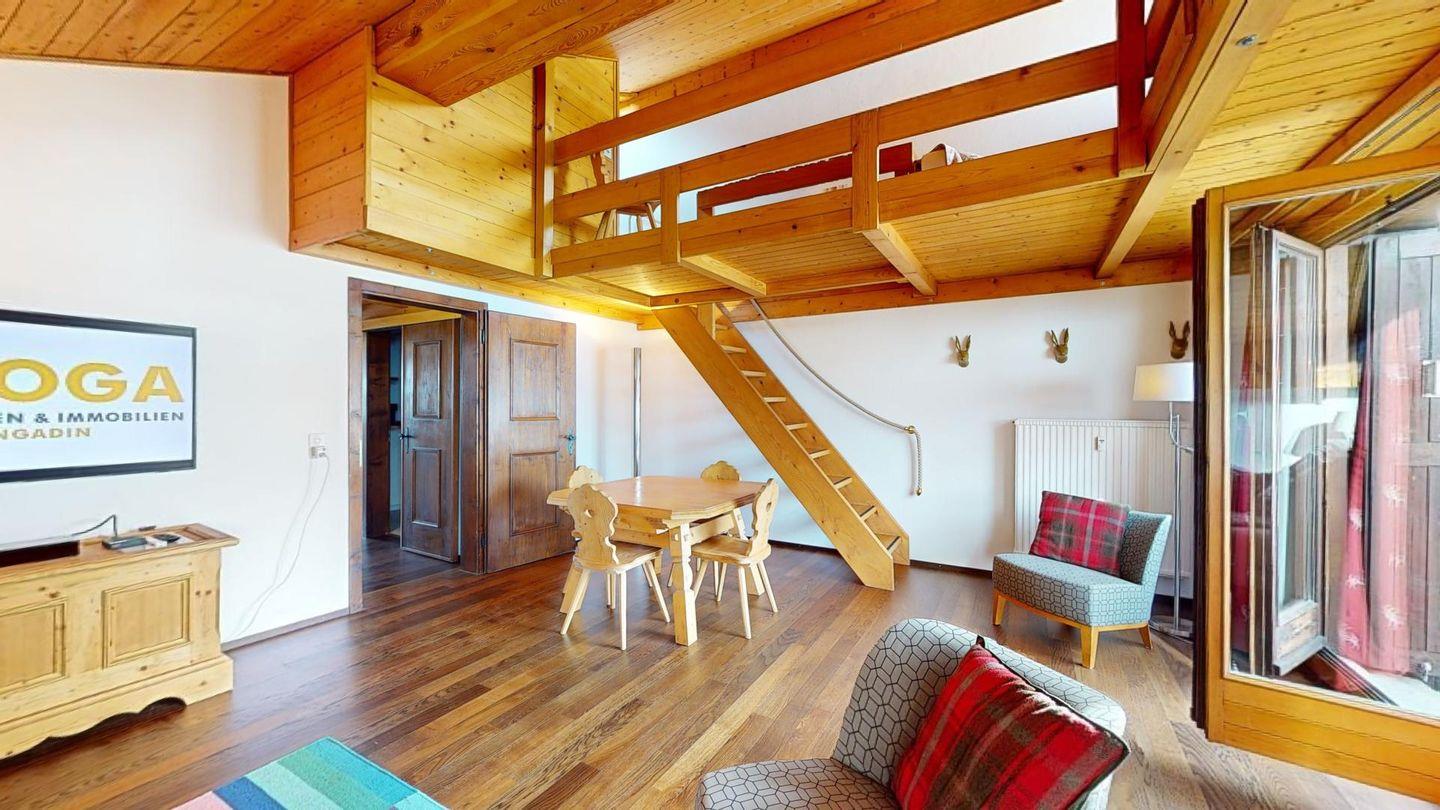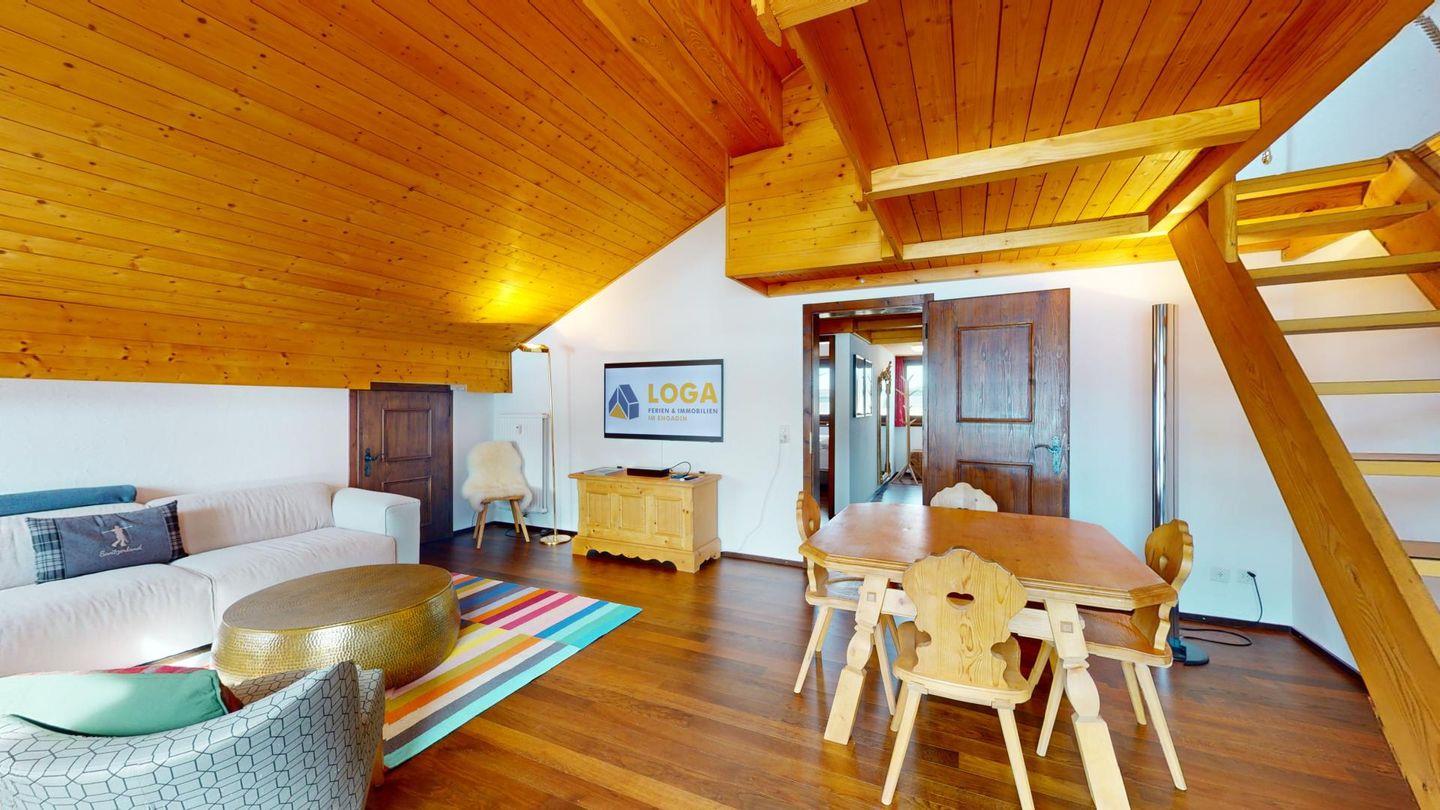 2½ -Zimmerwohnung im 3. Stock. Eingang mit Garderobenständer und Fenster. Grosses Wohn-/ Esszimmer mit Südbalkon, grossem Sofa und TV. Separate Küche mit Backofen, Geschirrspülmaschine, Chicco d'Oro Kaffeemaschine, Toaster, Mikrowelle und Kühlschrank. Ein Schlafzimmer mit Boxspringbett (180x200). Bad mit Badewanne/Bidet/Lavabo/WC. Vom Wohnzimmer führt eine Treppe zur offenen Galerie, wo sich ein Doppelbett (180x200), ein kleineres Sofa sowie ein Bad mit Badewanne/WC/Lavabo/Waschmaschine befinden. Garagenplatz. Gemeinschaftliche Waschküche vorhanden. Haustiere sind erlaubt. Nichtraucherwohnung.