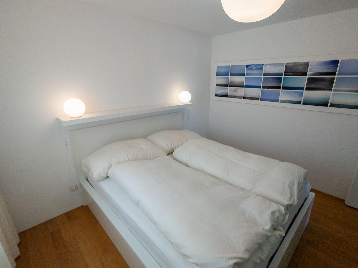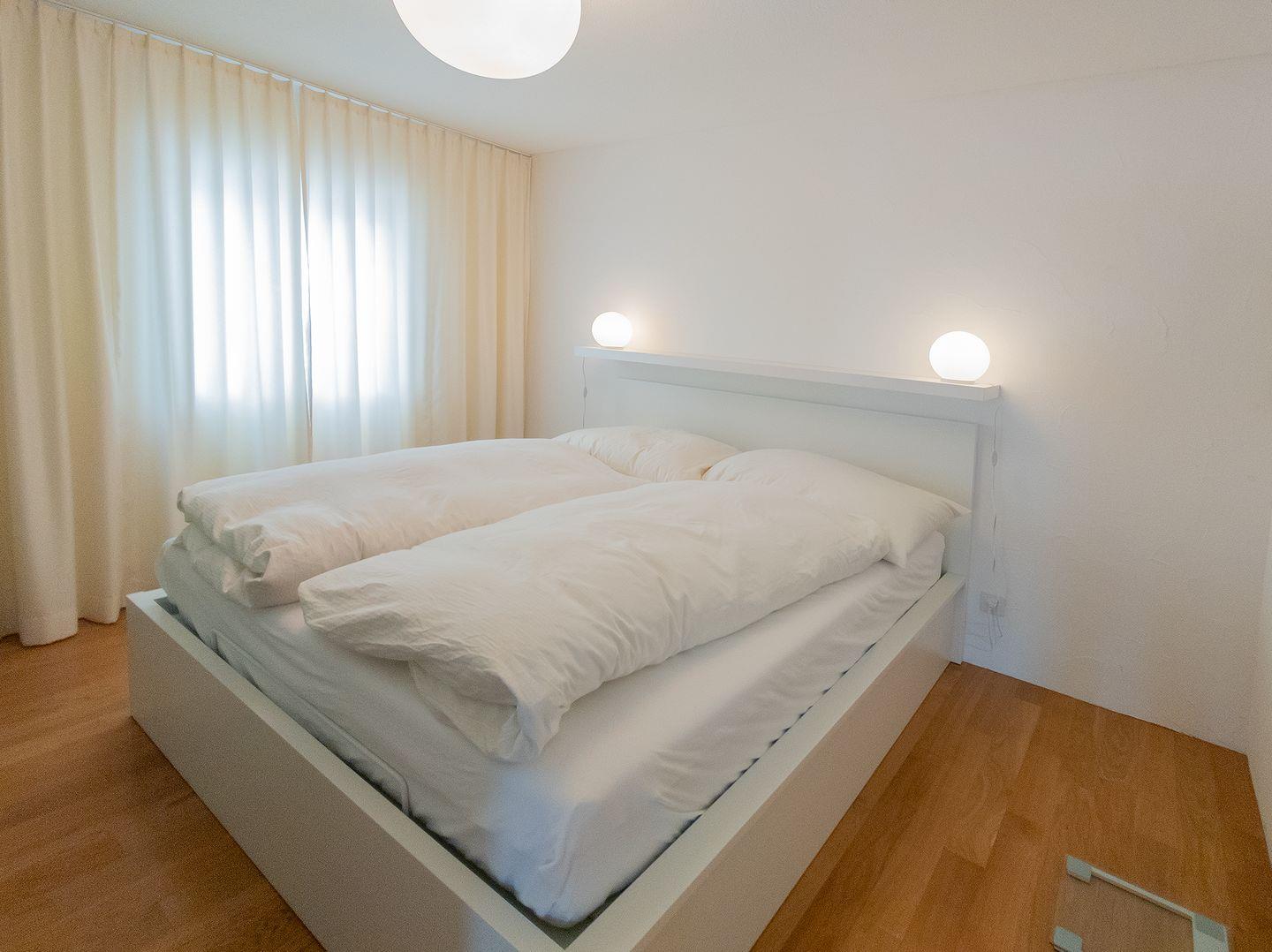Das Wohnzimmer hat direkten Zugang zum sonnigen Balkon, der nach Westen gerichtet ist. Im geräumigen Wohnzimmer befinden sich eine gemütliche Essecke und ein bequemes Sofa. Die Wohnung verfügt über ein Schlafzimmer mit einem Doppelbett (160x200), welches inklusive Matratze im Frühling 2024 ersetzt wurde, und einem geräumigen Kleiderschrank. Ein Sofabett im Wohnzimmer bietet eine weitere, vollwertige Schlafgelegenheit. Die renovierte Küche ist komplett ausgestattet und verfügt über viel Platz. Im Badezimmer werden Sie eine begehbare Dusche vorfinden. Auch in der Garderobe befindet sich ein grosser Schrank.