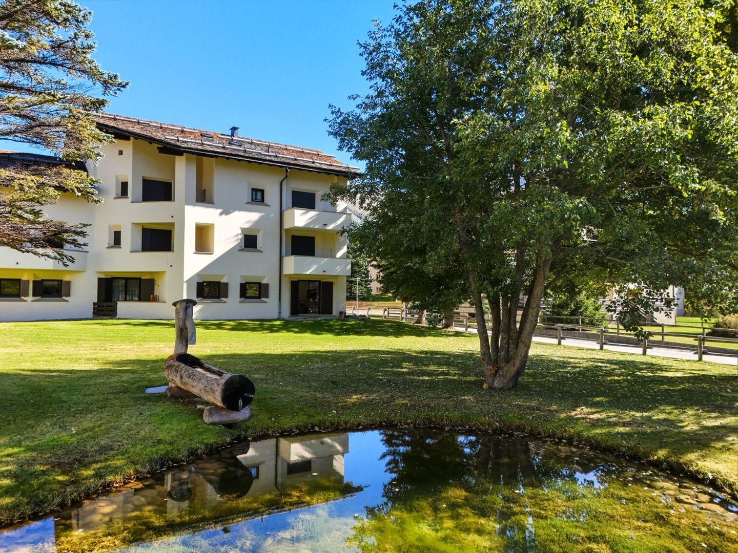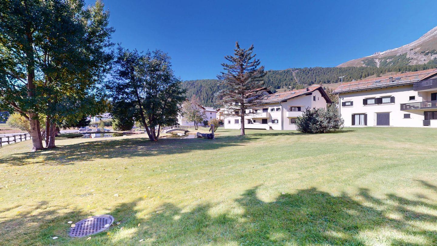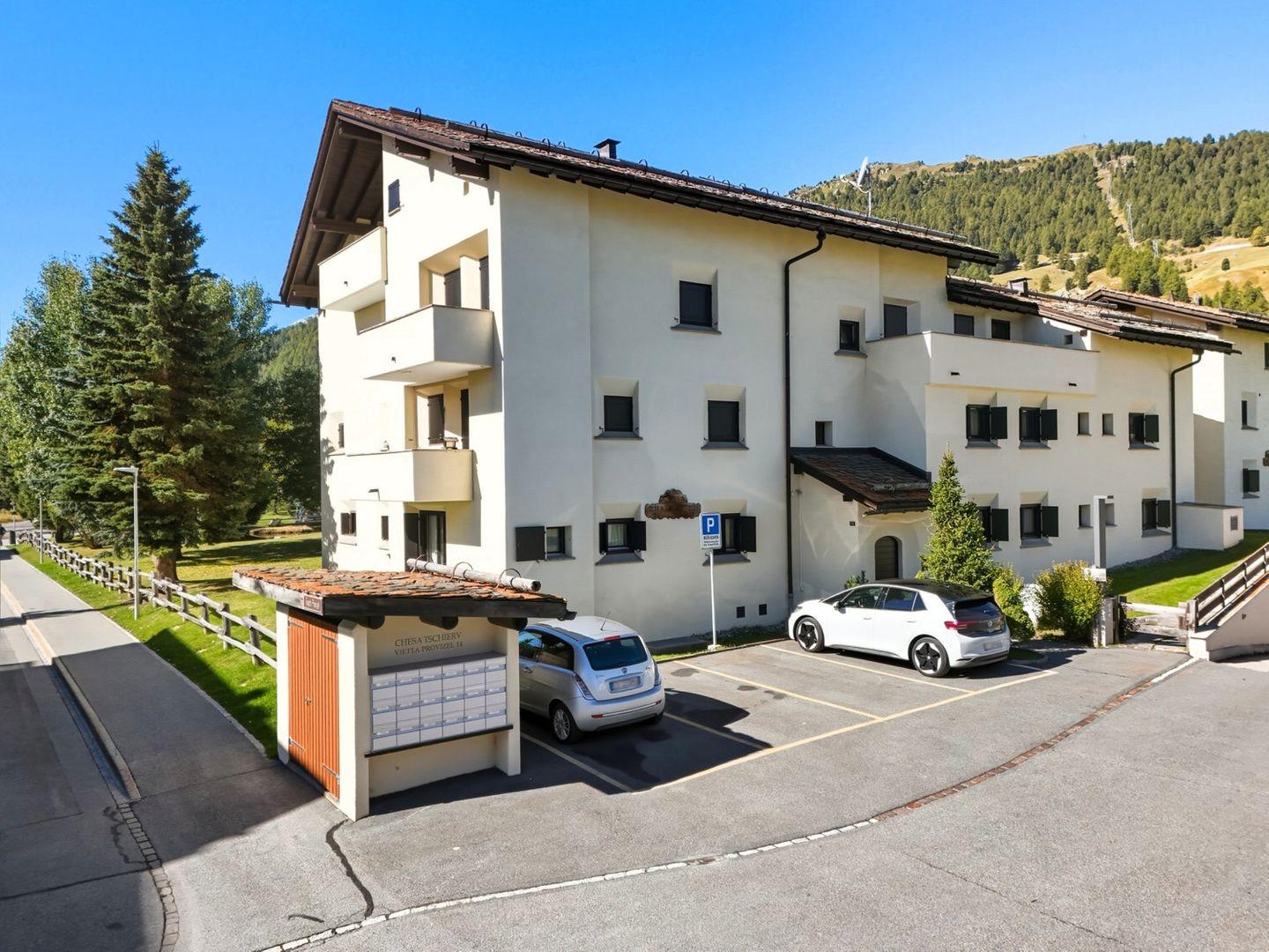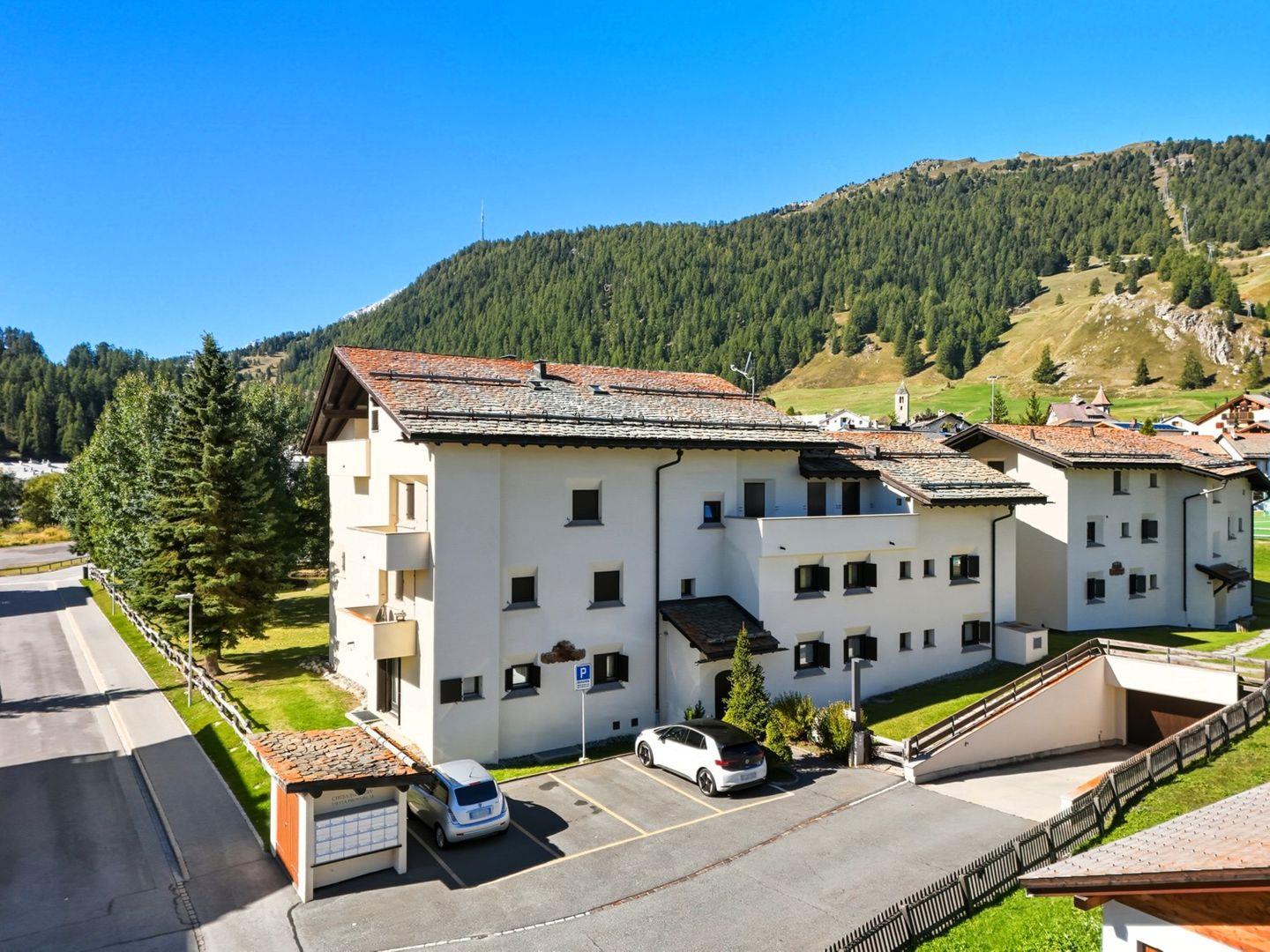 Die Chesa Chamuotsch ist ein Mehrfamilienhaus an ruhiger und sonniger Lage. Etwa 100 m vom Haus entfernt laden im Sommer Tennisplätze und im Winter der Eisplatz zu sportlichen Aktivitäten ein. Der Bahnhof ist ca. 500 m, die Bergbahn Saluver/Marguns ist ca. 700 m entfernt. Diverse Restaurants sowie die Langlaufloipen sind in unmittelbarer Nähe.