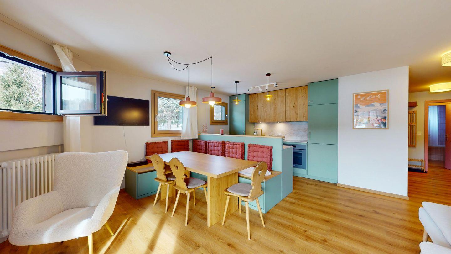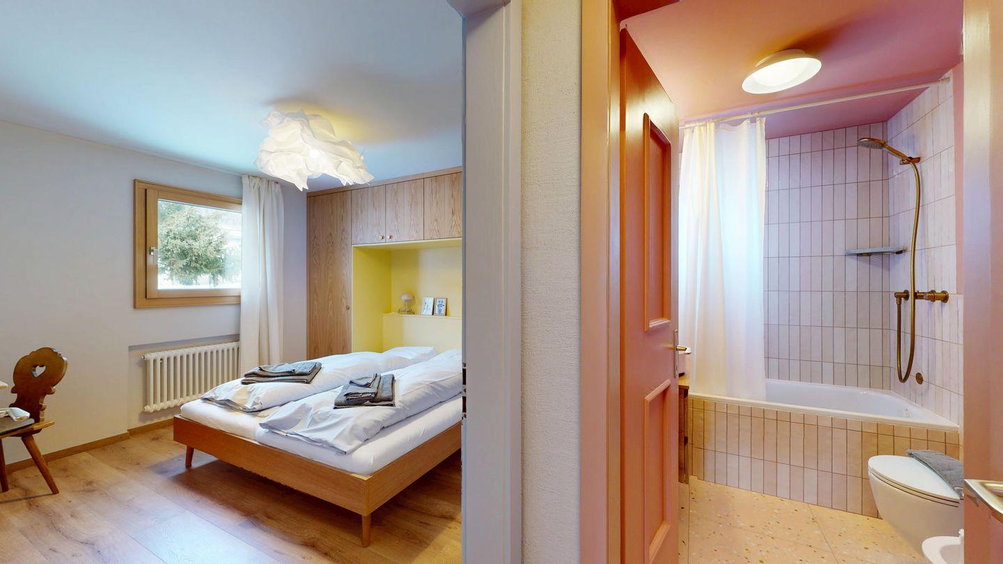 Die neu und aufwendig renovierte 3½-Zimmerwohnung im Parterre, bietet modernen Komfort an ruhigen Lage. Sie eignet sich hervorragend für Familien oder Paare. Eingang mit Garderobe, helles Wohnzimmer mit Sitzecke, Sofa, TV, Zugang zum Balkon mit schönem Bergblick. Moderne kleine Küche, mit hochwertigen Geräten ausgestattet: Kühlschrank mit Gefrierfach und zusätzlich 3 separate Gefrierfächer, Geschirrspüler, Induktionsherd, Backofen, Wasserkocher, Toaster und Chicco d`Oro Kaffeemaschine. Ein Doppelschlafzimmer. Ein 2. Schlafzimmer mit 2 Hochbetten und ein Einzelbett. Badezimmer mit Badewanne/WC/Bidet, zusätzliches Gäste-WC. Ein Garagenplatz.