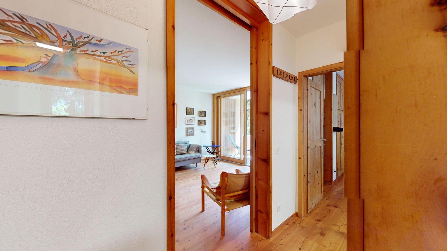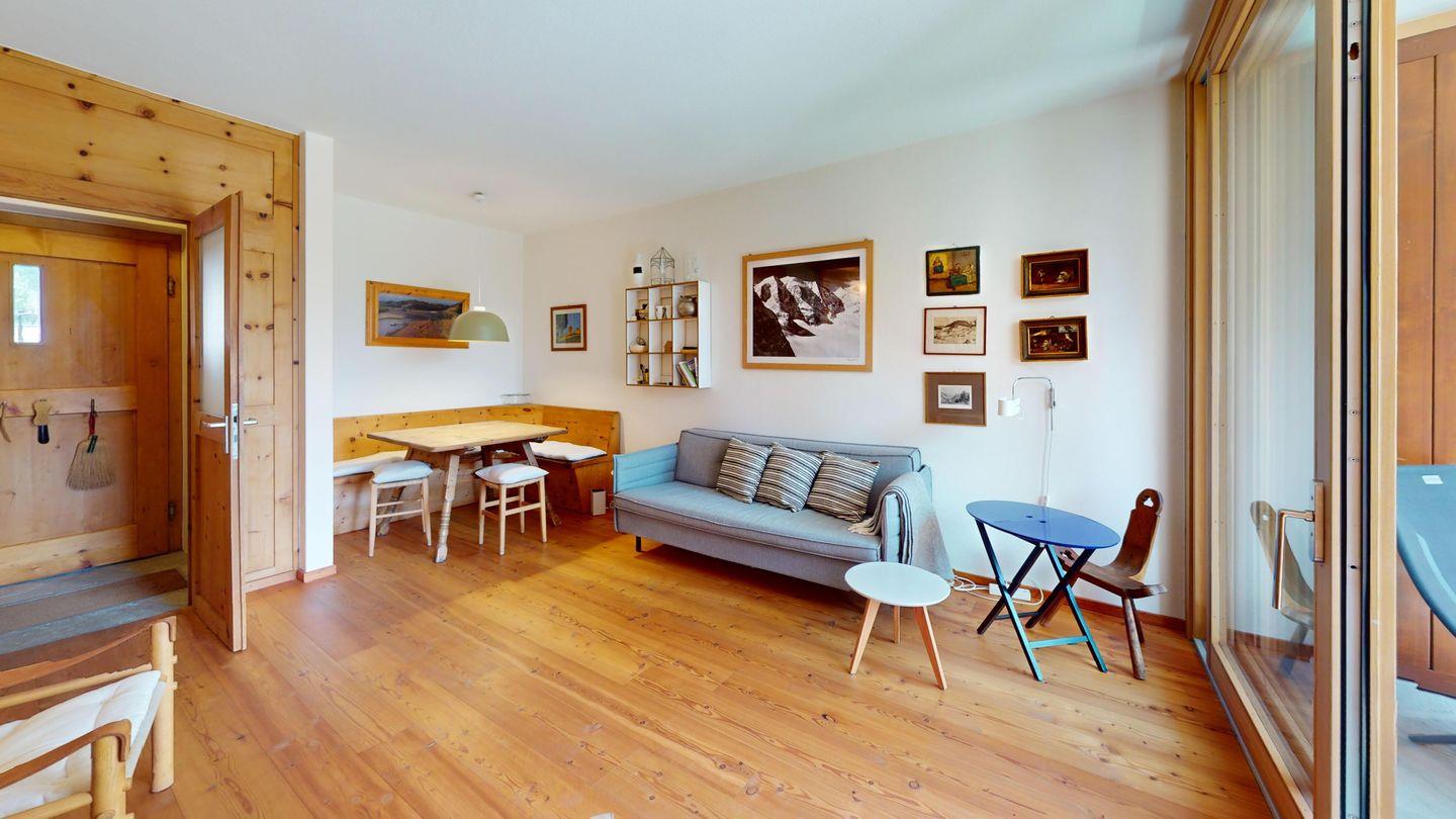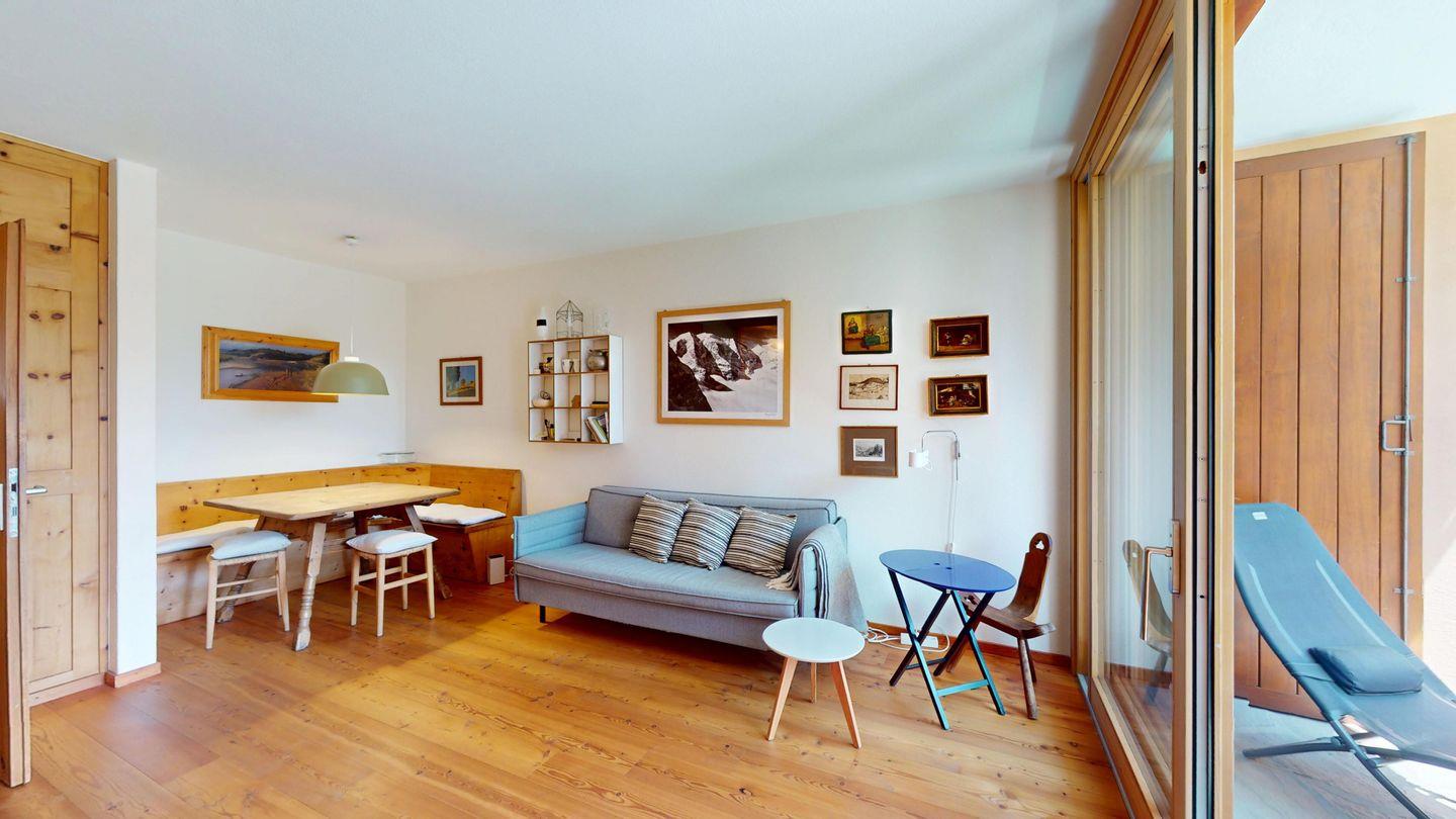 2-Zimmer-Wohnung 50 m², im 1. Stock. Eingang mit Garderobe. Wohnzimmer mit TV und Ausgang zum Balkon, Richtung Süden. 1 Doppelzimmer. Kleine Küche mit Backofen/Mikrowellen, Geschirrspüler, Kaffeemaschine Nespresso, Kühlschrank und Fenster. Ein Bad mit Dusche/WC/Lavabo und Fenster. Ein Garagenplatz. Skiraum und private Waschmaschine.