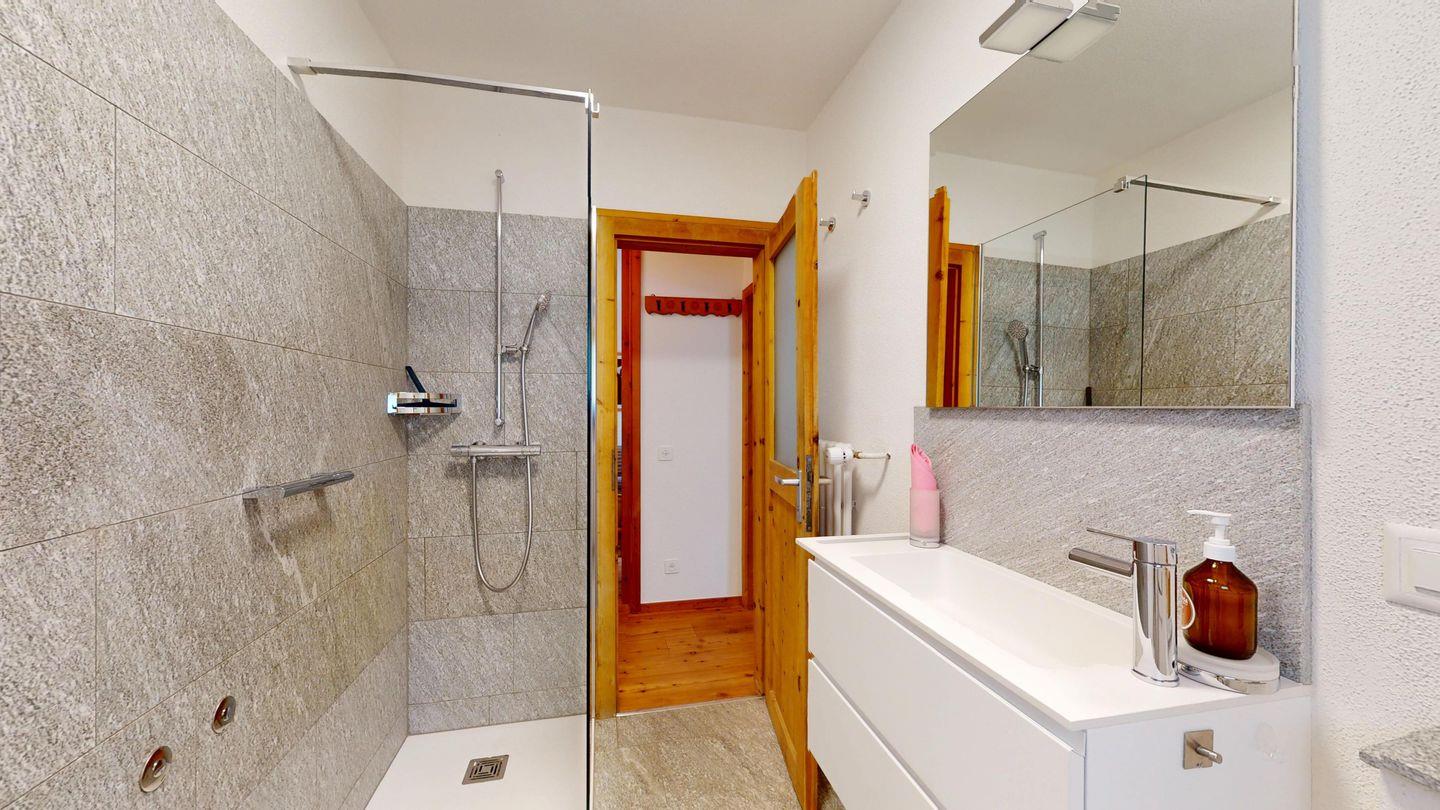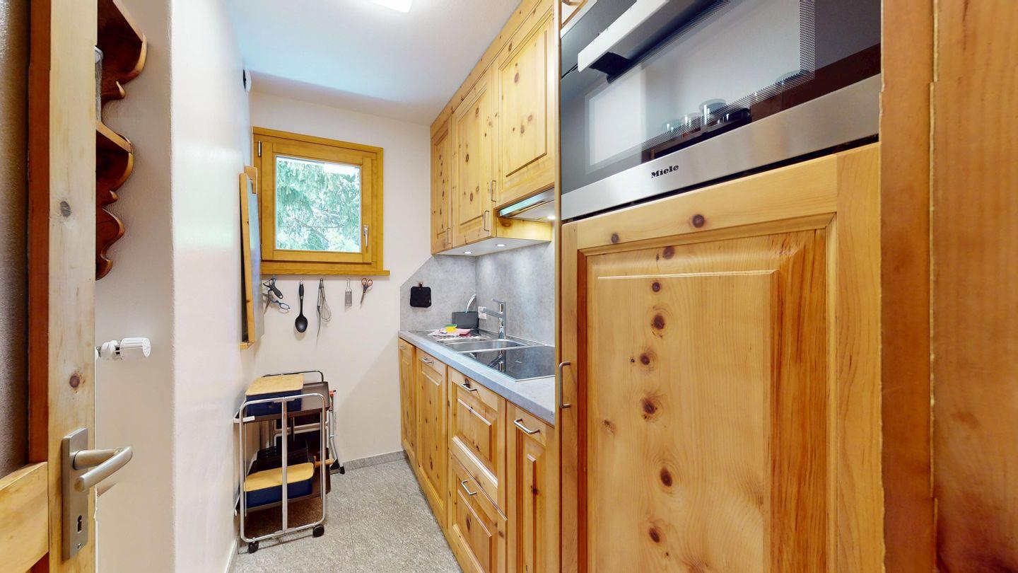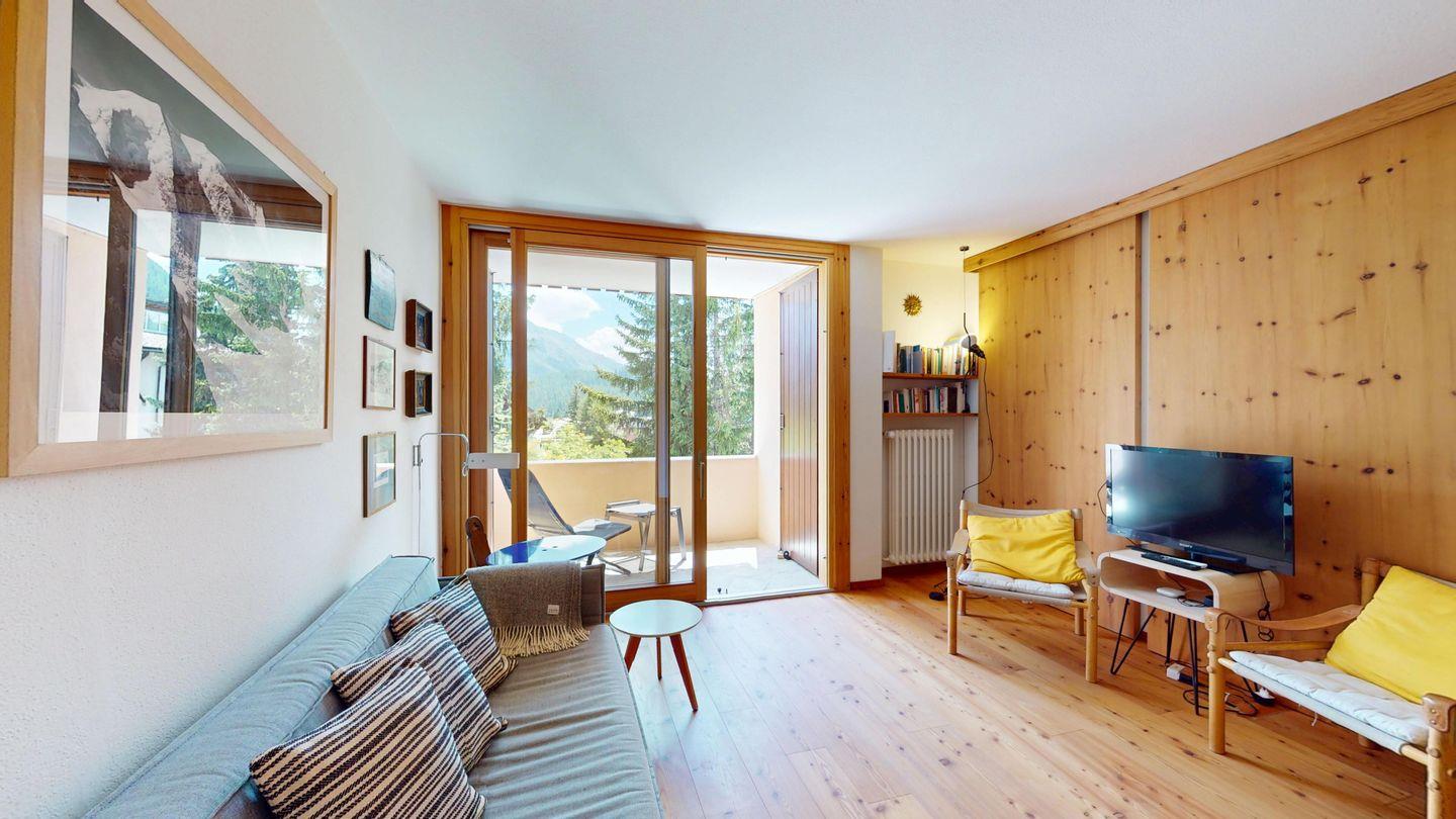 2-Zimmer-Wohnung 50 m², im 1. Stock. Eingang mit Garderobe. Wohnzimmer mit TV und Ausgang zum Balkon, Richtung Süden. 1 Doppelzimmer. Kleine Küche mit Backofen/Mikrowellen, Geschirrspüler, Kaffeemaschine Nespresso, Kühlschrank und Fenster. Ein Bad mit Dusche/WC/Lavabo und Fenster. Ein Garagenplatz. Skiraum und private Waschmaschine.