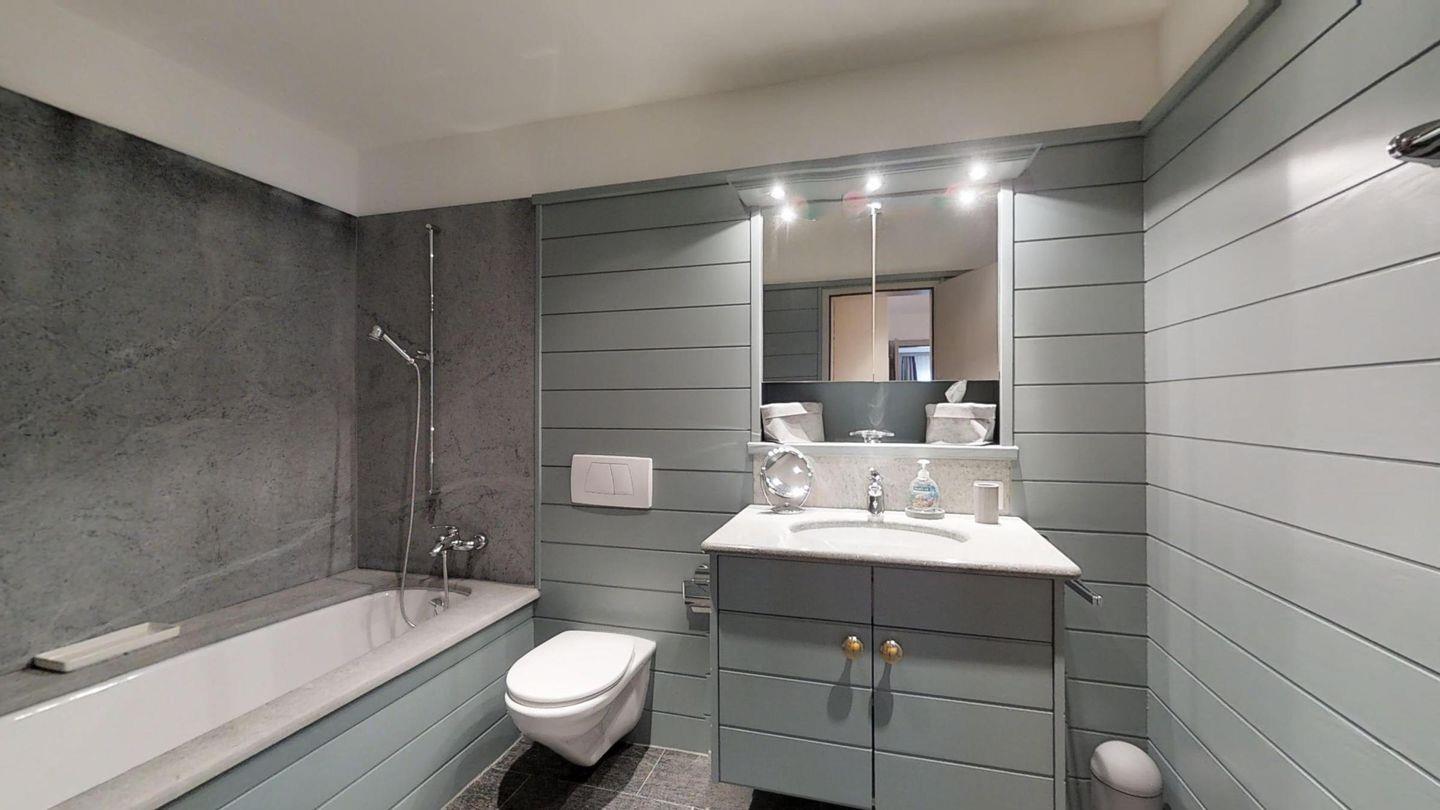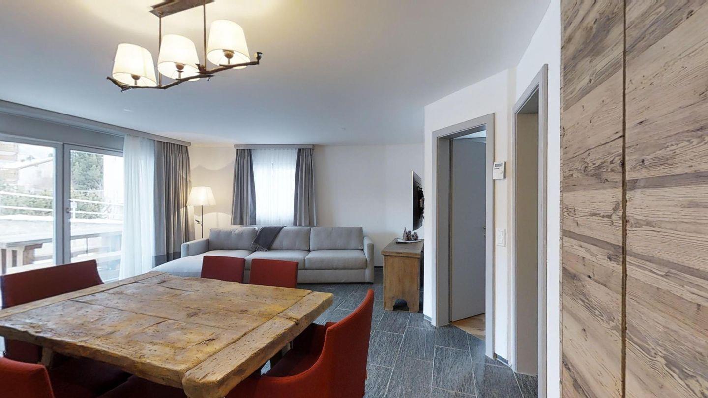 3-Zimmerwohnung im EG, ca. 90 m2. Entree mit Garderobe. Wohn-/Esszimmer mit Gartensitzplatz. Radio, Internet und TV. Küche mit Backofen, Kühlschrank, Geschirrspüler und Kaffeemaschine (Chicco d'Oro). Ein Doppelschlafzimmer (160 cm). Ein Bad/WC/Bidet und Lavabo. Ein Zimmer mit Schlafsofa. Dusche/WC/Bidet und Lavabo. Ein Garagenplatz. Eigener Waschraum (Waschmaschine und Tumbler) mit Bügelgelegenheit. Zur Mitbenützung im Haus: Spielzimmer mit Tischtennis und Skiraum. Haustiere sind erlaubt. Anreise Samstag