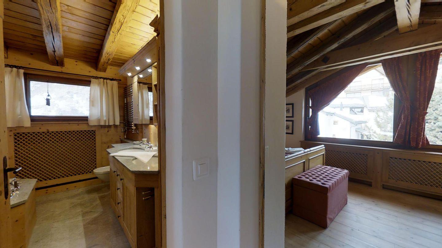 Weiters befinden sich im gleichen Geschoss auf der linken Wohnungshälfte eines der Schlafzimmer (2 Betten) mit eigenem Badezimmer mit Badewanne/WC/Doppelwaschbecken