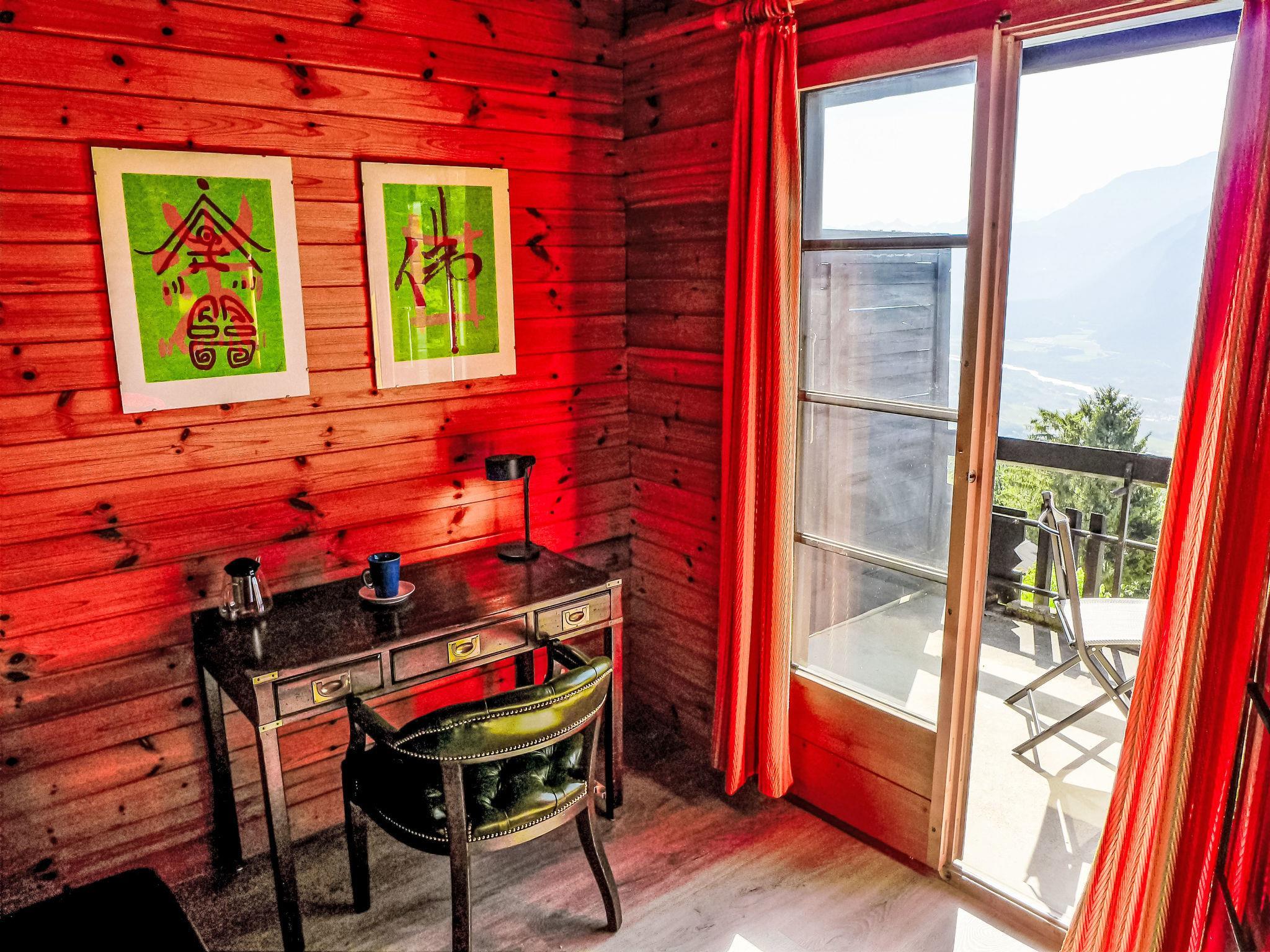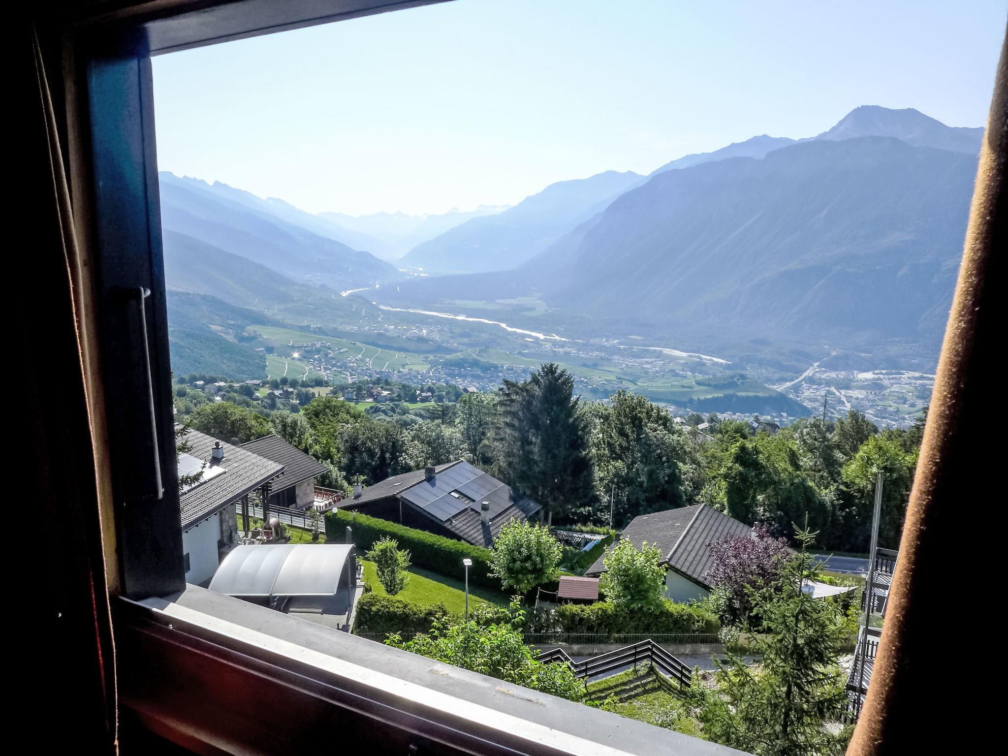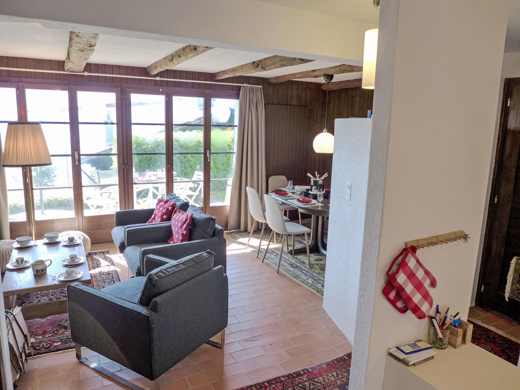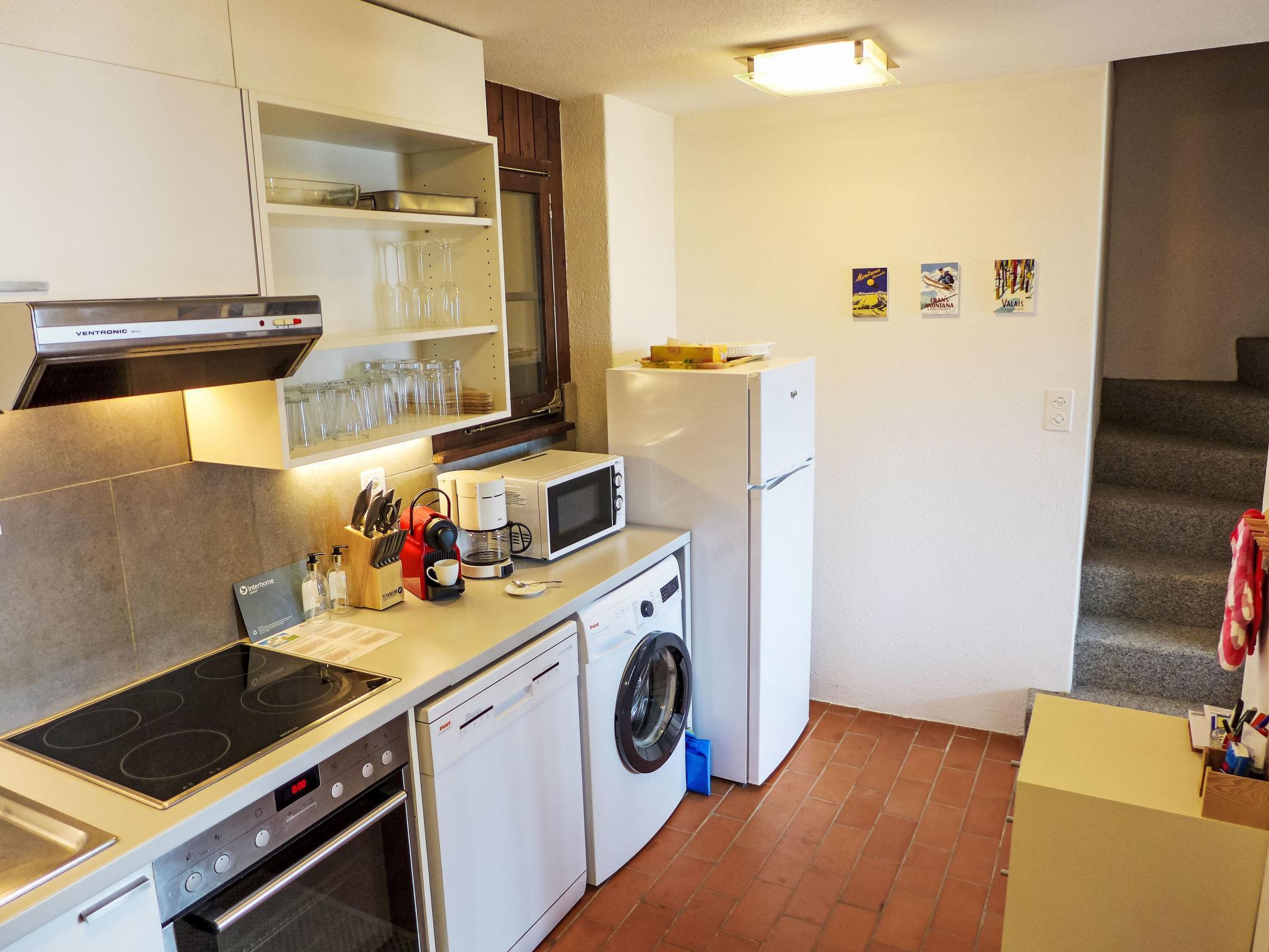 "Sans Nom", 5-room semi-detached house 120 m2 on 3 levels, south facing position. Object suitable for 4 adults + 2 children. Partly renovated in 2024, comfortable and beautiful furnishings: small living/dining room with open-hearth fireplace, cable TV, radio and CD-player. Exit to the terrace. Open kitchen (oven, dishwasher, 4 ceramic glass hob hotplates, toaster, kettle, microwave, freezer, electric coffee machine, Capsules for coffee machine (Nespresso) extra, raclette grill, fondue Set (chinoise, cheese)). Upper floor: 1 large room with 1 double bed (2 x 90 cm, length 200 cm). Exit to the balcony. 1 room with 1 bed (90 cm, length 190 cm). Bath/WC, sep. WC. 2nd upper floor: 1 room with sloping ceilings with 2 beds (90 cm, length 200 cm). 1 children's room with sloping ceilings with 1 bed (90 cm, length 190 cm). Shower/WC. Balcony 15 m2, south facing position and, east facing position, terrace 20 m2, south facing position. Terrace furniture, balcony furniture, barbecue (portable), deck chairs (1). Beautiful view of the mountains, the valley and the forest. Facilities: washing machine, iron, children's high chair, baby cot for up to 2 year olds, hair dryer. Internet (WiFi, free). Garage (1 car), height 195 cm, width 220 cm. Please note: non-smoking house. 1 small pet/ dog allowed.