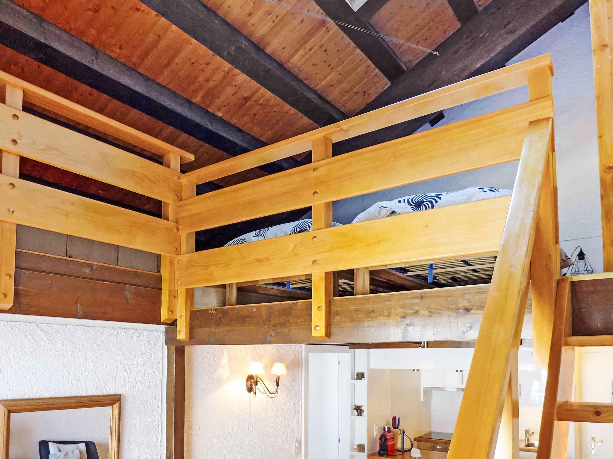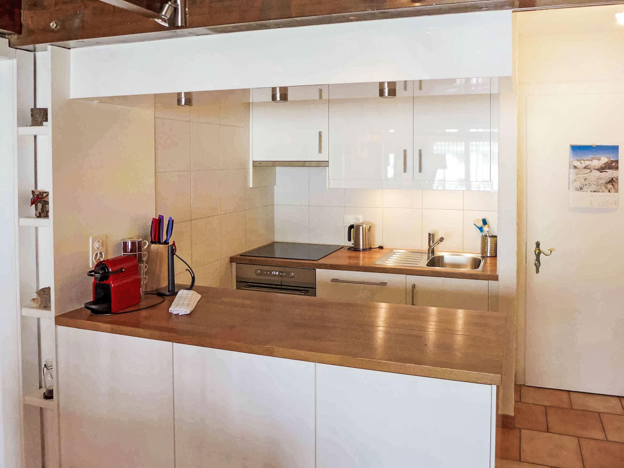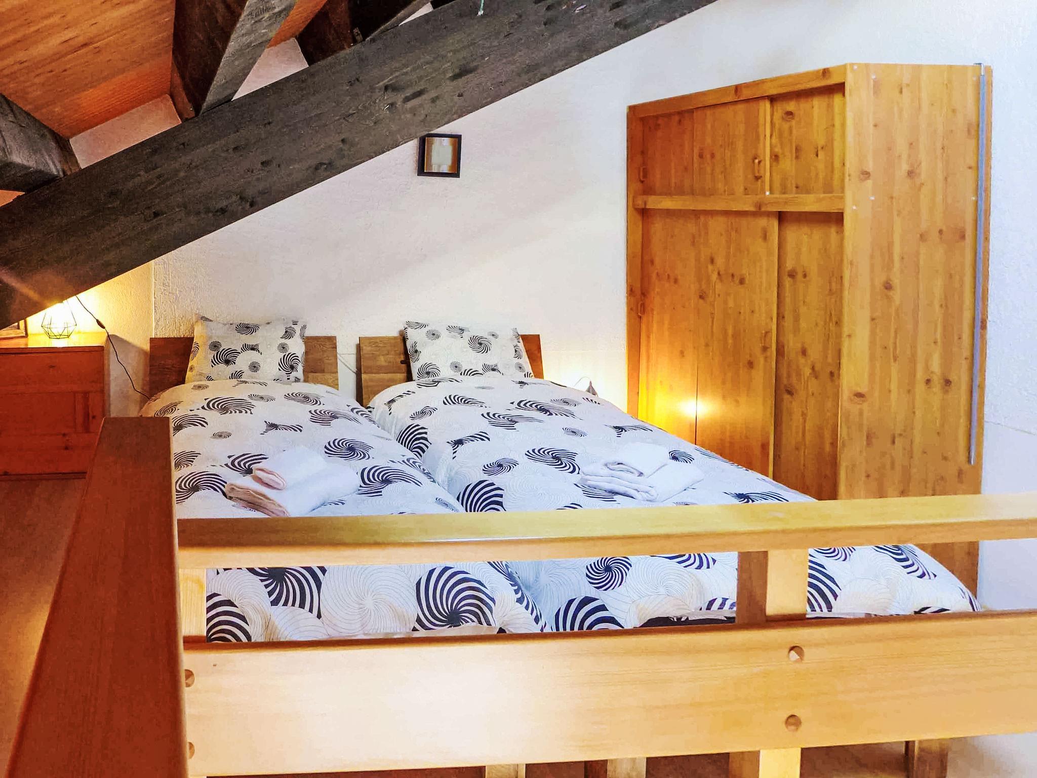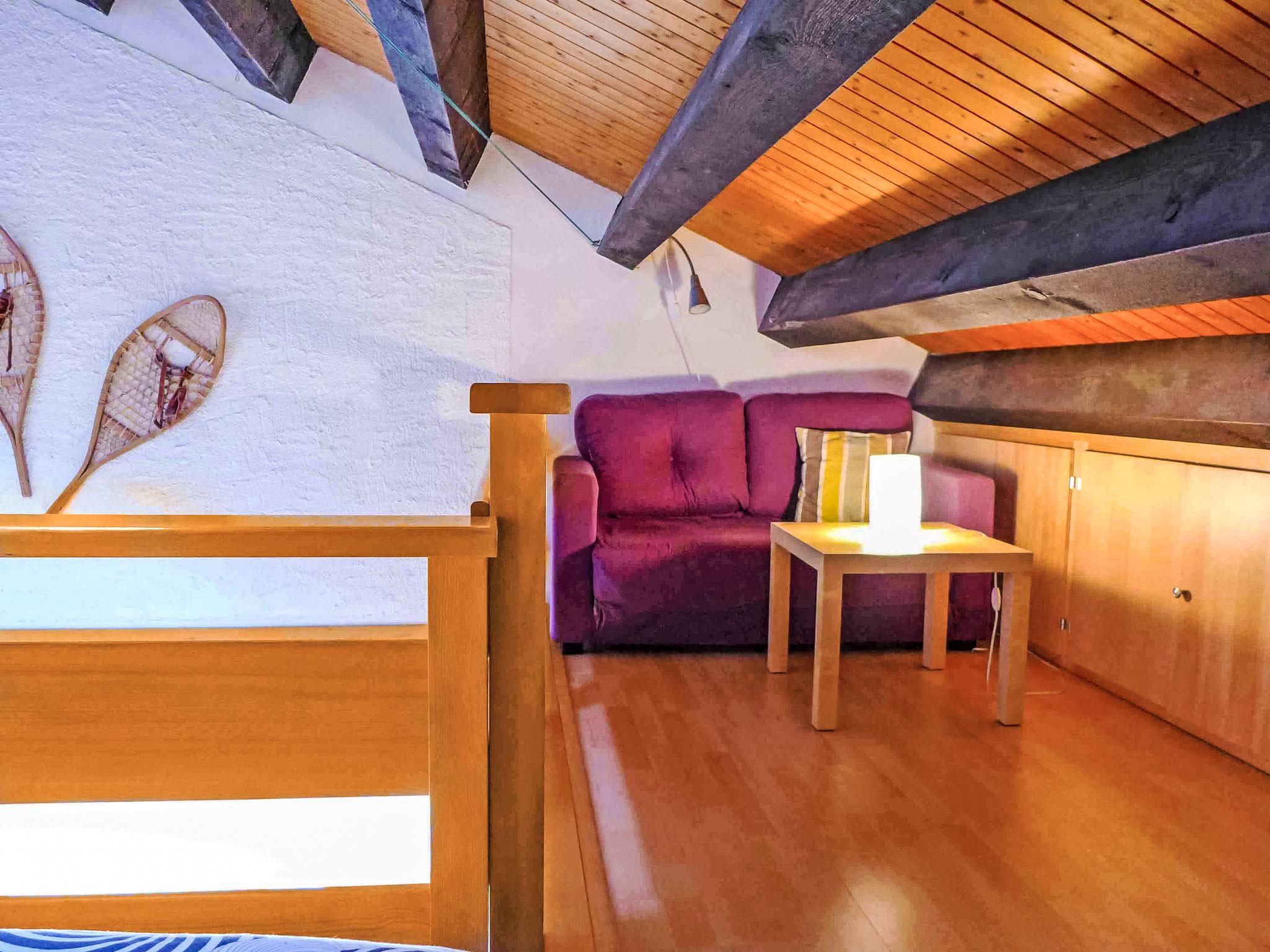 "Le Tsaumiau A 17", 2-room apartment 65 m2 on 2 levels on 2nd floor. Living room with cable TV and flat screen. Gallery with sloping ceilings with 2 beds (90 cm, length 200 cm). 1 room with 1 french bed (160 cm, length 200 cm). Exit to the balcony, east facing position. Kitchen-/living room (dishwasher, 4 ceramic glass hob hotplates, toaster, kettle, electric coffee machine, Capsules for coffee machine (NESPRESSO) extra, raclette grill, combination microwave, fondue Set (chinoise, cheese)) with dining table. Bathroom, sep. WC. Large balcony, east facing position. Balcony furniture. Side view of the mountains and the countryside. Facilities: children's high chair, baby cot for up to 2 year olds, hair dryer. Internet (WiFi, free). Garage space n 17, height 230 cm, width 290 cm. Please note: non-smokers only. Foldable baby cot without bedlinen and without covers. Instead of an enclosed bedroom, some sleeping areas are located in an open-plan area (gallery, alcove, etc.).