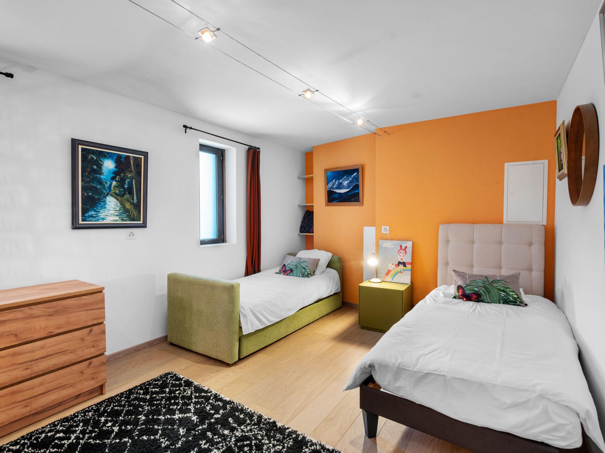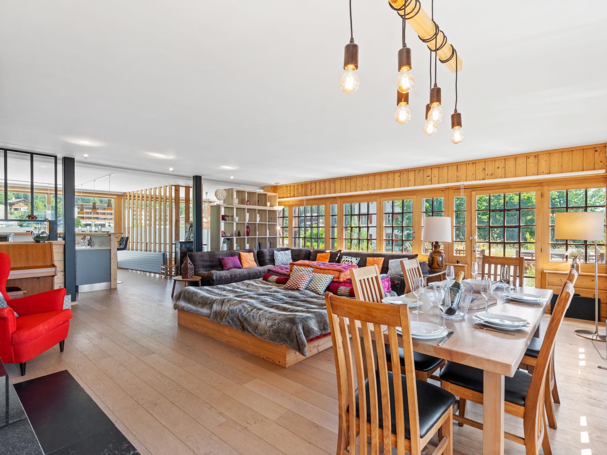 "Jeanne D'Arc LOFT COMBI", 10-room maisonette 350 m2, south facing position. Spacious, comfortable and tasteful furnishings: large living/dining room with open-hearth fireplace, dining table and cable TV. Exit to the terrace. 1 room with 1 french bed (160 cm, length 200 cm), bath/WC, double hand-basin and cable TV. 1 room with 2 beds (80 cm, length 200 cm), shower/WC. 1 room with 2 beds (80 cm, length 200 cm), shower/WC. Exit to the terrace. 1 room with 2 beds (90 cm, length 190 cm), shower/WC. 1 room with 1 french bed (160 cm, length 200 cm), bath/WC and double hand-basin. Exit to the terrace. 1 room with 1 double bed (2 x 90 cm, length 200 cm), shower/WC. Exit to the terrace. Open kitchen (oven, dishwasher, 4 ceramic glass hob hotplates, toaster, kettle, microwave, freezer, electric coffee machine, Capsules for coffee machine (Nespresso) extra, raclette grill, fondue Set (chinoise)) with bar. Sep. WC. On the lower ground floor: (spiral staircase) large playroom with bar. Large lounge. Sep. WC, Sauna. Large terrace 50 m2, south facing position, large terrace 50 m2, south facing position and, east facing position. Terrace furniture, barbecue (portable). Very beautiful panoramic view of the lake, the mountains, the valley and the countryside. Facilities: washing machine, dryer, iron, hair dryer. Internet (WiFi, free). Garage space n 21 (1 car) at 350 m, height 200 cm, width 290 cm. Please note: suitable for families. Non-smoking house. Private entrance, no lift. Combination (connecting door) from 2 apartments. Electric stairlift available.
