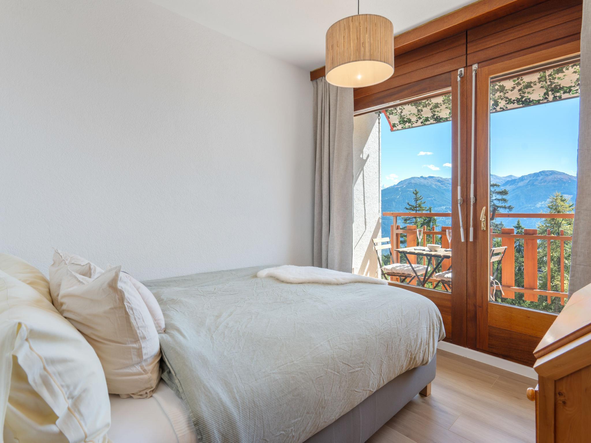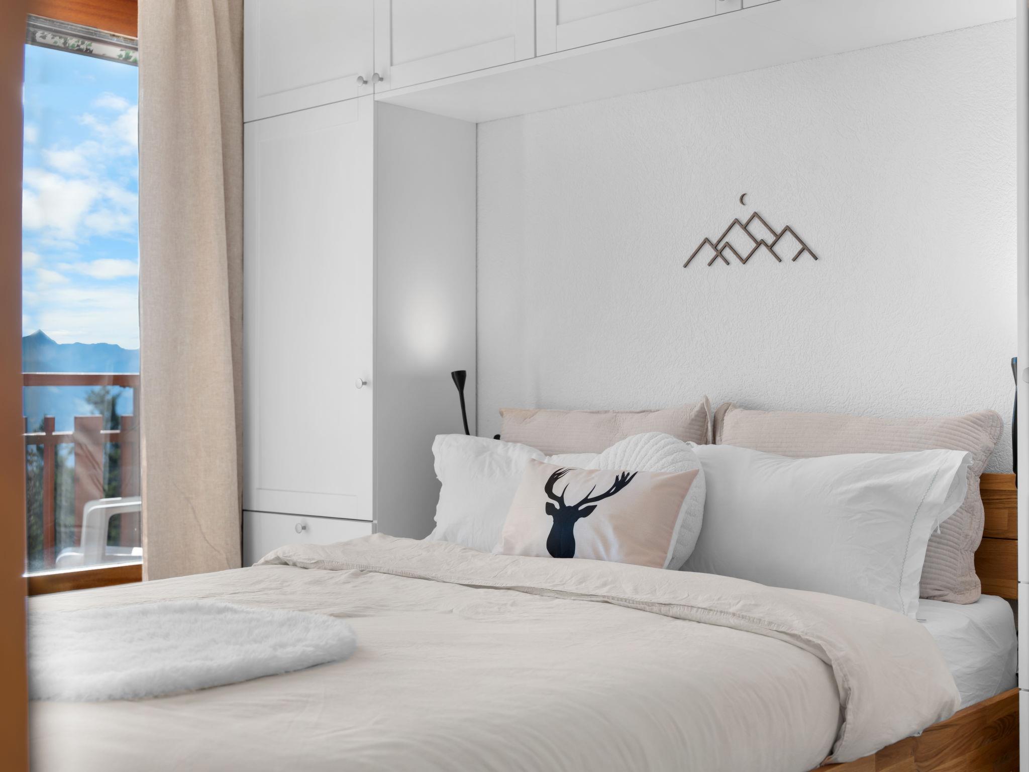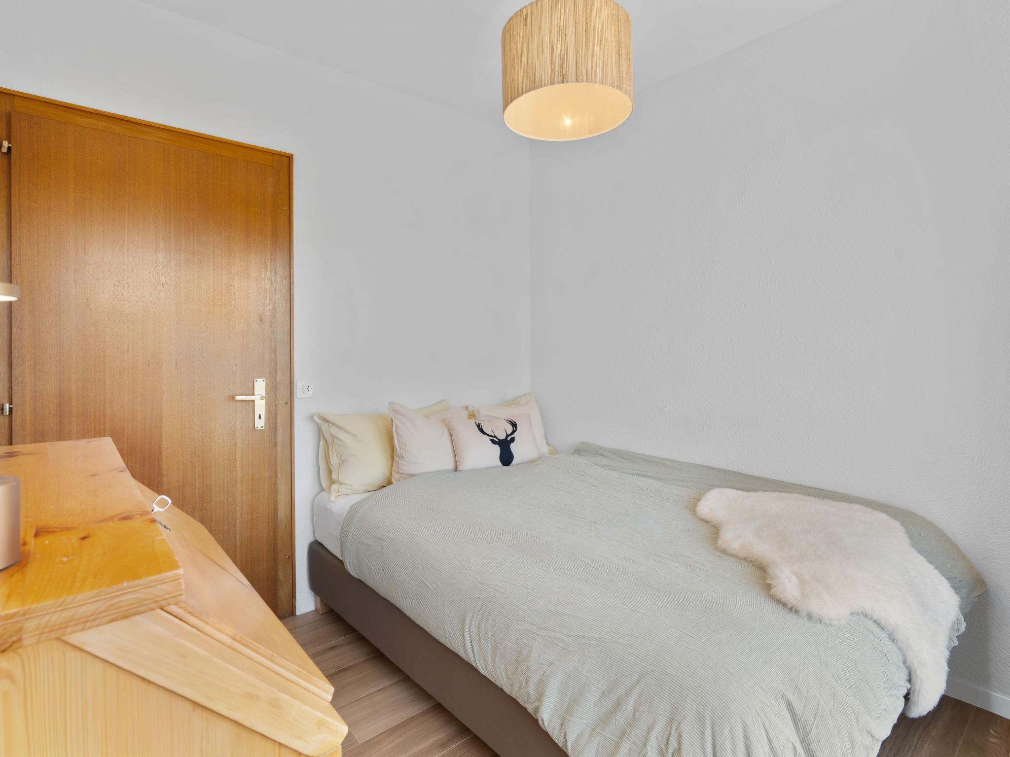"La Forêt ouest C120", 3-room apartment 53 m2 on 3rd floor. Bright, renovated in 2025, comfortable and cosy furnishings: living/dining room with separate WC and cable TV. Exit to the balcony. 1 room with 1 french bed (140 cm, length 200 cm). Exit to the balcony. 1 room with 1 french bed (160 cm, length 200 cm). Exit to the balcony. Small, open kitchen (oven, dishwasher, 4 induction hot plates, toaster, kettle, freezer, electric coffee machine, Capsules for coffee machine (Nespresso) extra, raclette grill, fondue Set (chinoise, cheese)). Shower/bidet/WC. 2 balconies, south facing position. Balcony furniture. Very beautiful view of the mountains, the countryside and the resort. Facilities: washing machine, iron, hair dryer. Internet (WiFi, free). Please note: non-smokers only.