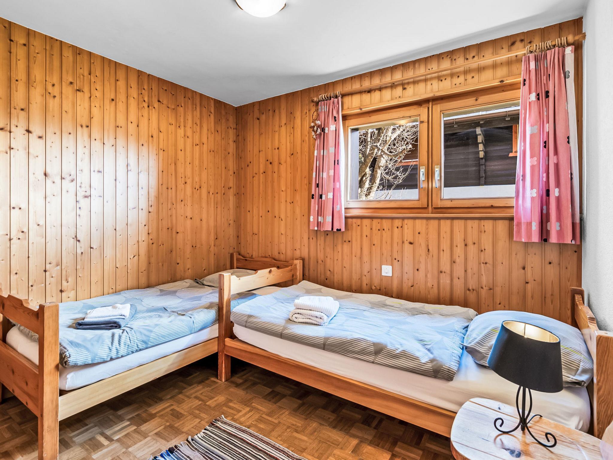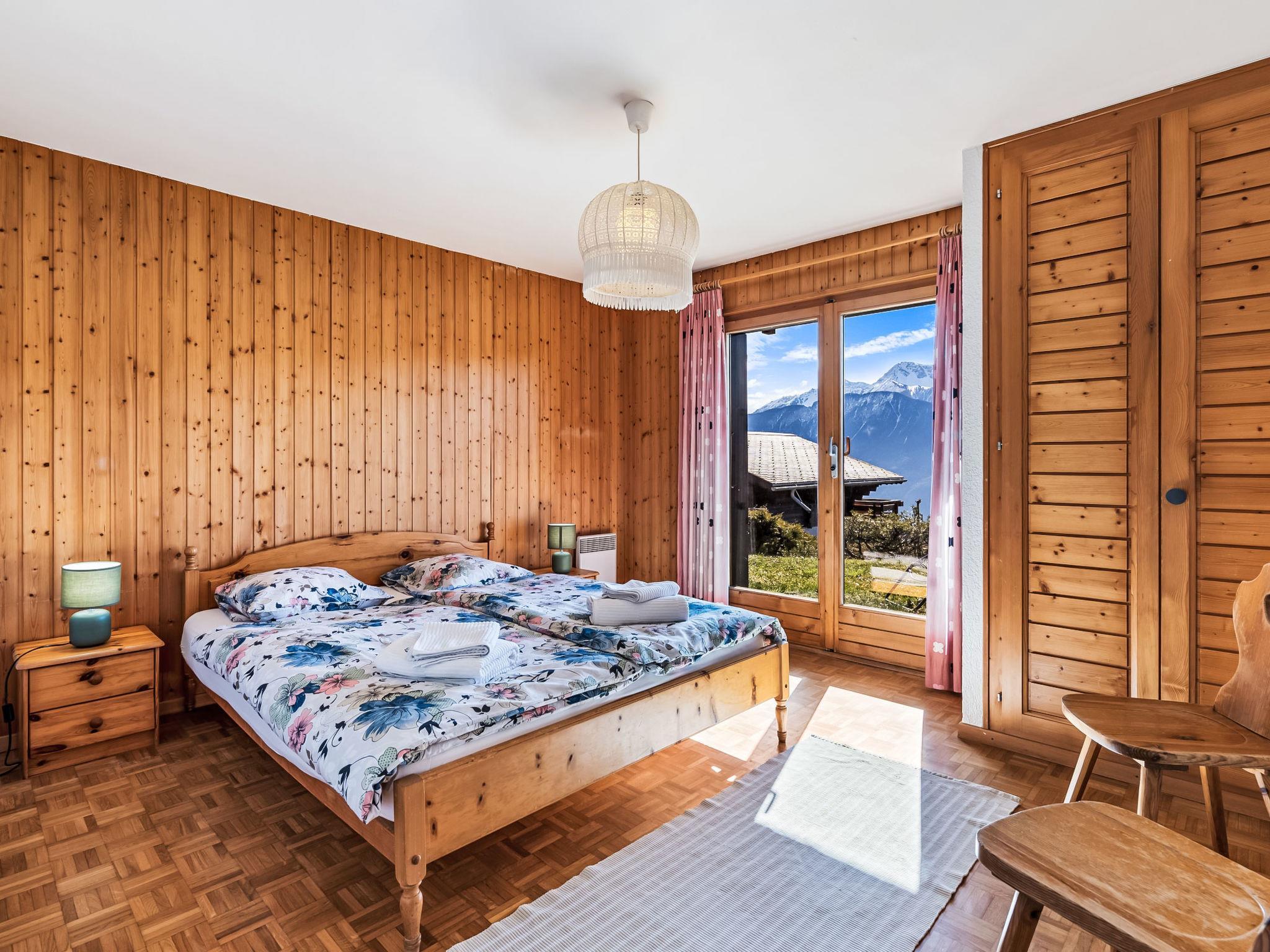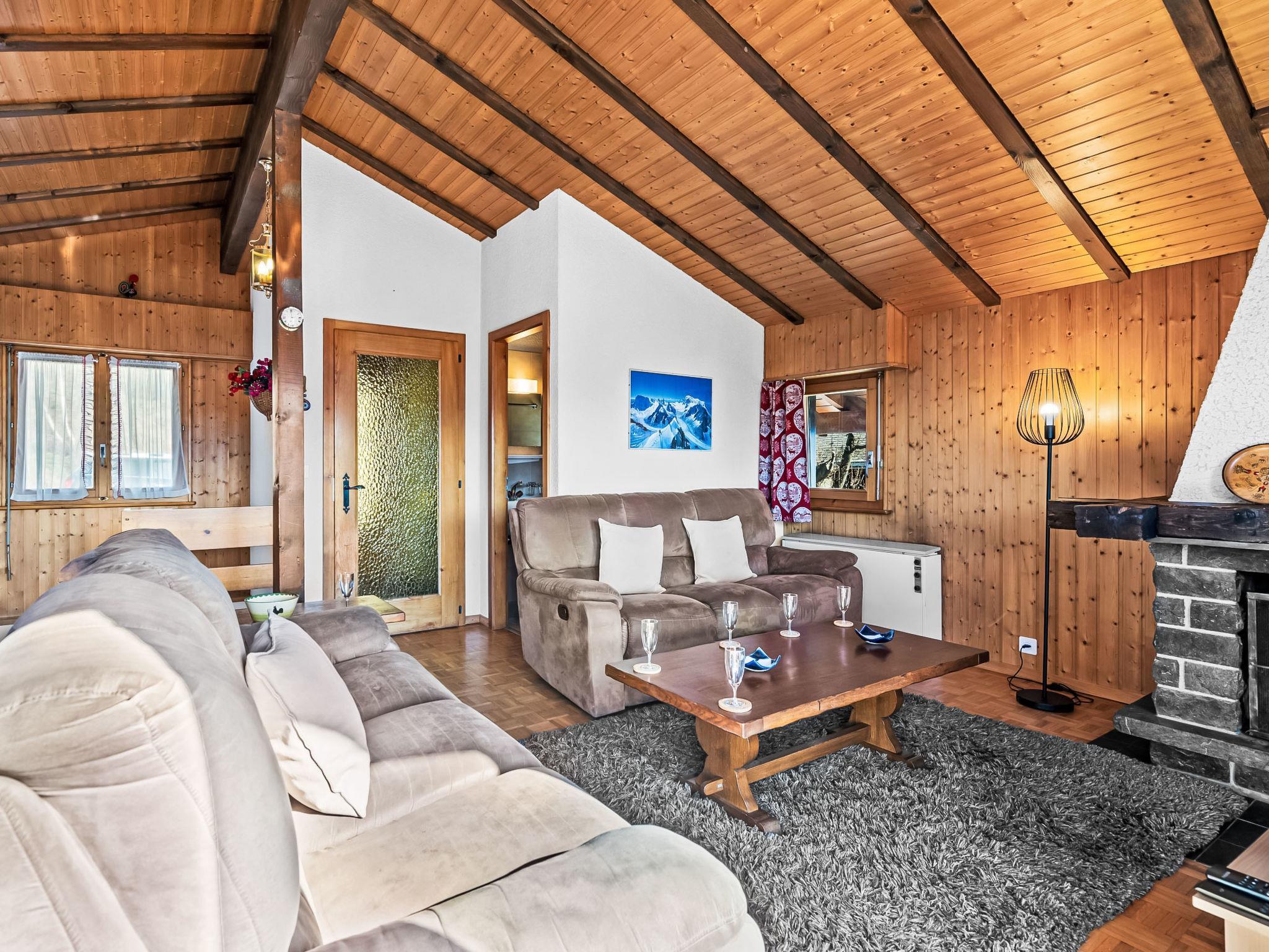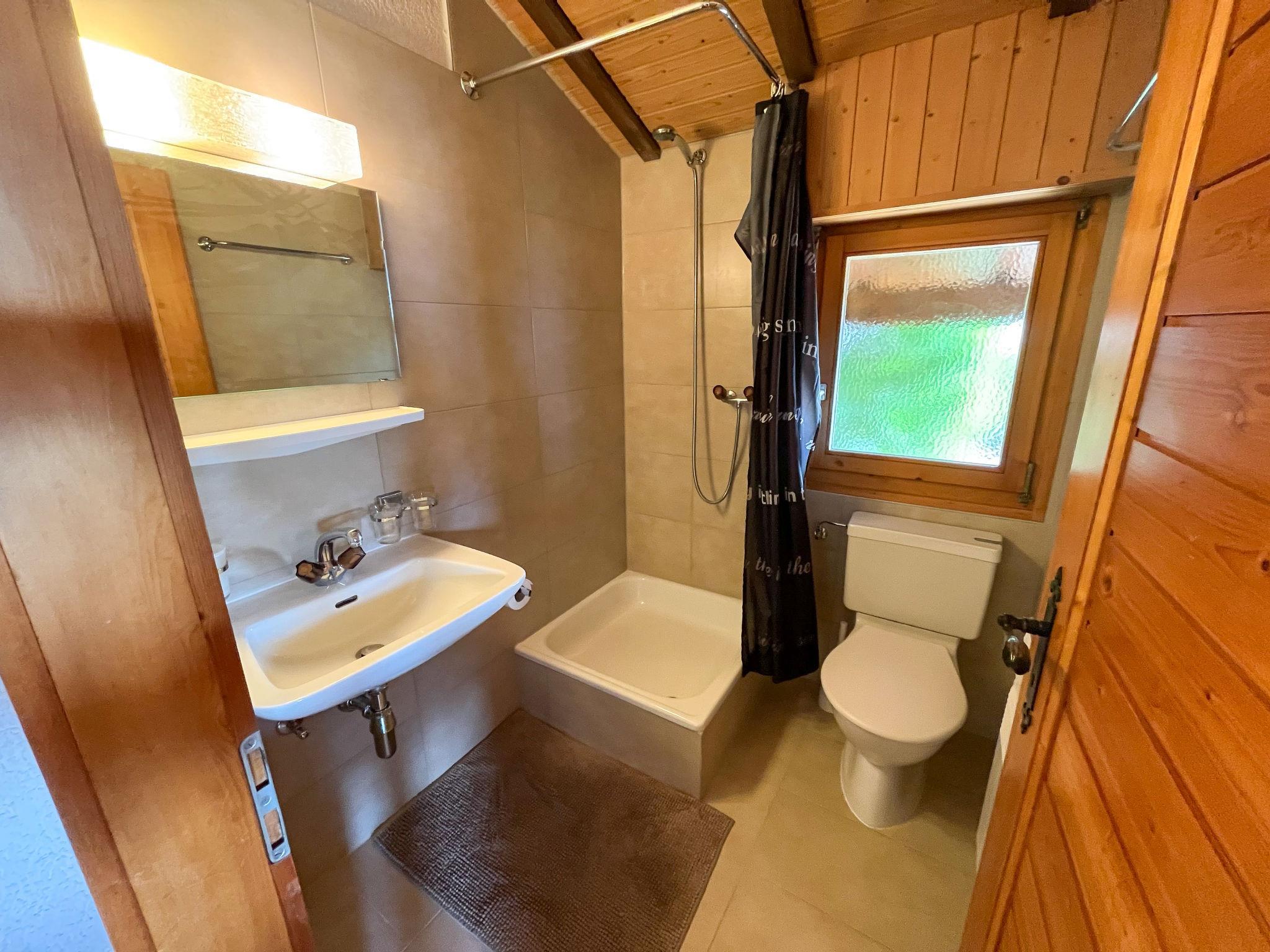 "Moulinettes 8", 4-room chalet 87 m2 on 2 levels. Living/dining room with sloping ceilings with open-hearth fireplace and cable TV (flat screen). Exit to the balcony, south facing position. Kitchenette (oven, dishwasher, 4 ceramic glass hob hotplates, toaster, kettle, microwave, freezer, electric coffee machine, Capsules for coffee machine (NESPRESSO) extra, fondue Set (cheese)). Shower/WC. On the lower ground floor: 1 room with 2 beds (90 cm, length 190 cm). Exit to the garden, south facing position. 1 room with 1 french bed (160 cm, length 200 cm). Exit to the garden, south facing position. 1 room with 2 beds (90 cm, length 190 cm). Bath/WC. Lawn. Terrace furniture, deck chairs (2). Beautiful view of the mountains and the valley. Facilities: washing machine, iron, hair dryer. Internet (WiFi, free). Please note: non-smokers only.