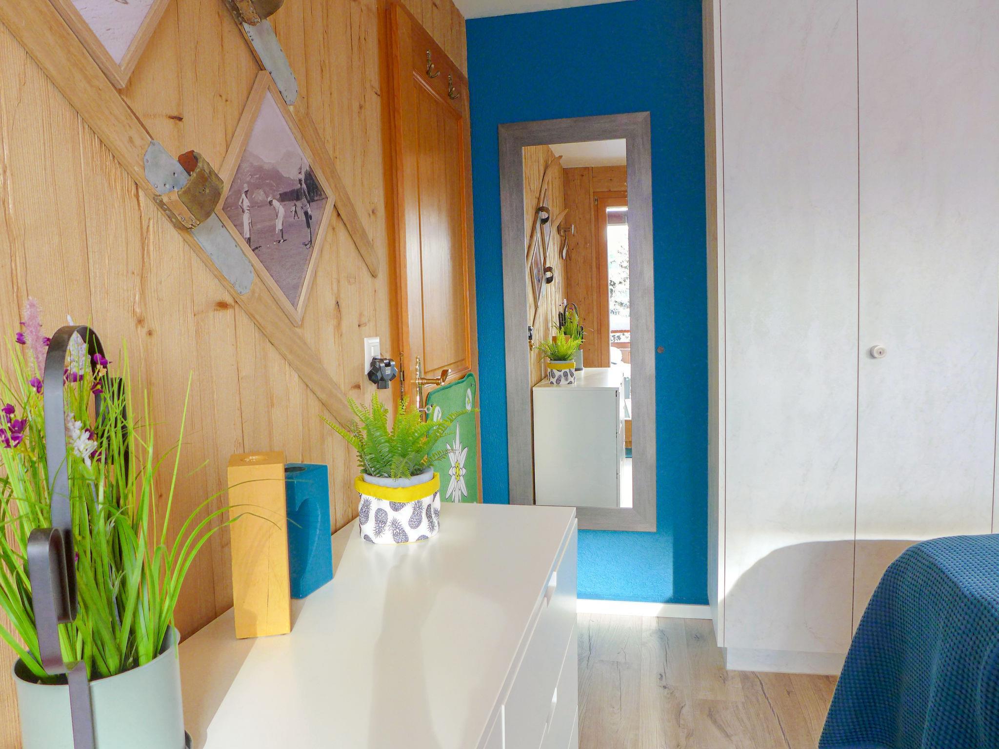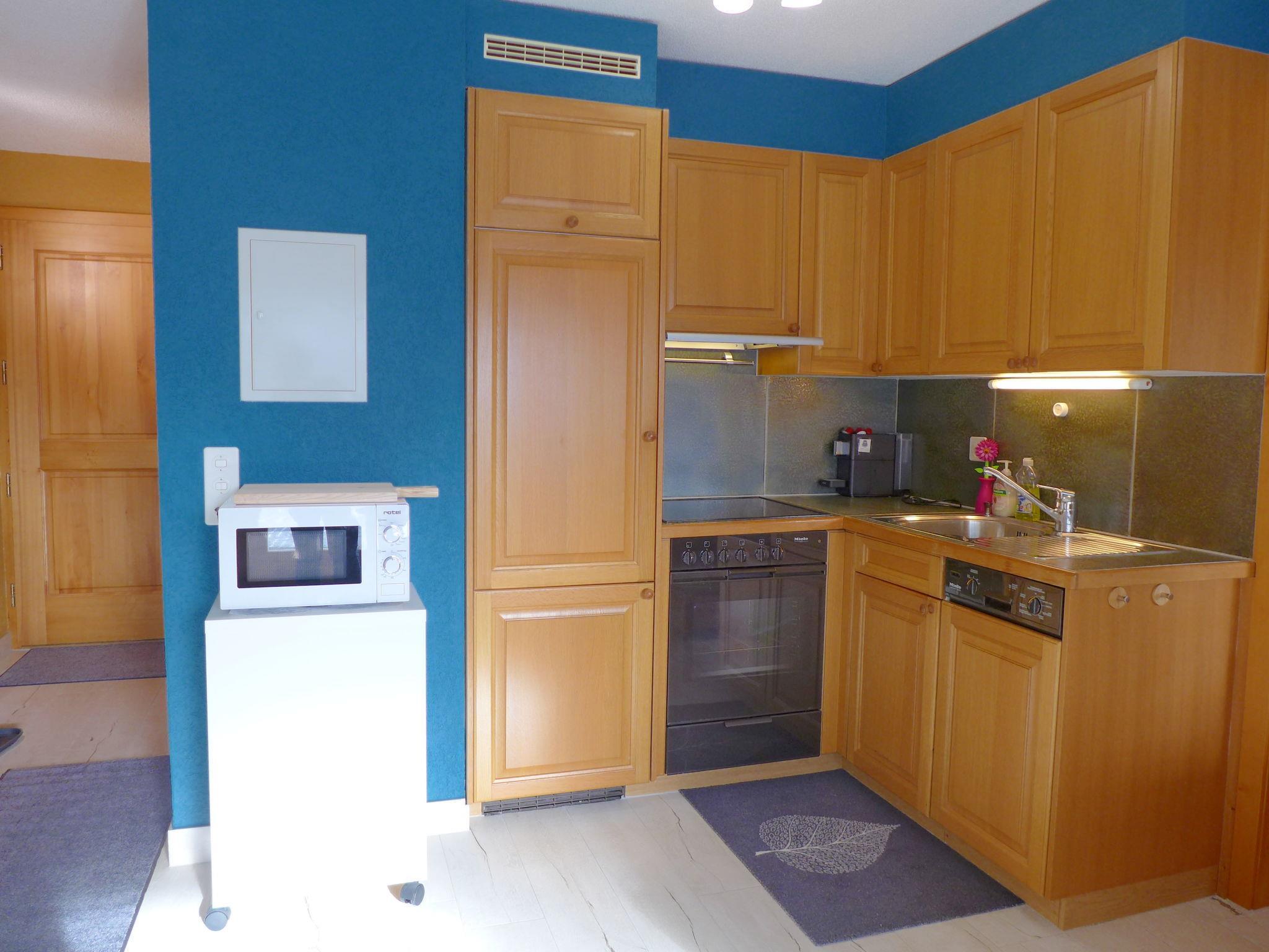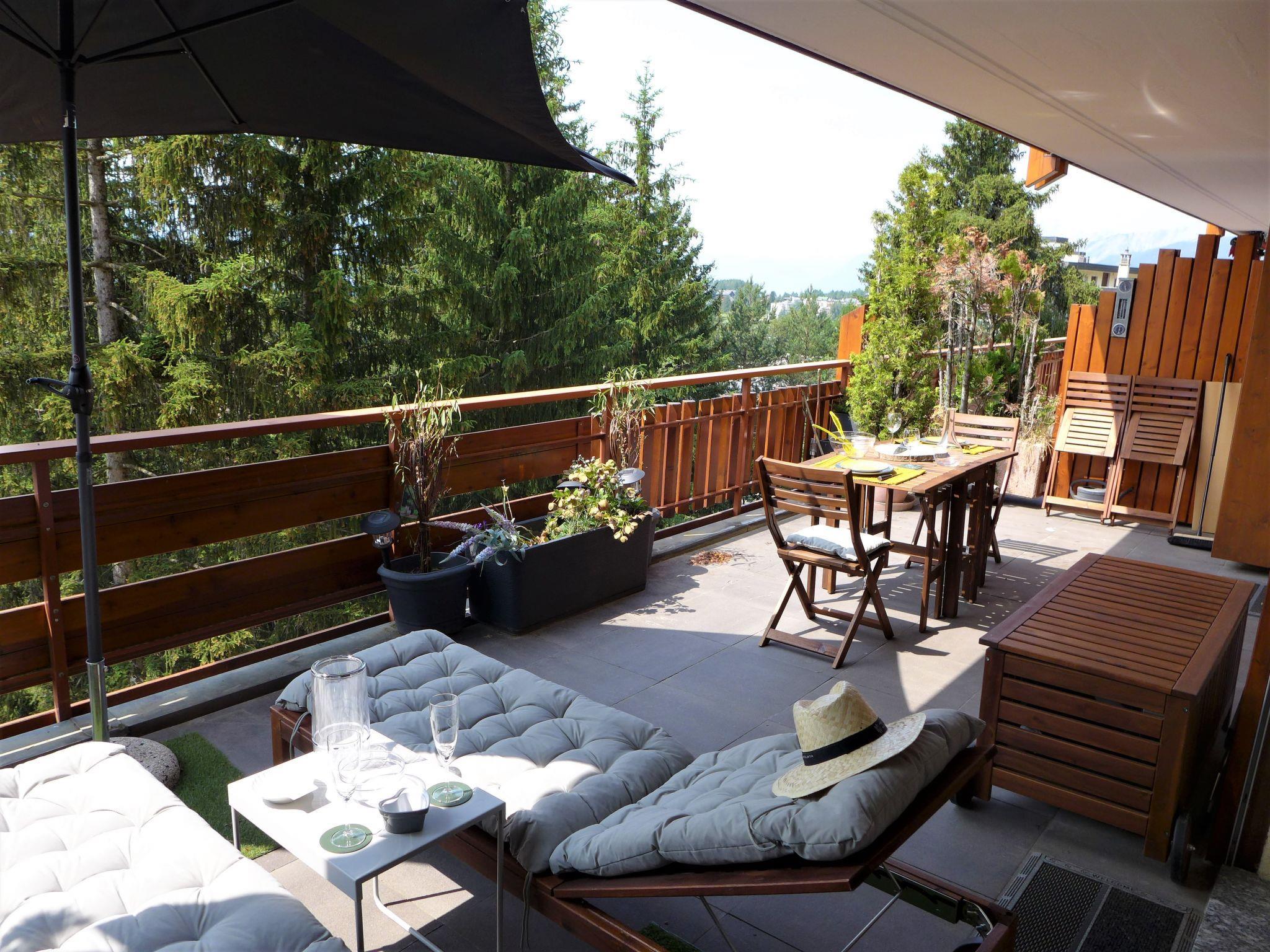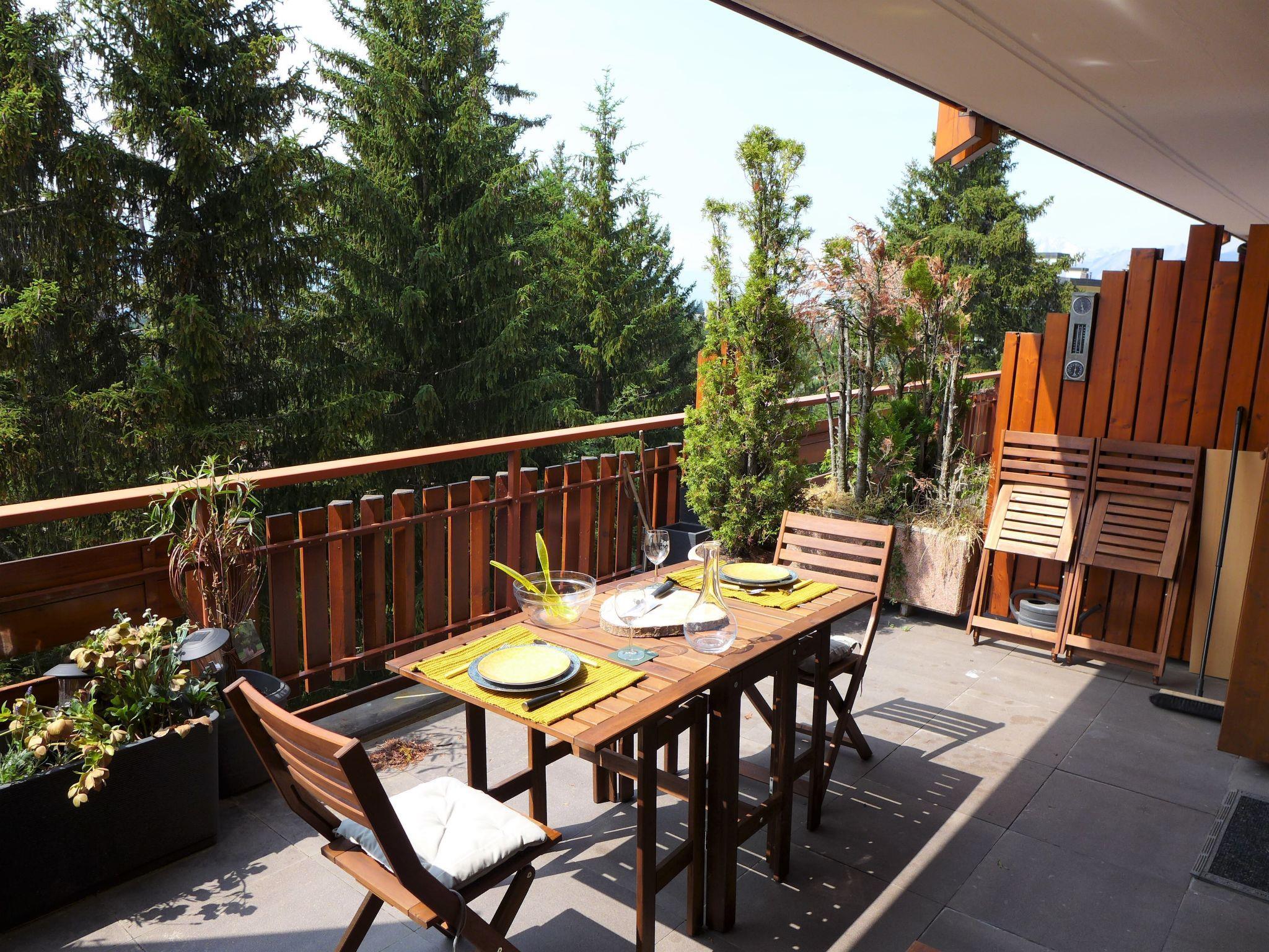 "Résidence Byblos 11", 2-room apartment 46 m2 on 1st floor. Fully renovated in 2022, comfortable and tasteful furnishings: living/dining room with cable TV. Exit to the balcony. 1 room with 1 double bed (2 x 80 cm, length 200 cm). Exit to the balcony. Open kitchen (oven, dishwasher, 4 ceramic glass hob hotplates, toaster, kettle, microwave, freezer, electric coffee machine, Capsules for coffee machine (Delizio) extra, raclette grill, fondue Set (chinoise, cheese)). Bath/WC. Large terrace 24 m2, south facing position. Balcony furniture, deck chairs (2). Beautiful view of the mountains and the forest. Facilities: iron, hair dryer. Internet (WiFi, free). Parking space n 11. Please note: non-smokers only. Maximum 1 small pet/ dog allowed.