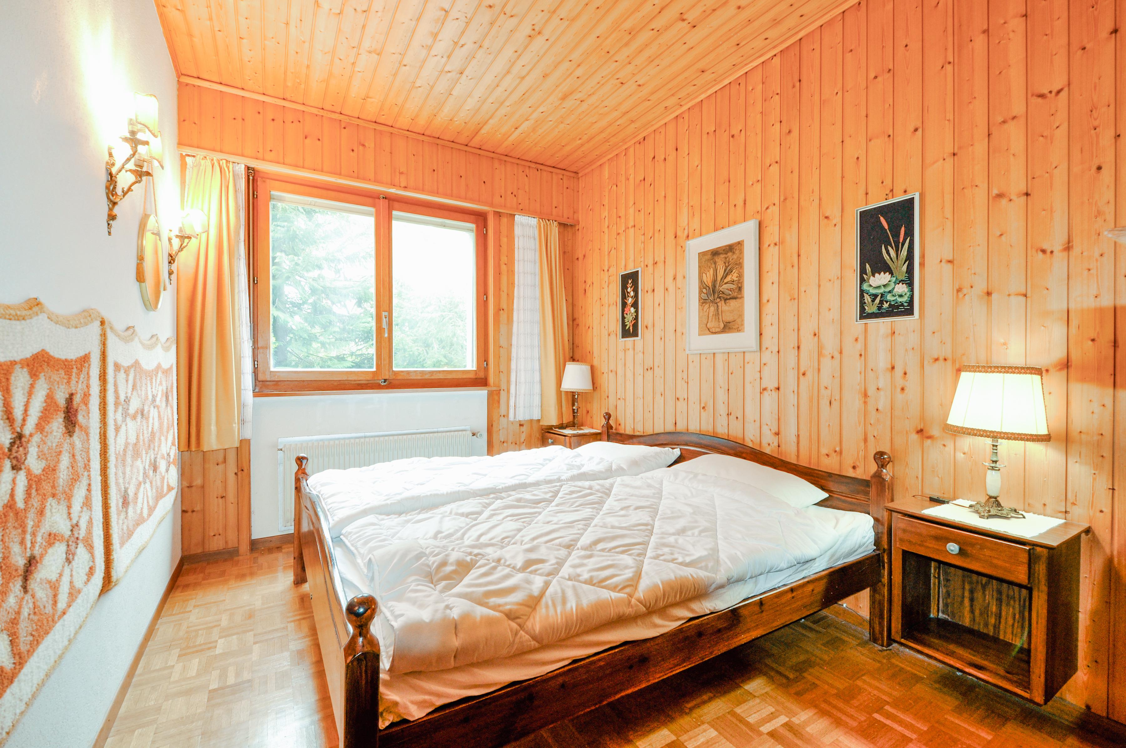 Haus: Großes regionaltypisches Chalet mit Schwimmbad und Sauna. . Schönes Wohnhaus mit 2 Ferienwohnungen und der fest bewohnten Wohnung des Vermieters. Gemütliche Chalet-Atmosphäre durch Holzvertäfelungen in vielen Räumen. Im Haus: großes Schwimmbad (10 x 4,50 Meter, 24°C, kostenfrei nutzbar) mit Ruheliegen vor großen Panoramafenstern, Sauna (Gebühr), Duschen, WC. Buchbar sind die untere Etage des Hauses (CH 361.018) und eine separate Wohnung im ersten Stock (CH 361.019). Das gesamte Haus für bis zu 14 Personen kann auch unter der Nummer CH 361.020 gebucht werden (separate Anzeige).
