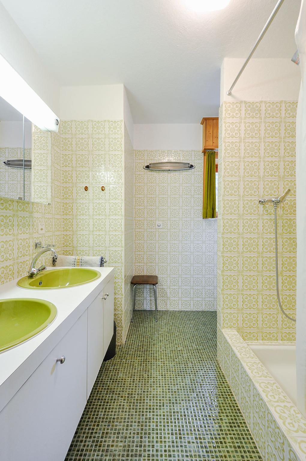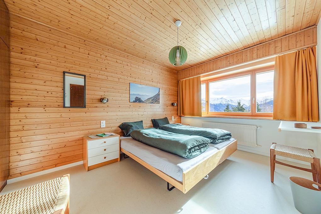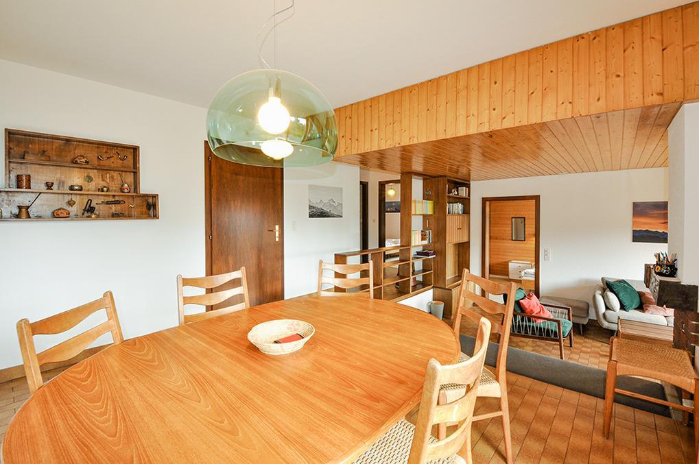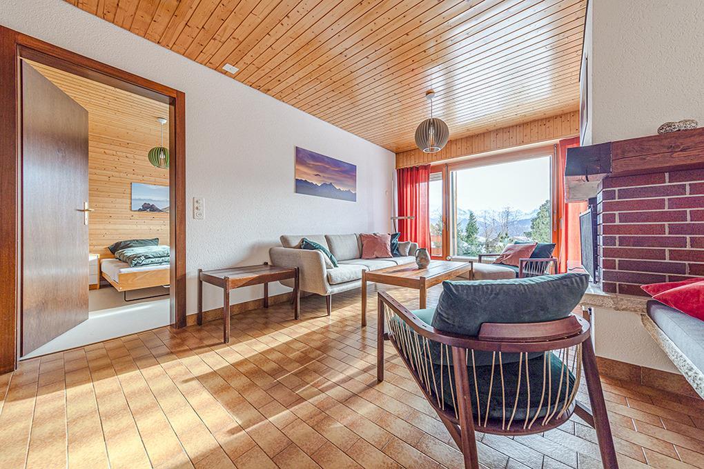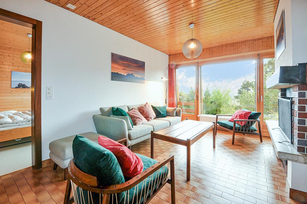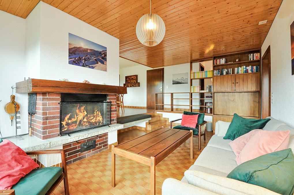 Ch 361.21 Wohnung 1-6 Pers.: 4-Zimmerwohnung mit 120 qm Wohnfläche, Parterre. Großzügiger Wohnraum (50 qm) über 2 Ebenen mit Panoramafenstern, Sitzgruppe am Kamin, Kabel-TV, Esstisch, moderner Einbauküche (Backofen, Spülmaschine), Terrasse. Großes Doppelzimmer. Doppelzimmer. Bad: Dusche, 2 Wb. 2-Bettzimmer mit Etagenbett. Separates WC, Wb.