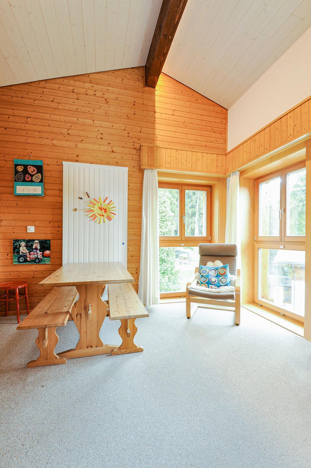 Haus: Sehr gepflegte Chaletwohnung mit Kamin. Regionaltypisches Ferienhaus mit zwei schönen Ferienwohnungen. Gemütliche, familiäre Chalet-Atmosphäre mit Holzvertäfelung in vielen Räumen. Offen gestaltete, sehr großzügige Architektur. Moderne Komfort-Ausstattung. Internetzugang kostenlos über W-Lan. Pellet-Zentralheizung. Nichtraucherhaus. Terrasse mit Sitzmöbeln. Kleiner Garten mit Sonnenliegen. Garage für einen kleinen Pkw. 2 weitere Pkw-Stellplätze am Haus.