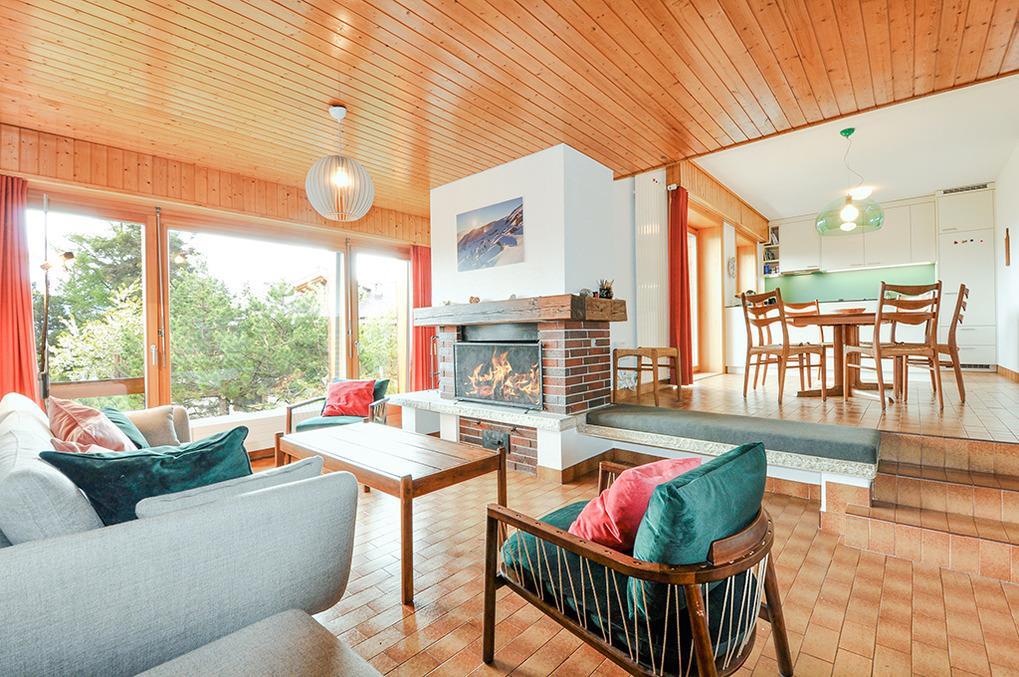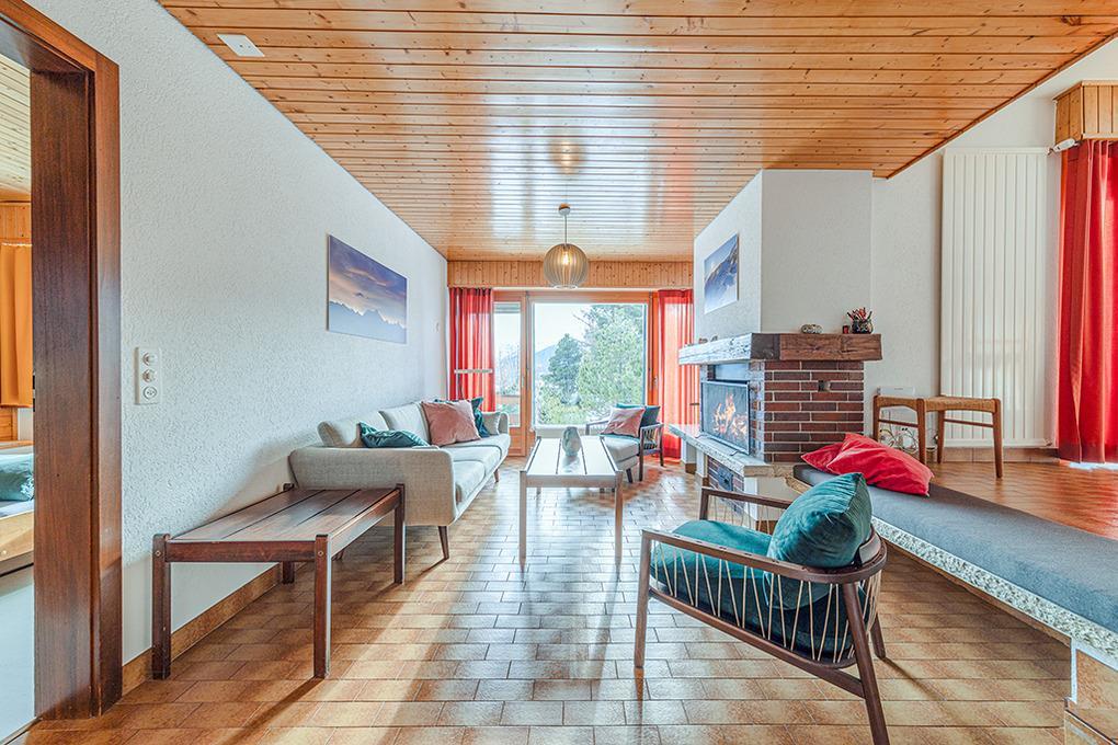 Ch 361.22 Wohnung 4-11 Pers.: 5-Zimmerwohnung mit 150 qm Wohnfläche über 2 Etagen. Parterre: Großzügiger Wohnraum (50 qm) über 2 Ebenen mit Panoramafenstern, Sitzgruppe am Kamin, Kabel-TV, Esstisch, moderner Einbauküche (Backofen, Spülmaschine), Terrasse. Großes Doppelzimmer. Doppelzimmer. Bad: Dusche, 2 Waschbecken. 2-Bettzimmer mit Etagenbett. Separates WC, Wb. 1. Etage (Zugang über Gemeinschaftsflur): Großes 5-Bettzimmer, ausgebaut bis zum Dachboden mit sehr schönem Blick, Einzelbett, Doppelbett, Etagenbett, eigenem Bad (Dusche, Wb, WC).