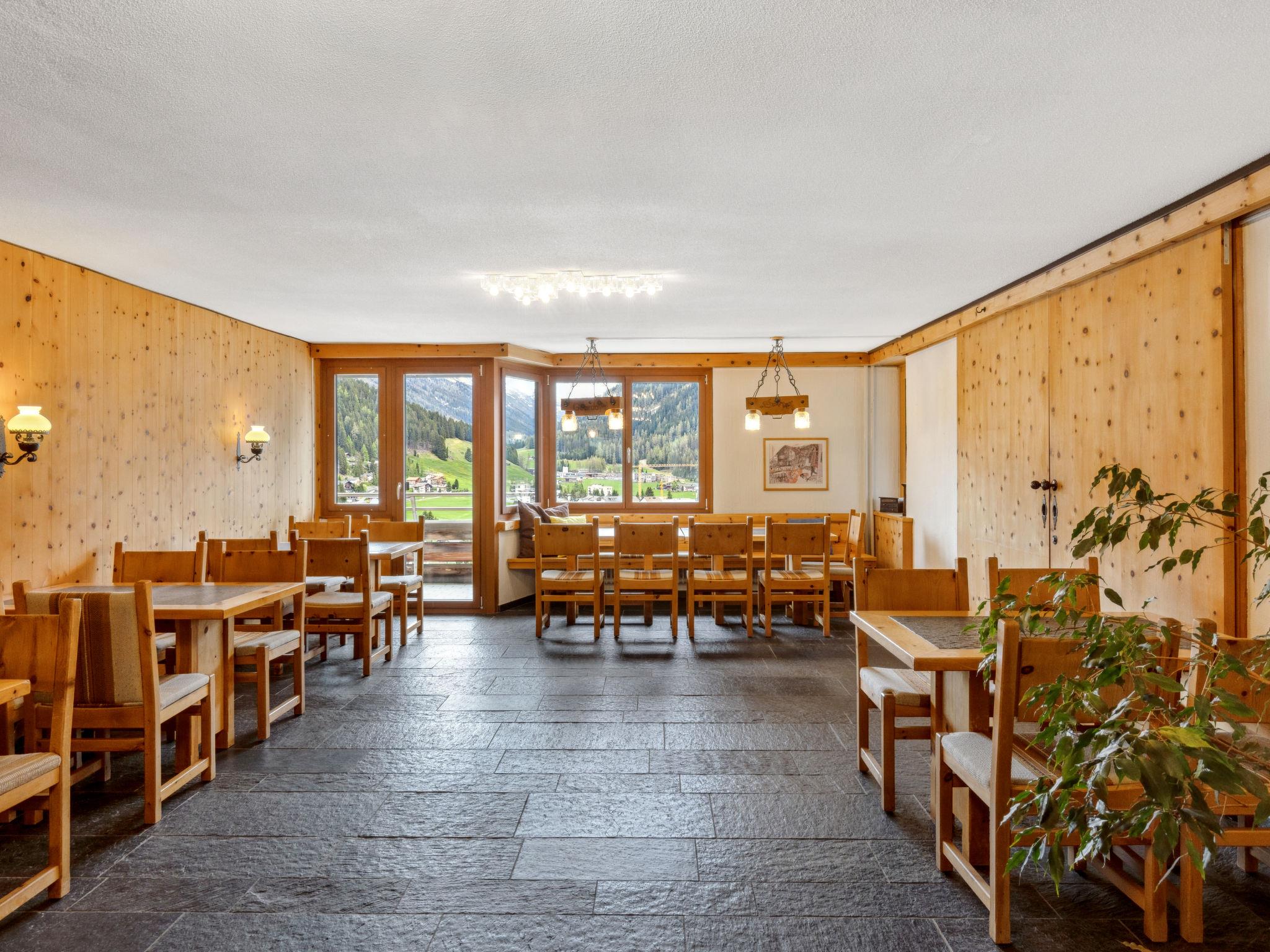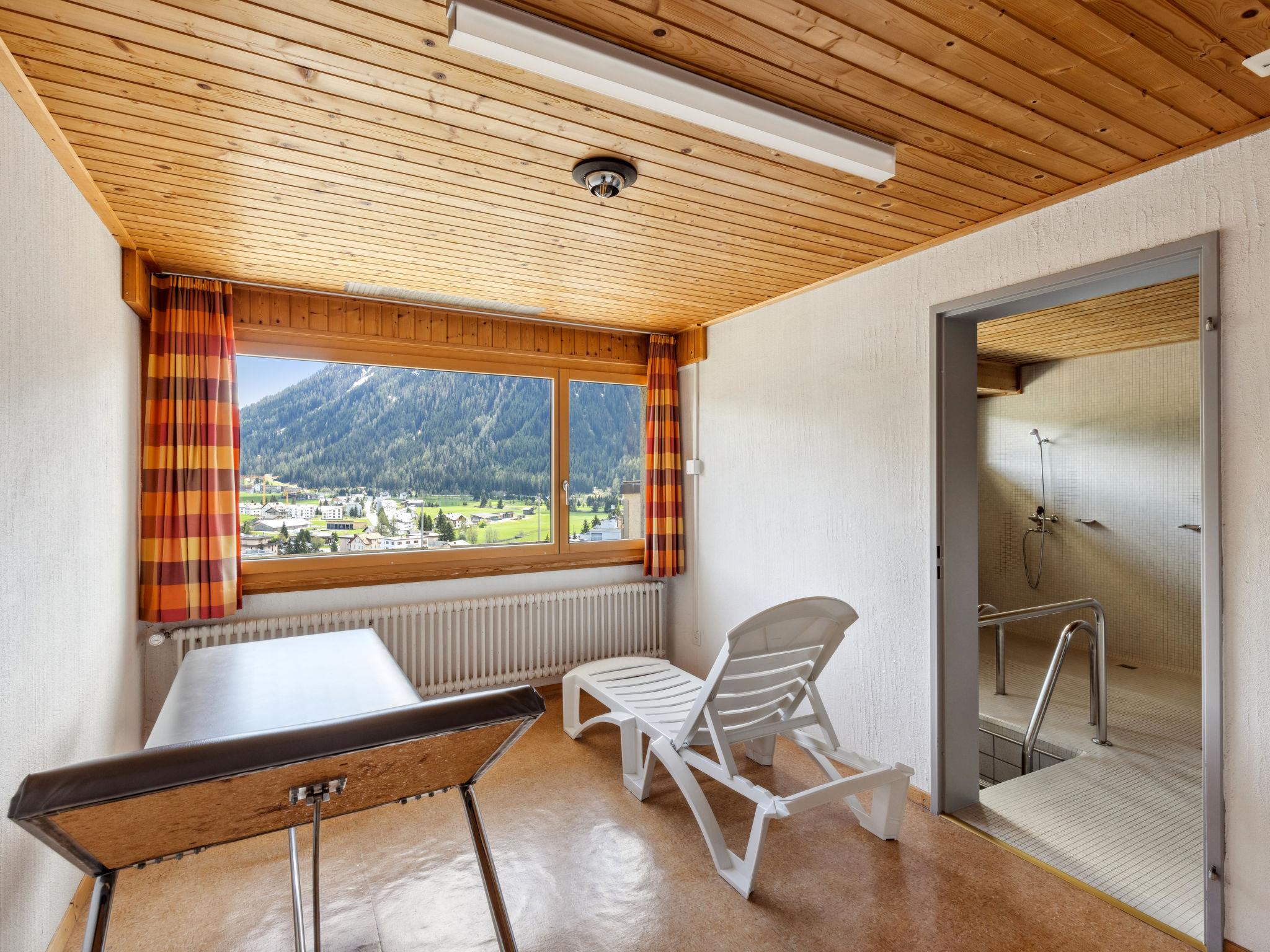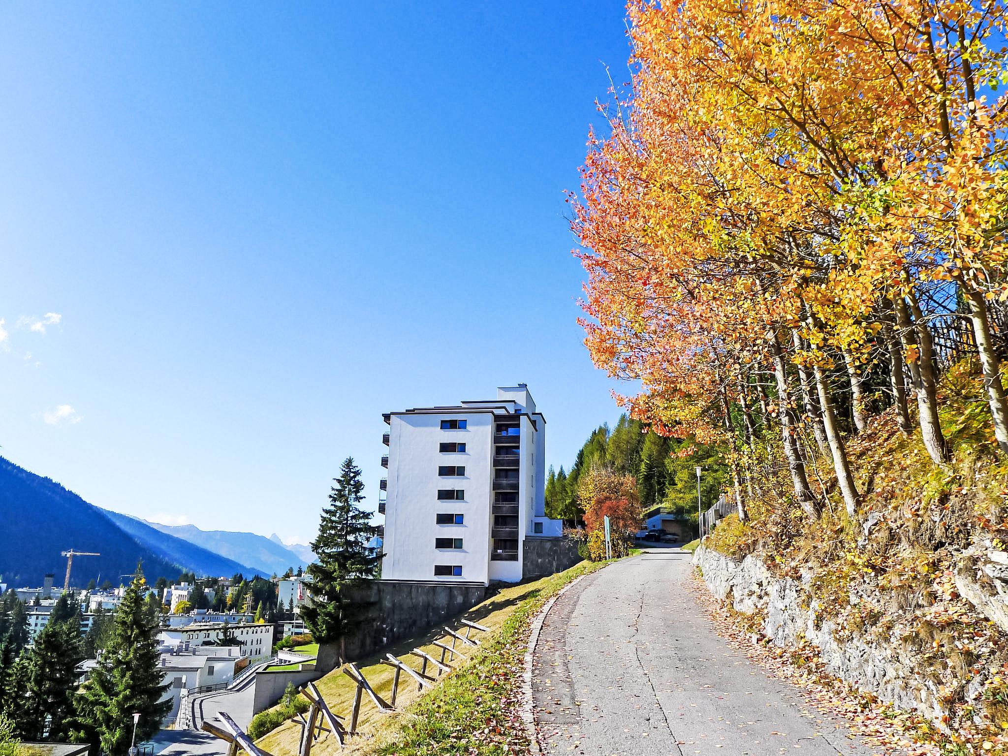 Davos: Apartment block "Guardaval (Utoring)". In the resort, in a central, quiet, sunny position on a slope, 1 km from the lake, 300 m from the skiing area. For shared use: indoor pool. In the house: reception, lounge with TV, WiFi, sauna (extra). Playroom, lift, storage room for skis, central heating system, washing machine (for shared use). Bread roll service and beverage service. Narrow motor access to the house. Roofed, parking (limited number of spaces, extra), communal covered parking (extra). Shop 300 m, restaurant 300 m, bus stop, railway station "Davos Dorf" 400 m, indoor swimming pool 1 km, bathing lake 1 km. Mountain railway, skisport facilities, slopes, ski school, sled run 1.5 km, cross country ski track, ice rink 300 m. Well-known ski regions can easily be reached: Parsenn 300 m, Jakobshorn 1.5 km. The building is located upstream of the resort of Parsenn mountain and offers beautiful view. Parking + garage (reservation on arrival).