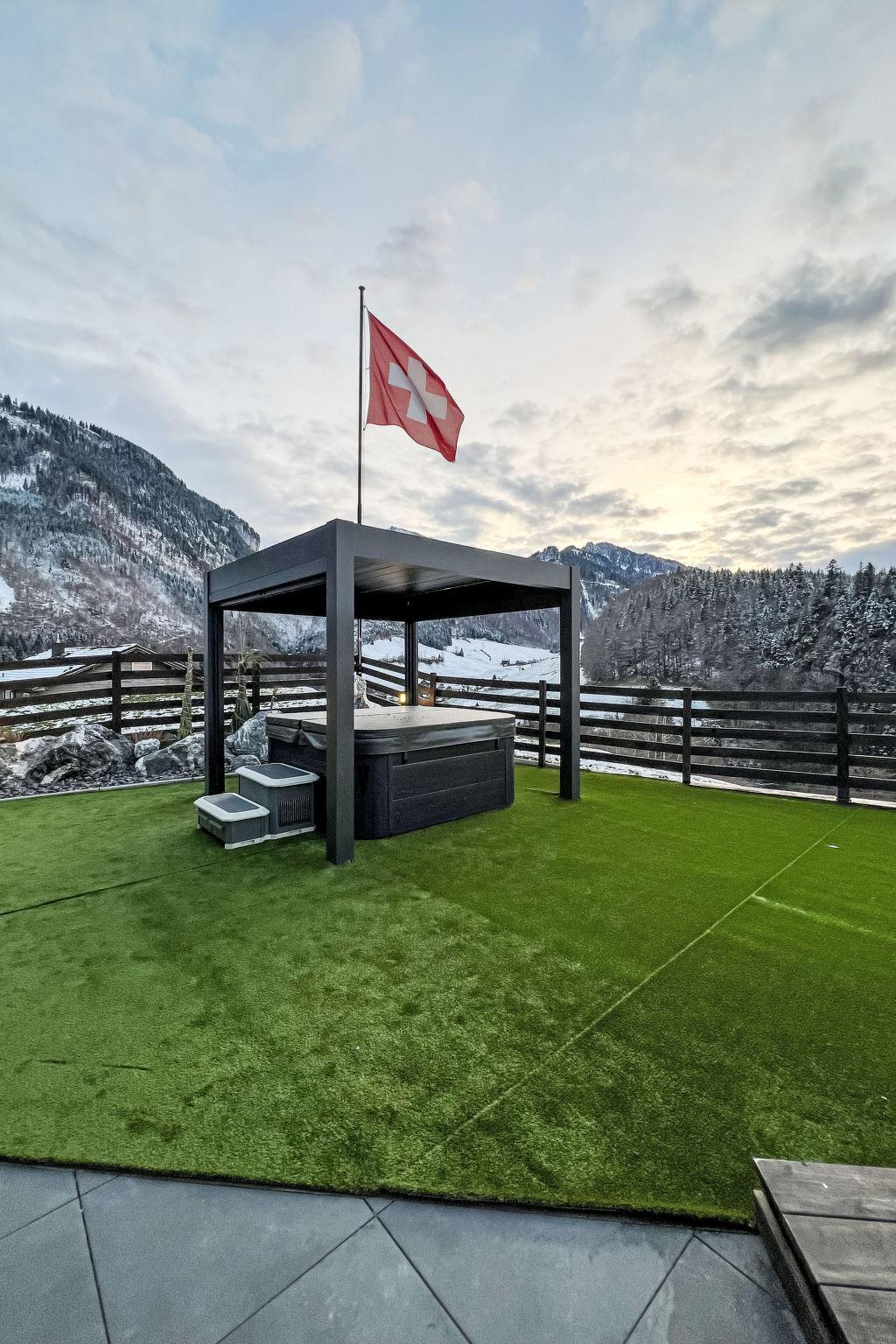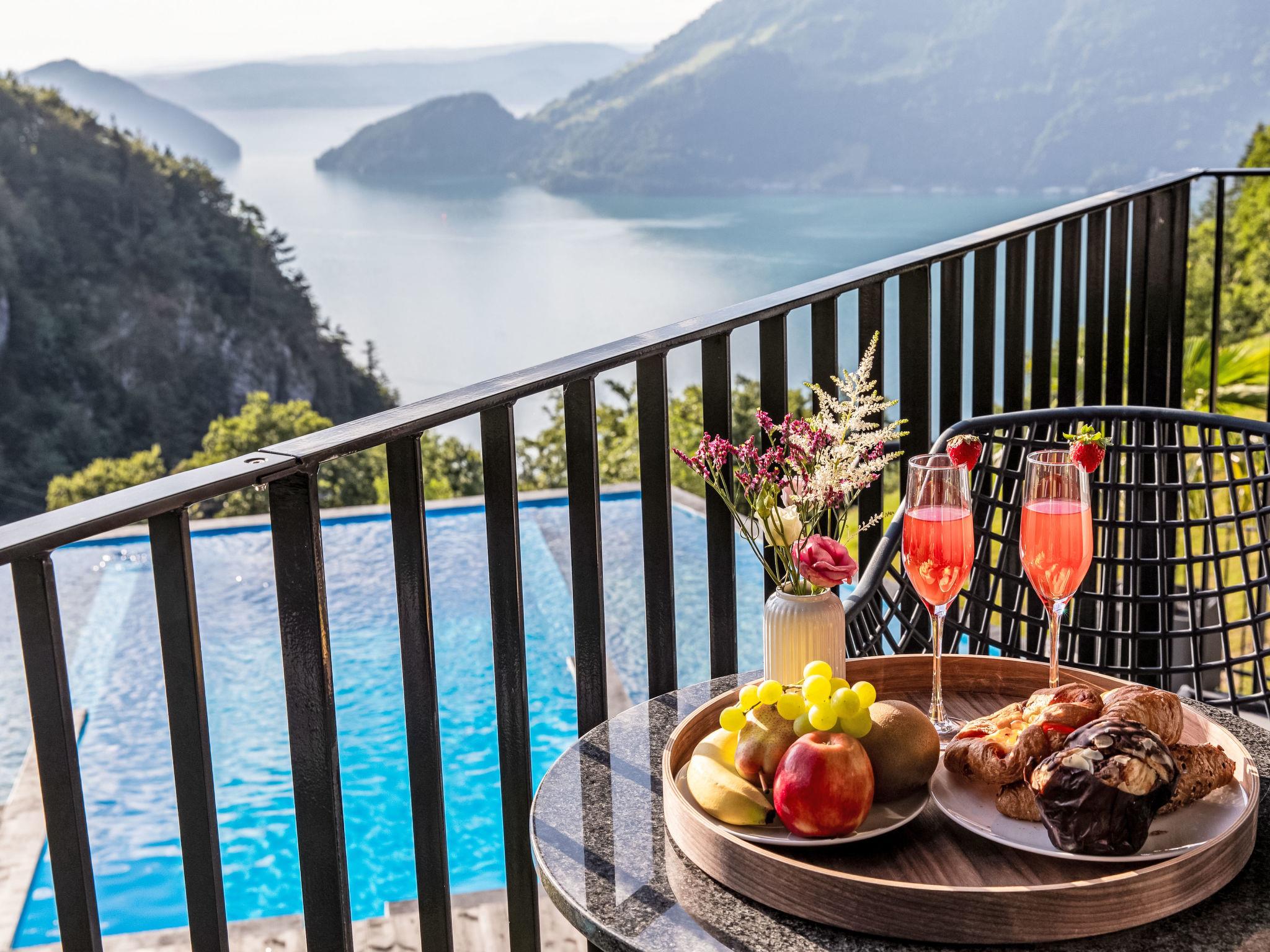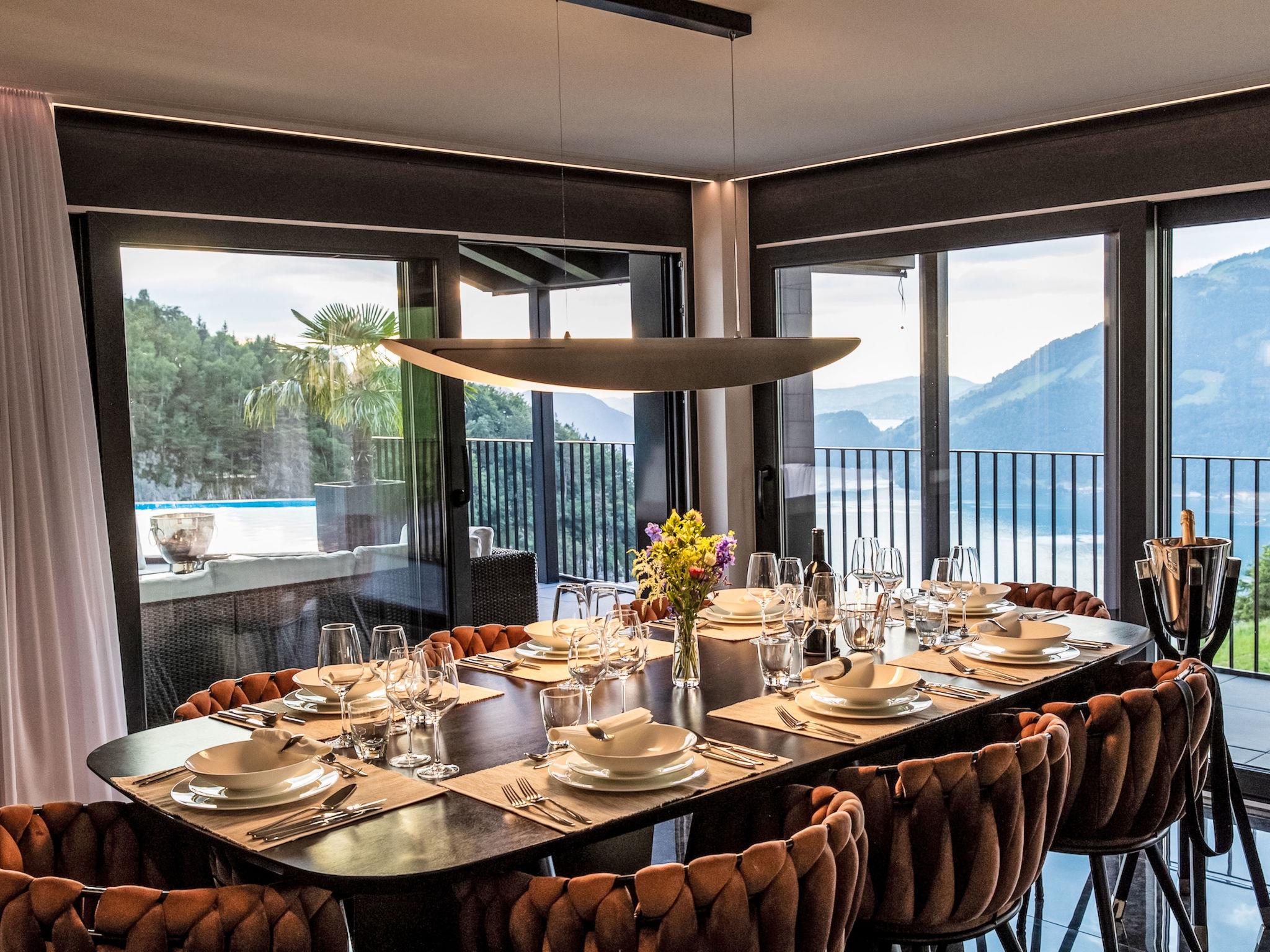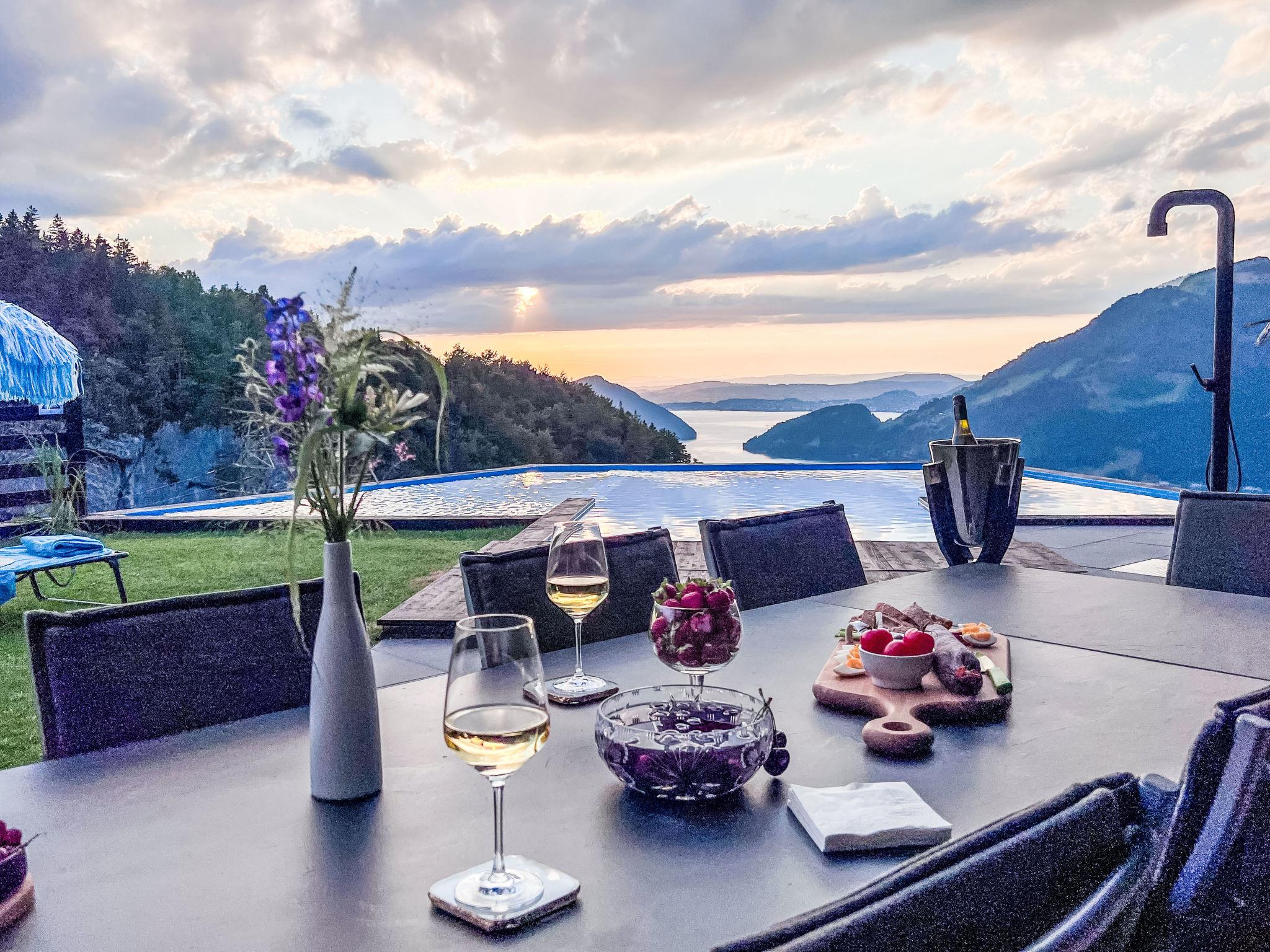 Luxury villa in the Swiss Alps at an altitude of 800 meters with panoramic views stretching all the way to the Black Forest. This elegant villa towers above the mystical Risleten Gorge, surrounded by untouched nature. Absolute tranquility. Absolute views. Absolute privacy. Comfortable villa "Tauris", 800 m a.s.l., detached, built in 1963, renovated in 2024. Above Emmetten, Risleten Gorge, in a secluded, quiet, elevated position, 7 km from the lake, 2 km from the skiing area. Private: property 700 m2 (fenced), garden 100 m2, swimming pool (3 x 7 m, depth 150 cm, seasonal availability: 01.Jan. - 31.Dec.) with alarm system. Hot tub, nat. Swimm. Pond, barbecue. In the house: sauna, fitness room. Parking (for 6 cars) at the house, single garage. E-charging station. Bus stop 900 m, pebble beach 7 km. Skisport facilities 2 km. Nearby attractions: Rütli 6 km. The owner does not accept any youth groups.