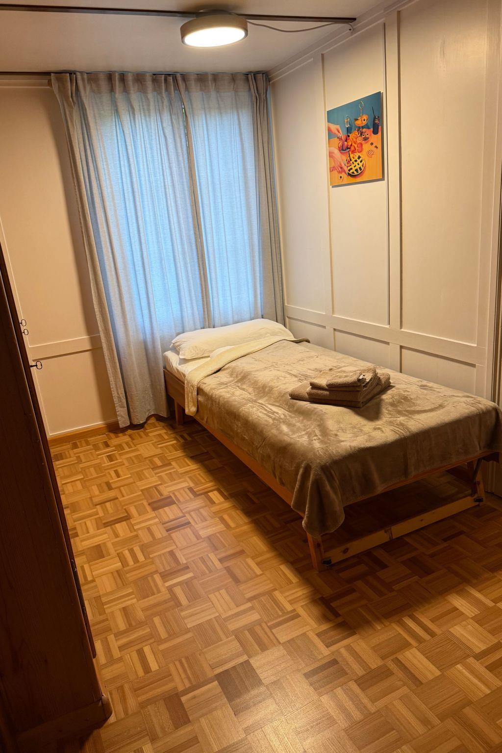 Outdoors, the private garden is a highlight for both children and adults. Apple trees, a swing, and climbable trees invite little adventurers to play, while grown-ups can enjoy relaxed evenings at the beautiful outdoor fireplace and grill. Though the house lies along a street, the garden feels sheltered and calm, with views of the surrounding mountains and quick access to the mountain forest.