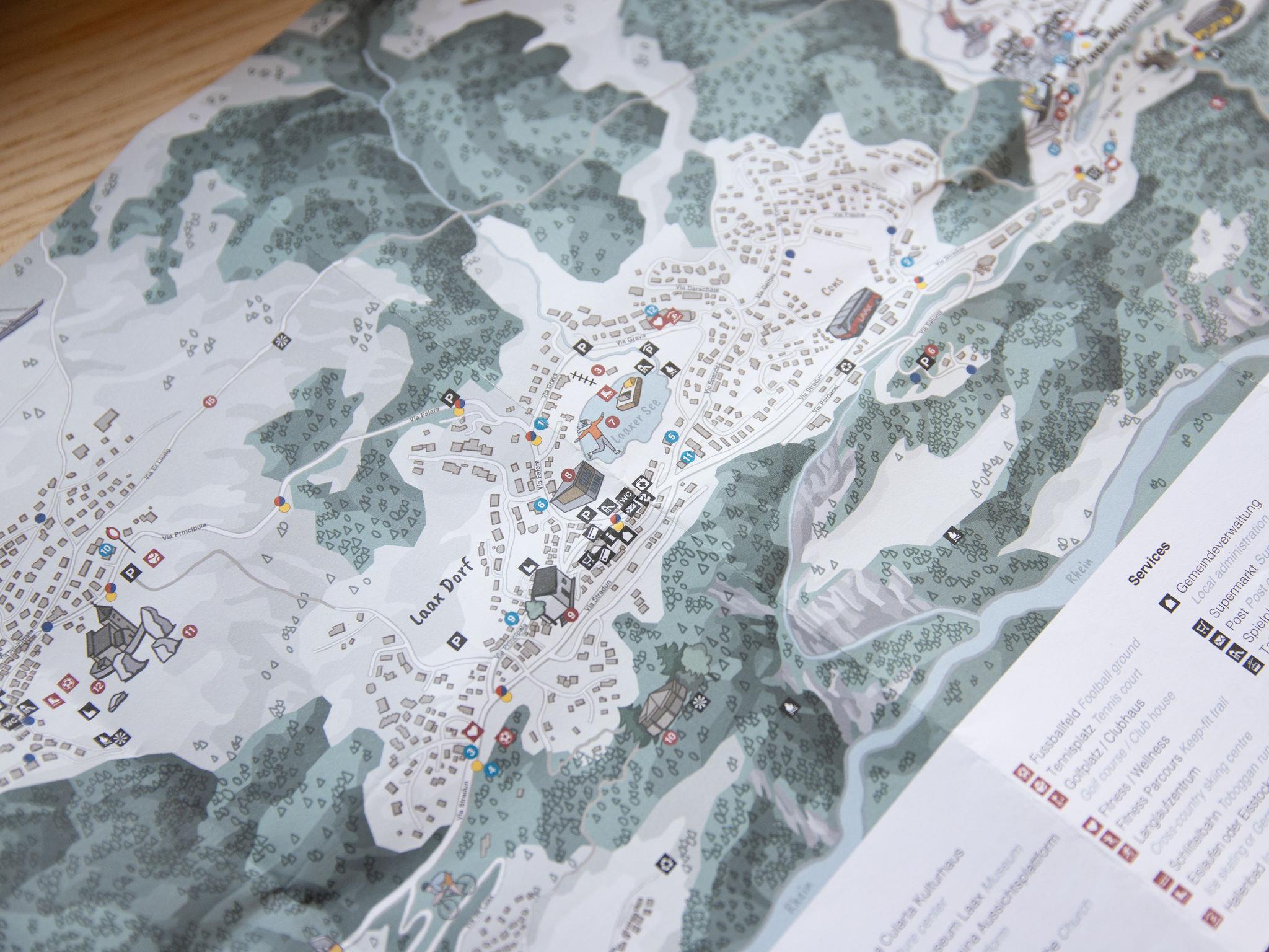 Falera 2 km from Laax: Child friendly, comfortable residence "La Siala", 1'200 m a.s.l., renovated in 2024. On the outskirts, in a quiet, sunny position, 900 m from the skiing area, south facing position. For shared use: property, lawn for sunbathing, indoor pool (seasonal availability: 01.Jul. - 15.Oct. and 15.Dec. - 31.Mar.). In the house: reception, in winter, use of sauna is included, table tennis, playroom, table football, lift, storage room for bicycles, storage room for skis, central heating system, washing machine, tumble dryer (for shared use, extra), drying room. Motor access to the house (mountain road). In Winter: please take snow chains, 4x4 car recommended in winter. Public parking 50 m extra. E-charging station. Grocery, restaurant 500 m, bus stop "Falera, Parcadi" 50 m, indoor swimming pool 2 km, bathing lake "Laaxer See" 2 km. Golf course (18 hole) 6 km, ski lift, chair lift, skisport facilities, slopes 900 m, ski bus stop 50 m, sled run 900 m, cross country ski track 6 km, ice rink, children's playground 500 m. Nearby attractions: Ruinalta/Rheinschlucht 6 km, Baumwipfelpfad Laax 2 km. Well-known ski regions can easily be reached: Weisse Arena Flims/Laax 900 m. Well-known lakes can easily be reached: Caumasee 6 km. Hiking paths: Unesco Welterbe Sardona, Ruinalta/Rheinschlucht, Planetenlehrpfad Falera-Laax-Falera.