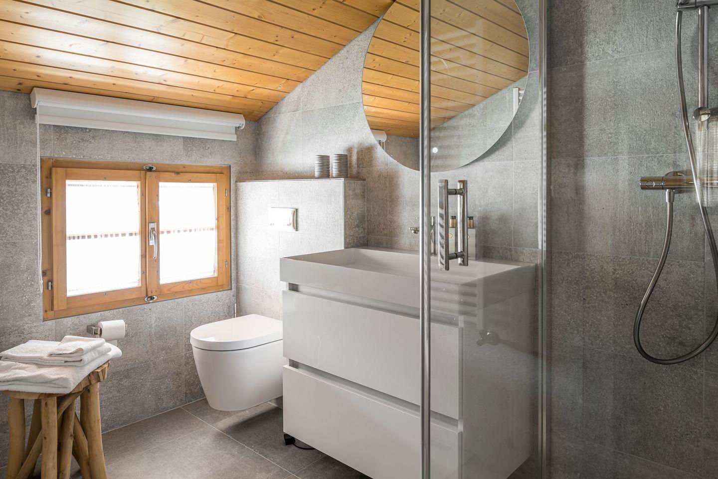 Im zweiten Stock gibt es drei Schlafzimmer und ein Badezimmer mit Dusche, WC, Waschbecken. Das geräumige Hauptschlafzimmer mit Doppelbett hat ein eigenes Badezimmer mit Waschbecken, Bad und WC und kleinem Balkon.