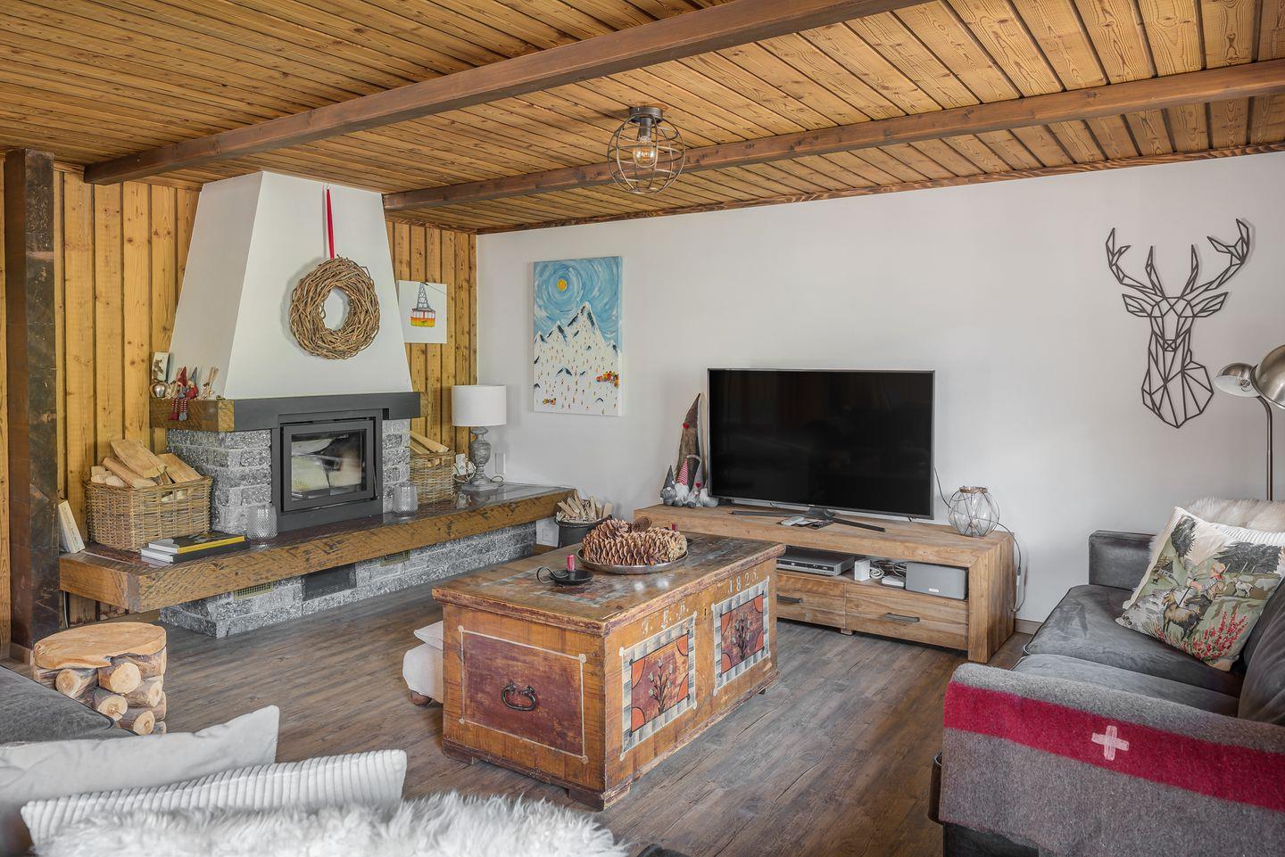Das Wohnzimmer ist attraktiv mit einem modernen Cheminéeofen ausgestattet und verfügt über einen Flachbildfernseher (55 Zoll mit Netflix) und Sonos Musiksystem. Es gibt einen großen Esstisch. In der Halle befindet sich eine separate Toilette.