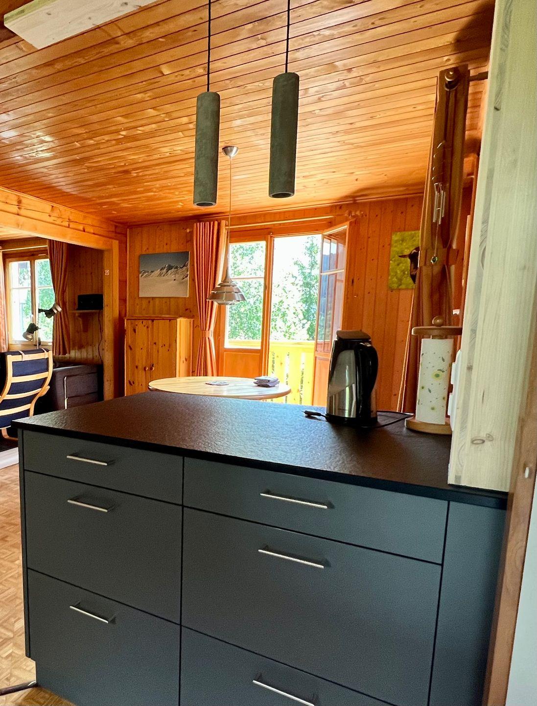 Das Chalet bietet Platz für 4 Personen. Die Küche und das Badezimmer mit WC/Dusche wurden im Frühjahr 2023 komplett renoviert. Die Küche ist mit einem Glas Keramik Kochfeld mit Dunstabzug ausgestattet und im Ofen ist eine Mikrowellenfunktion integriert. Eine Nespresso Kaffeemaschine ist ebenfalls vorhanden.