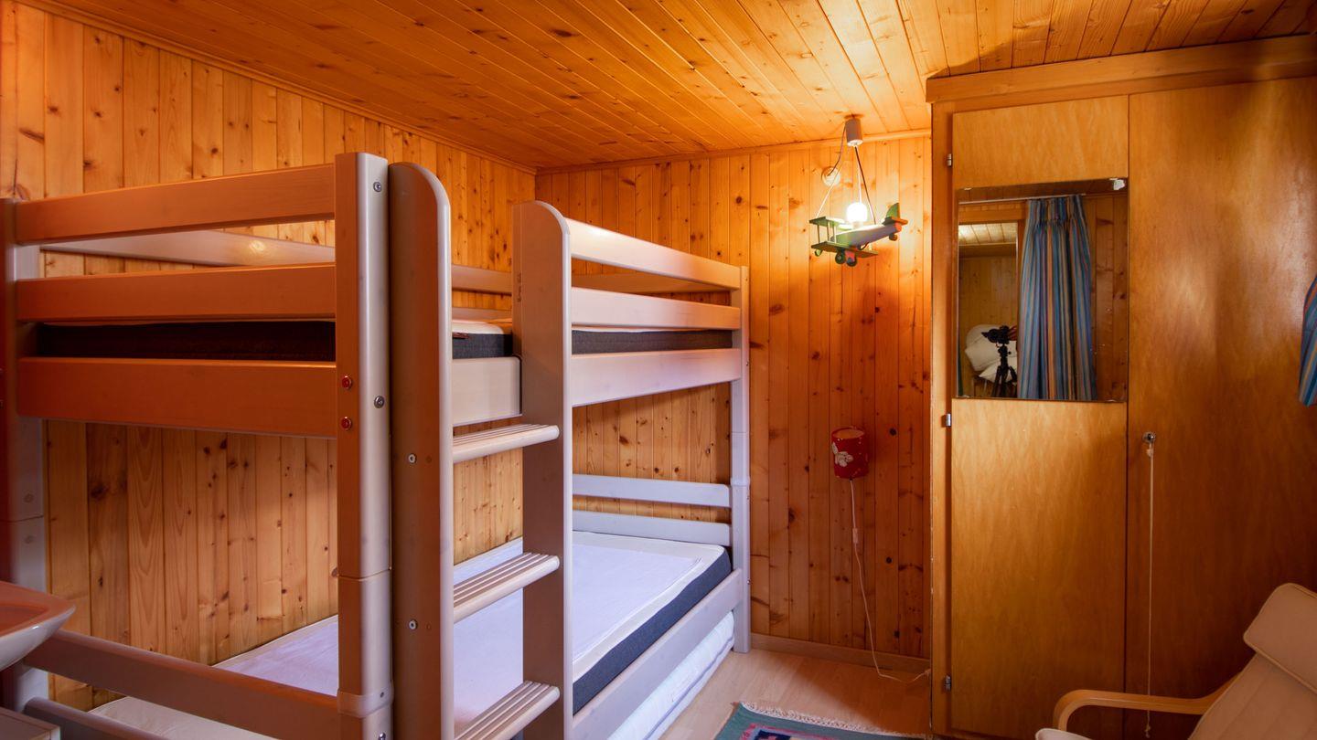 Untergeschoss: 1 Schlafzimmer mit modernem Etagenbett für 2 Personen und Lavabo im Zimmer; 1 Raum mit WC und Waschmaschine; Abstellraum. Das Untergeschoss hat eine eigene Eingangstür, wird aber auch erreicht über eine Lüke beim Esstisch (unsere Kinder lieben die Lüke und den eigenen Bereich, der diese bietet!).