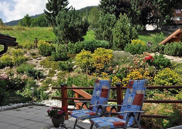 Große Terrasse am Eingang und eine sonnige Liegewiese laden zum Entspannen ein.