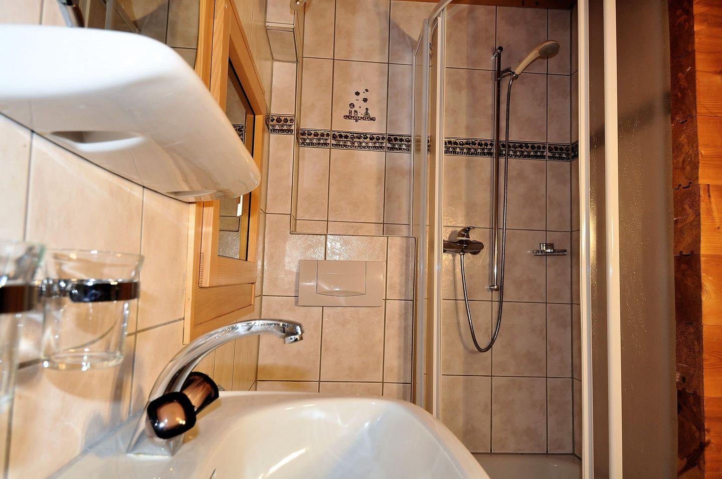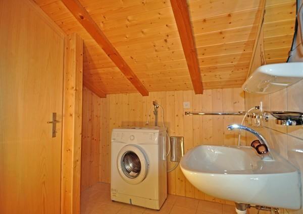 Obergeschoss: 1 Schlafzimmer mit 2 Betten, 1 Badezimmer mit Lavabo, WC; Dusche und Waschmaschine.