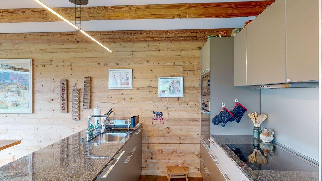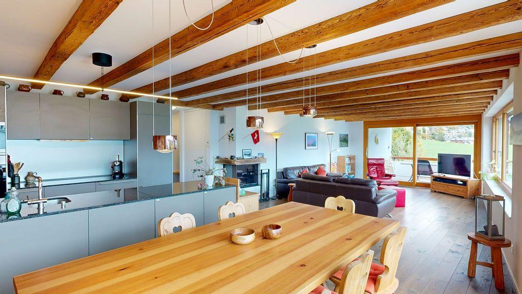 Der offene Wohn- und Essbereich mit Cheminée bietet einen sagenhaften Blick von Nord-Ost bis Süd-West. Gut ausgestattete Küche mit Keramikherd, Geschirsspüler, Backofen, Mikrowelle und Nespresso-Kaffeemaschine. Hochwertige Ausstattung mit Parkettboden in der ganzen Wohnung.