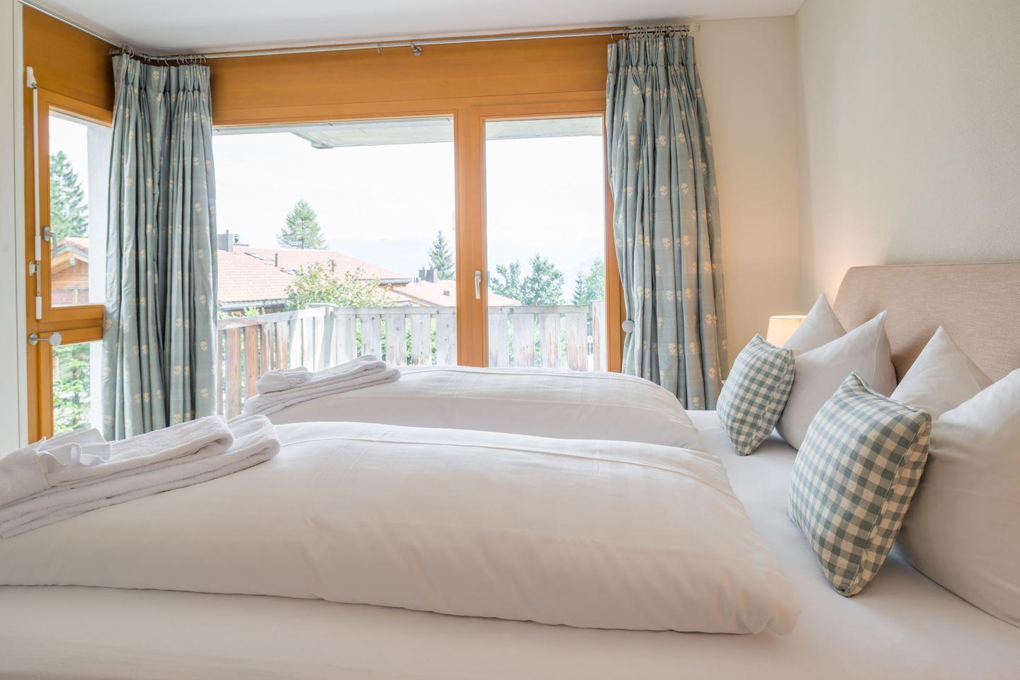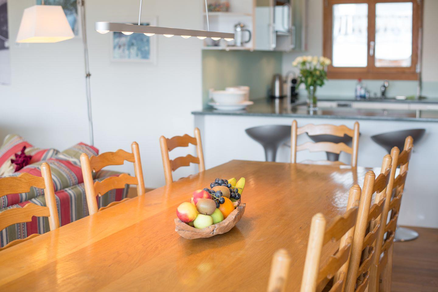Die luxuriöse Chalet-Wohnung ist stilvoll eingerichtet und hat ein grosses Wohnzimmer in welchem Sie neben dem gemütlichen Sofa ein Flachbild-TV’s mit DVD Player, viele Bücher, DVD’s und Brettspiele finden. In der komplett eingerichtete Küche finden Sie einen Geschirrspüler, Backofen und Herd sowie eine Nespresso-Kapselmaschine, Mikrowelle, Wasserkocher, Toaster, Mixer sowie ein Fondue-Set +Raclette. Der grosse Balkon welcher sich über die ganze Seite der Wohnung erstreckt lädt zu gemütlichen Abenden ein.