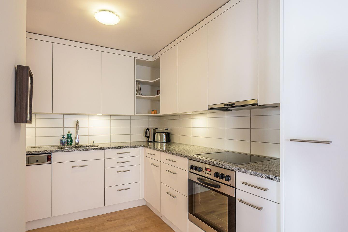 Die Küche ist ausgestattet mit Kühlschrank, Backofen und Herd, einer Nespresso-Kapselmaschine, Wasserkocher, Toaster und Geschirrspüler. Der Ess- und Wohnbereich lädt zu gemütlichen Abenden am Kamin ein. Bitte beachten Sie, dass kein Holz vorhanden ist und selbst organisiert werden muss.