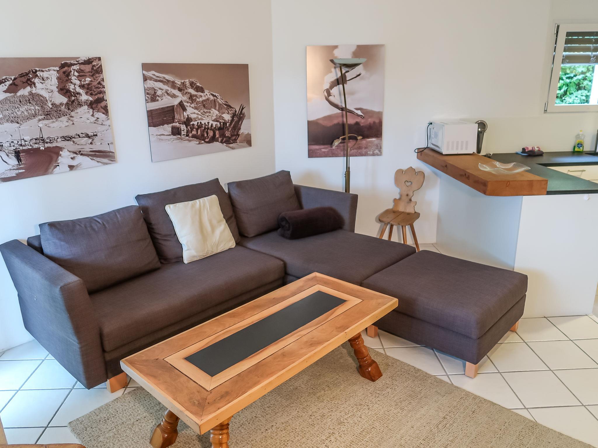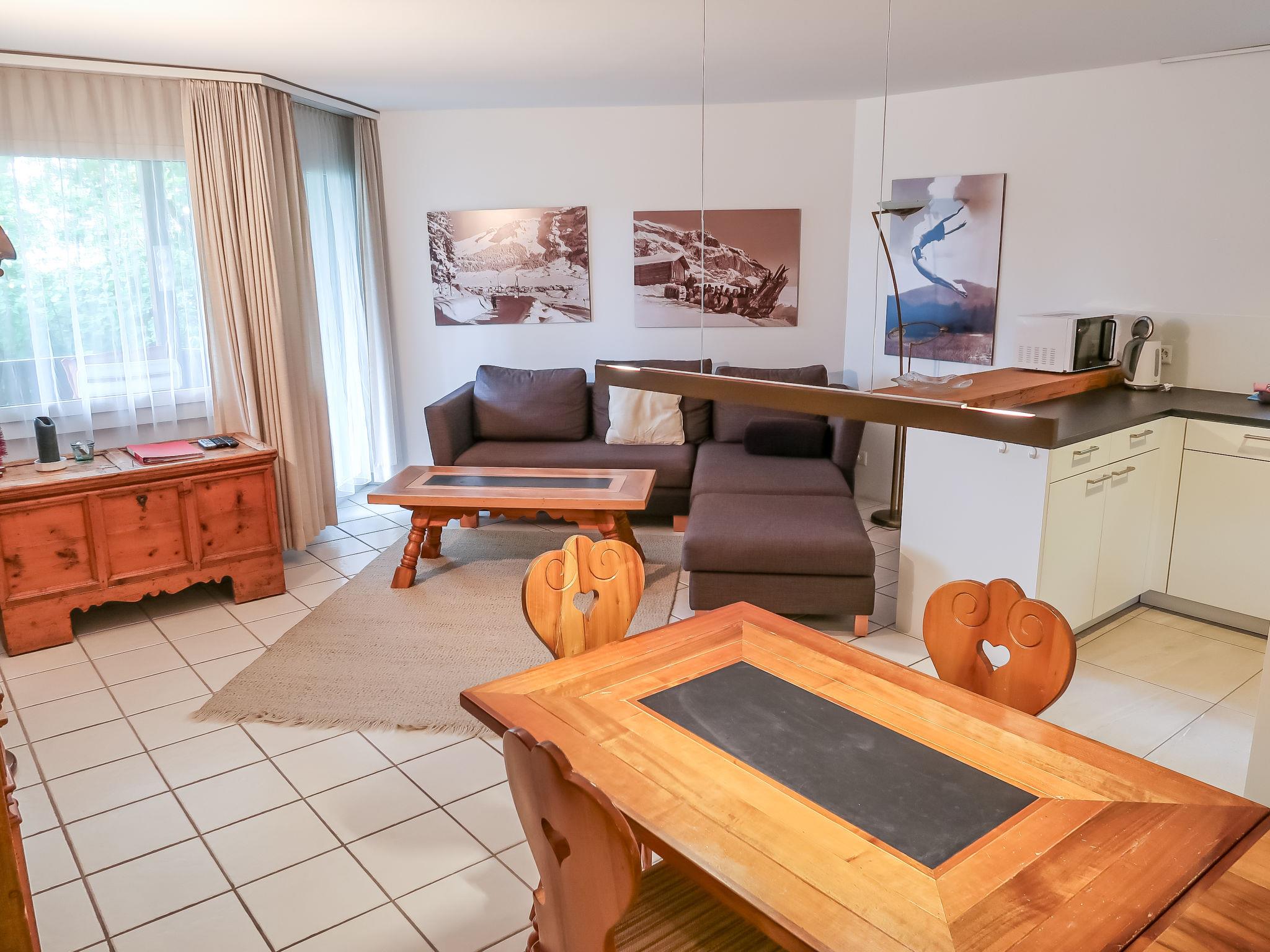 "Tavaun A11", 2-room apartment 40 m2 on 1st floor. Fully renovated in 2015, comfortable and modern furnishings: living/dining room with 1 sofabed, dining table and cable TV (flat screen), radio and DVD. Exit to the balcony. 1 double bedroom. Open kitchen (oven, dishwasher, 4 ceramic glass hob hotplates, toaster, kettle, microwave, electric coffee machine, Capsules for coffee machine (Nespresso) extra, raclette grill). Bath/WC. Balcony, west facing position. Balcony furniture. Side view of the mountains, the countryside and the resort. Facilities: Internet (WiFi, free). Garage space n A11. Please note: non-smokers only.