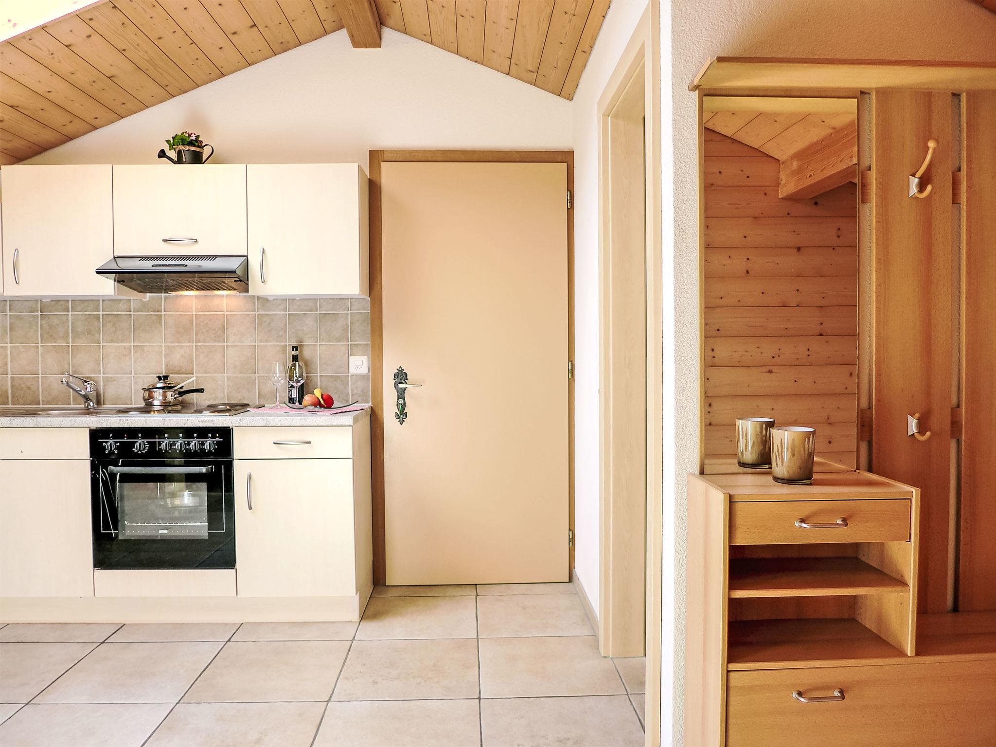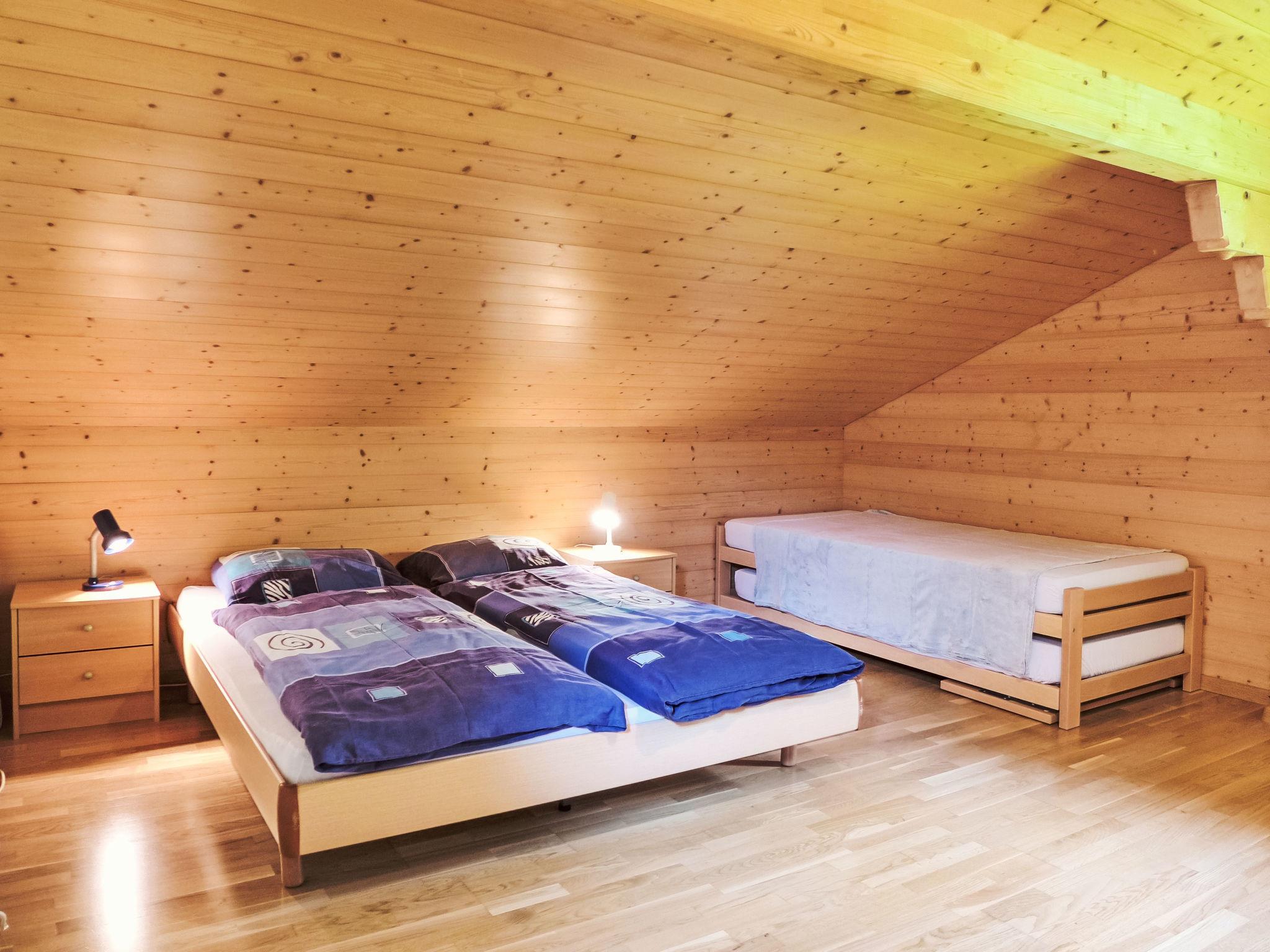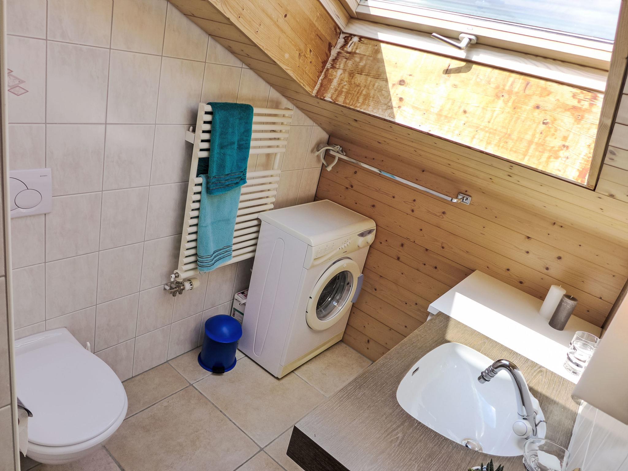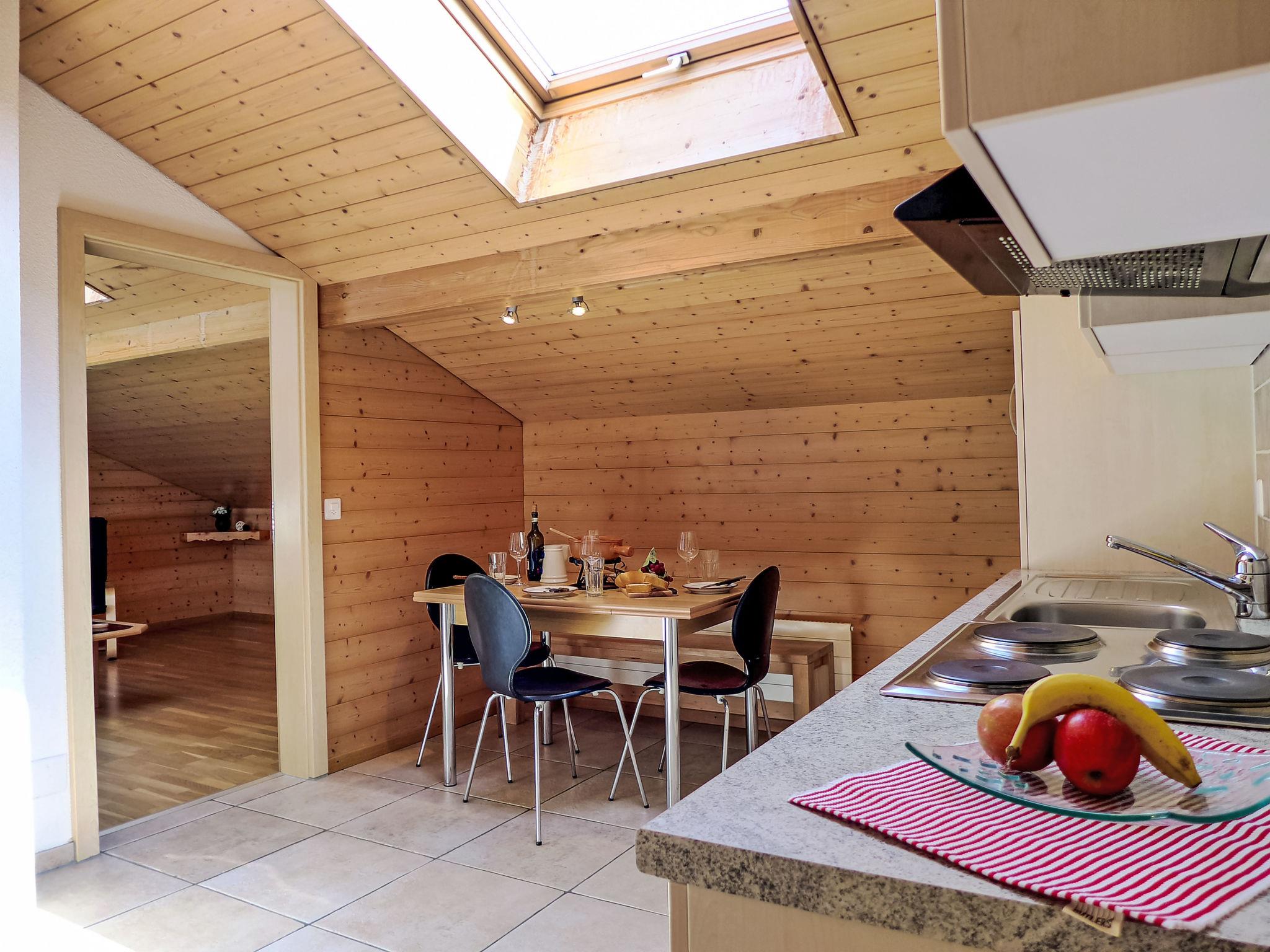 "Bühl", 3-room apartment on the top floor. Bright, partly with sloping ceilings, practical and cosy furnishings: living/sleeping room with 1 sofabed (140 cm, length 200 cm). 1 large room with 2 beds (90 cm, length 200 cm), 1 french bed (160 cm, length 200 cm). Large kitchen-/living room (4 hot plates, oven, toaster, kettle, freezer, electric coffee machine, Capsules for coffee machine (Nespresso) extra, fondue Set (cheese)) with dining nook. Shower/WC. Side view of the mountains and the countryside. Facilities: washing machine, baby cot for up to 3 year olds, hair dryer. Internet (WiFi, free). Please note: non-smokers only.