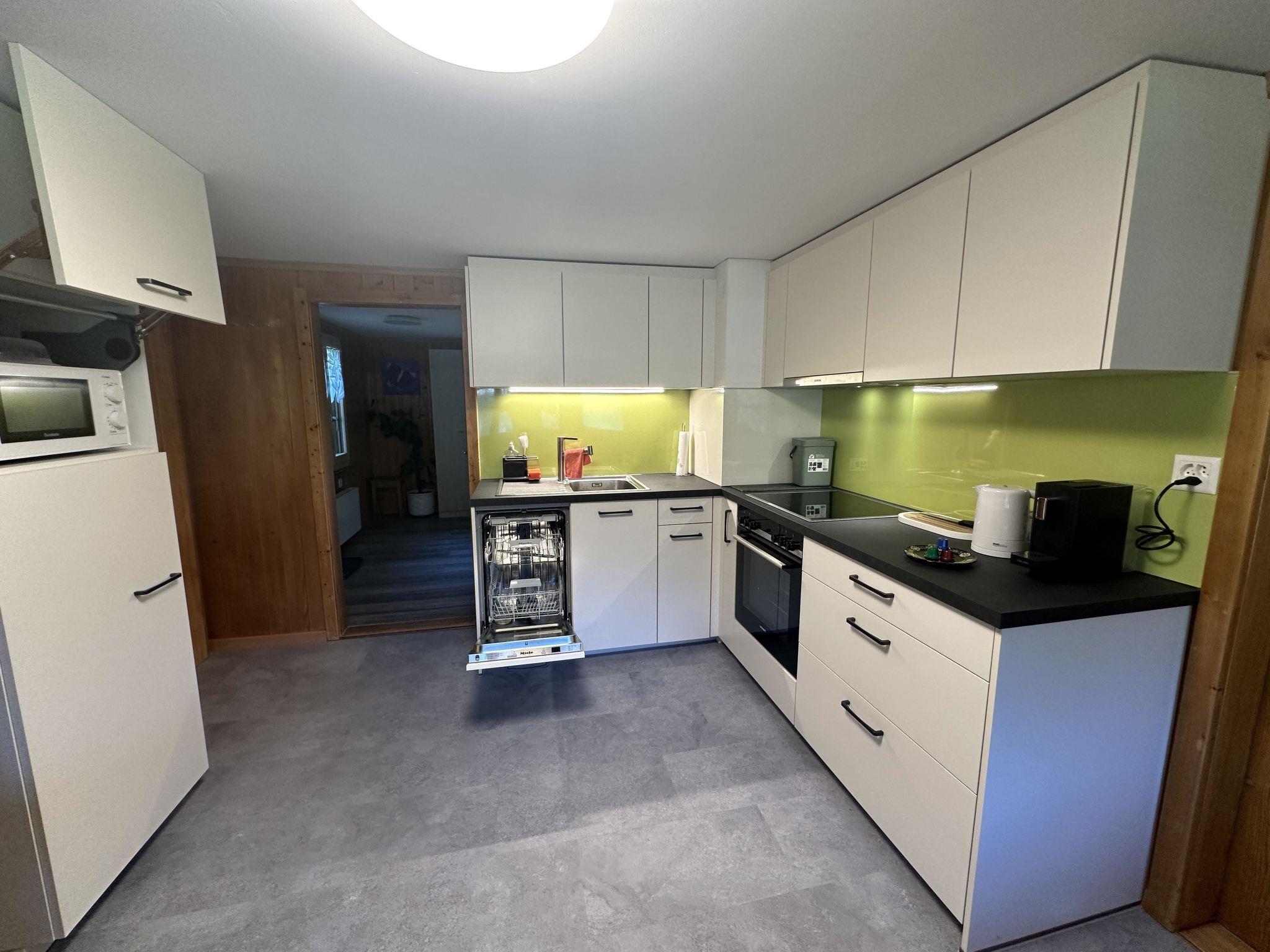 80 m2. More information by the provider: Freshly renovated and sunny 3-room apartment (80m2) on the first floor of a two-family house. The apartment is located in a quiet area surrounded by greenery, yet close to the village of Frutigen. Living room with satellite TV, Wi-Fi and seating area. Fully equipped new kitchen with oven, kettle, dishwasher, coffee maker, refrigerator with freezer compartment. One bedroom with a double bed, one bedroom with three single beds (total of 5 beds, 90x200 cm). One bathroom with shower/WC. Balcony with unobstructed views of the mountains. Garden seating area with gas grill. Two parking spaces available. Pets not allowed. Non-smoking apartment.