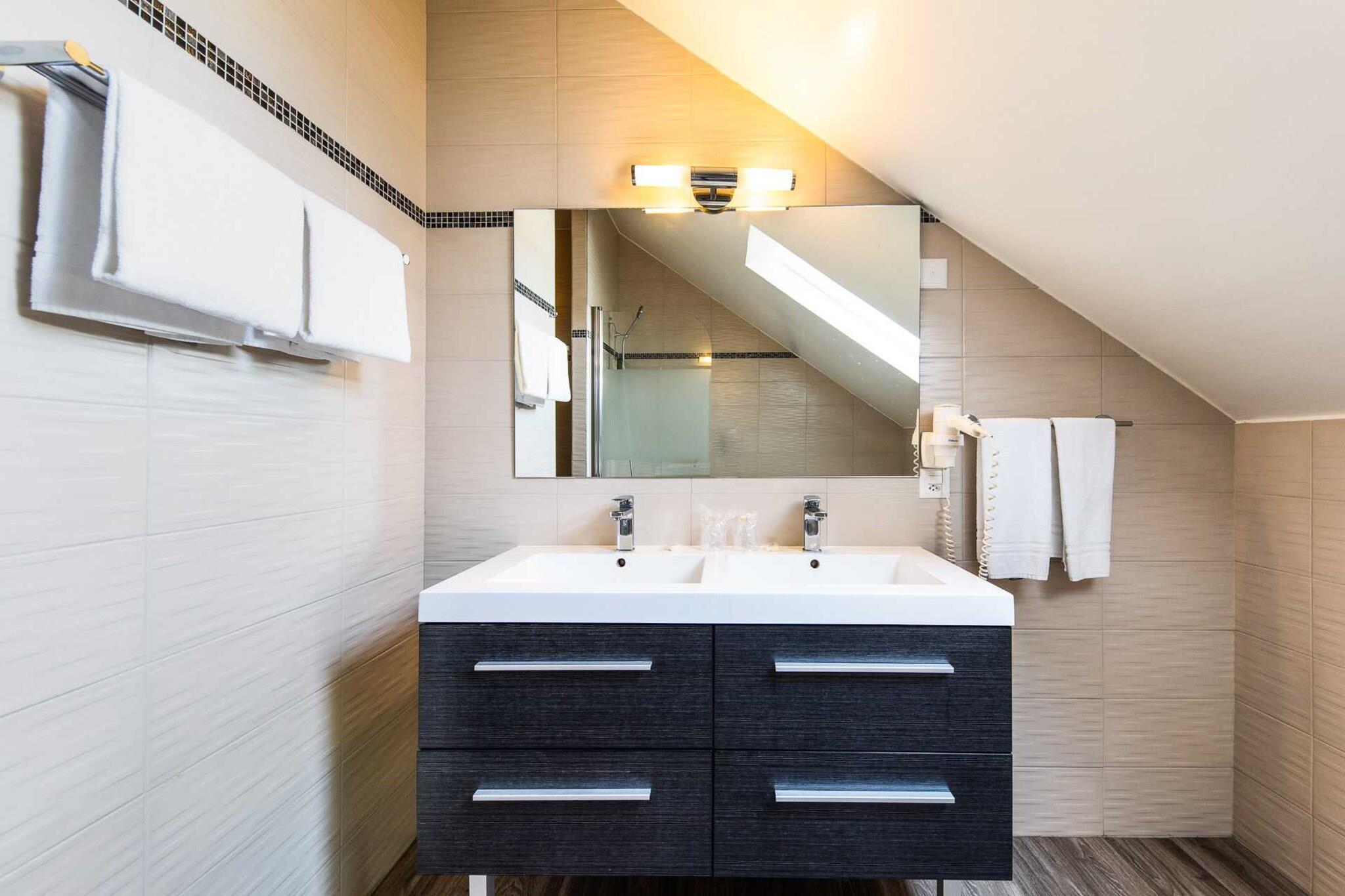 On the 6th floor: (Kitchen(stove, hob, coffee machine, combination microwave, fridge, electric hot plates, dishes and cutlery, Cooking basics, Wine glasses), bedroom(double bed, TV), bathroom(bath tub, toilet, hairdryer, shampoo, body soap, hot water))
