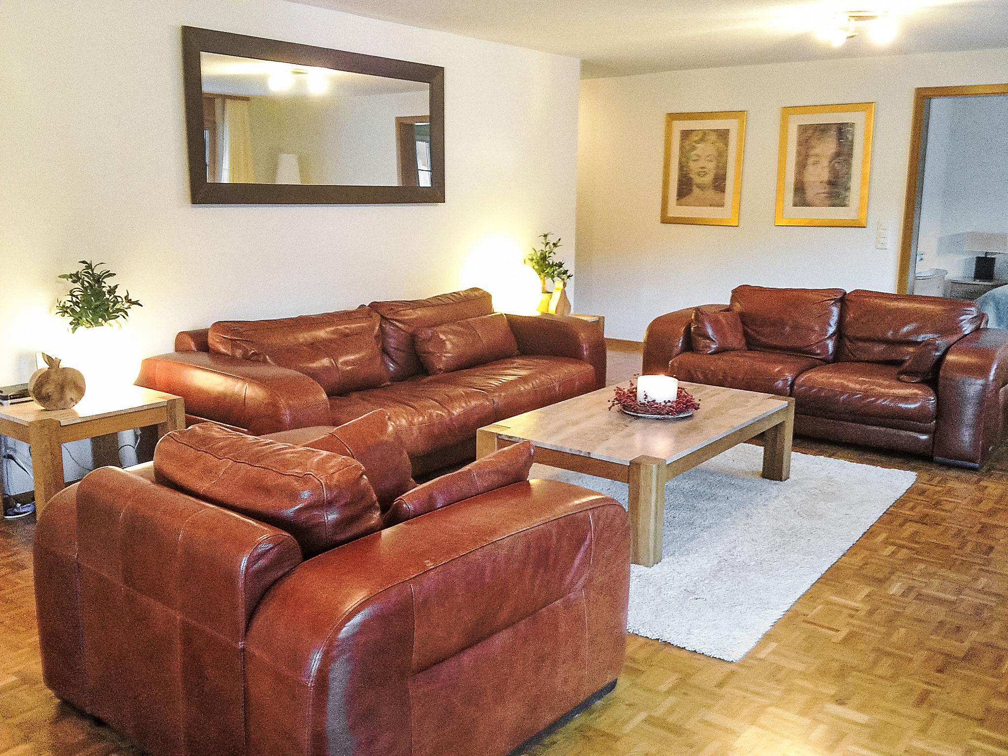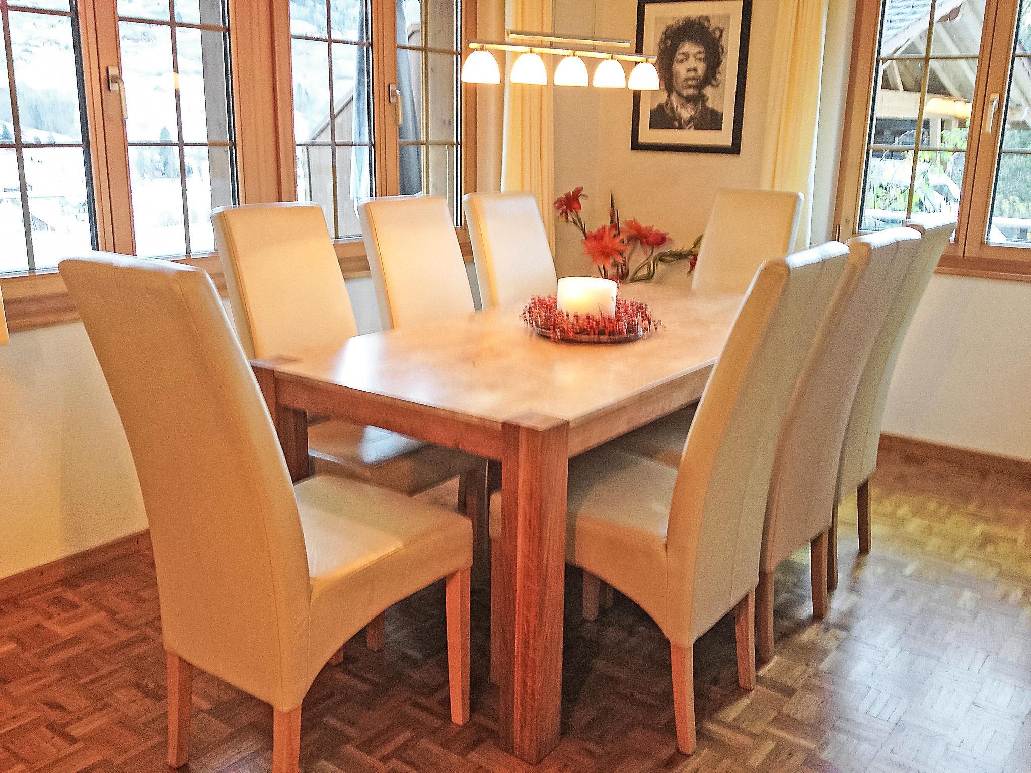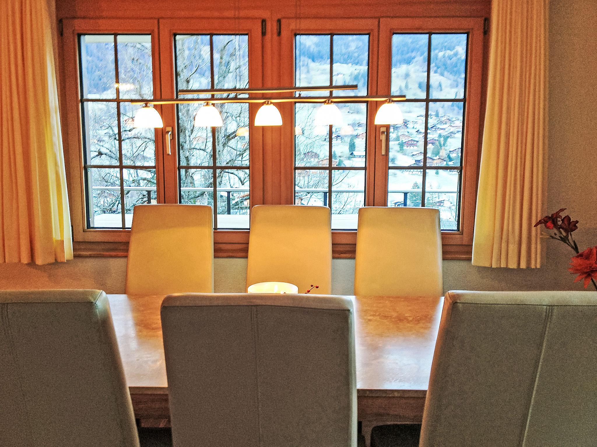 5-room apartment 140 m2, on the upper ground floor, south facing position. Tasteful and cosy furnishings: living/dining room with digital TV and flat screen. Exit to the terrace, south facing position and west facing position. 2 rooms, each room with 2 beds (90 cm, length 200 cm). 1 room with 1 double bed (180 cm, length 200 cm). 1 room with 1 french bed (150 cm, length 200 cm). Open kitchen (oven, dishwasher, 4 ceramic glass hob hotplates, toaster, kettle, microwave, electric coffee machine, raclette grill, fondue Set (cheese)). Bath/WC, shower/WC, sep. WC. Floor heating. Wooden floors. Large terrace, south facing position and west facing position. Terrace furniture, deck chairs (2), box-room. Marvellous view of the mountains and Eiger. Facilities: washing machine, dryer, hair dryer. Internet (WiFi, free). Parking space n EG 5 (1 car). Please note: non-smokers only. Fire extinguisher.