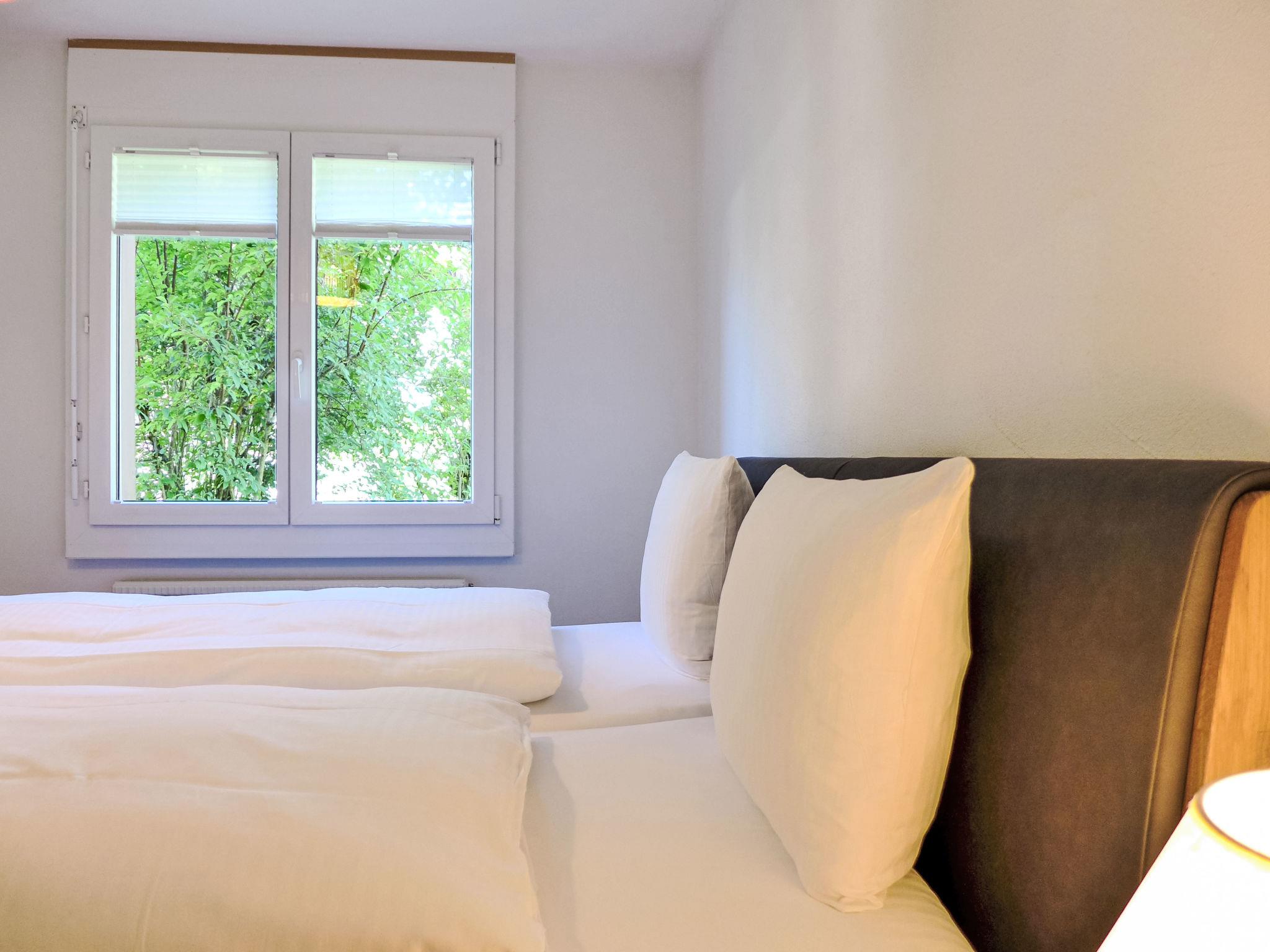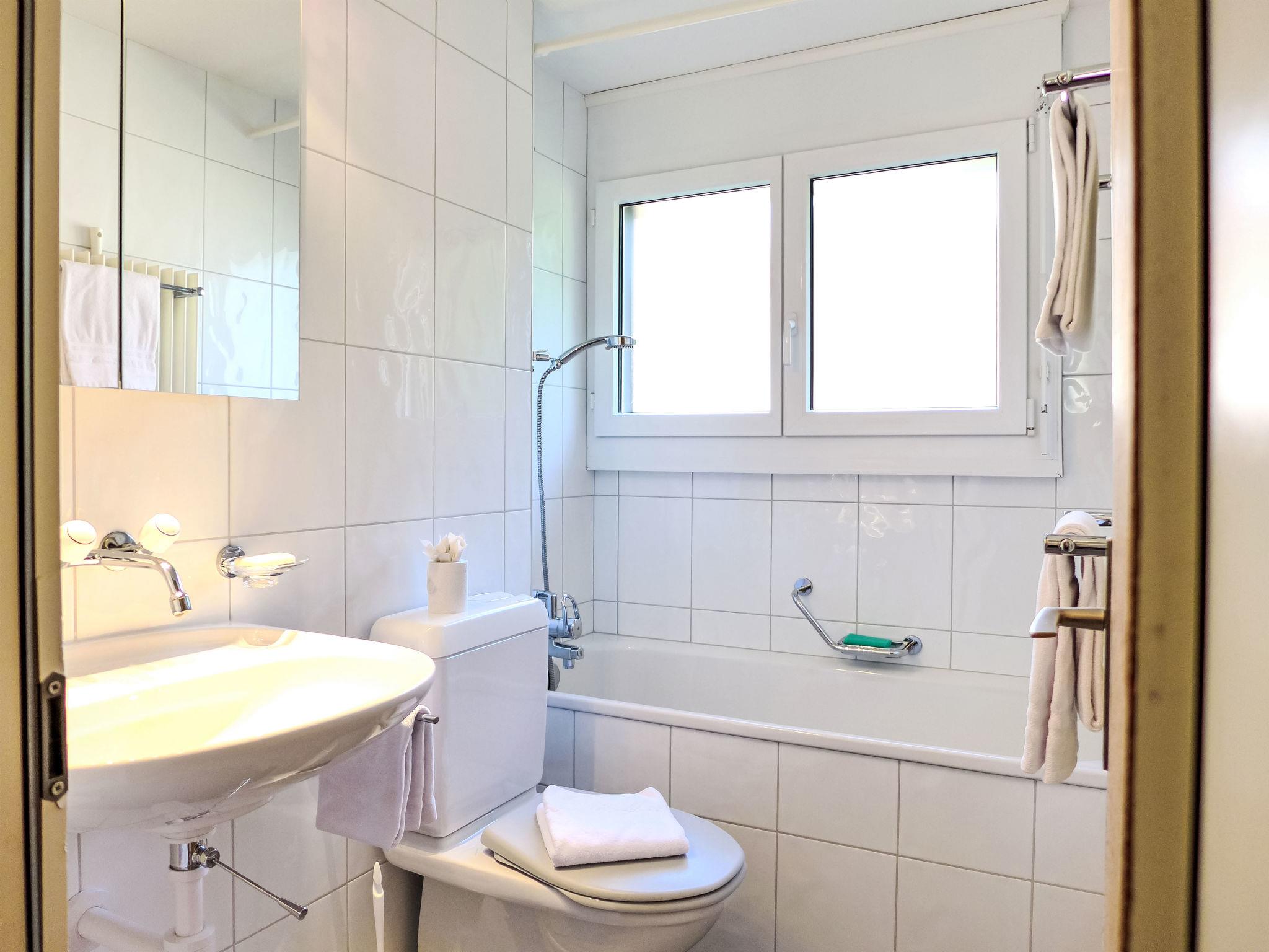 2-room apartment 40 m2, on the upper ground floor, south facing position. Very comfortable and cosy furnishings: open living/dining room with dining table, cable TV, international TV channels and radio. Exit to the balcony, south facing position. 1 room with 1 double bed (2 x 80 cm, length 200 cm). Open kitchen (oven, dishwasher, 4 ceramic glass hob hotplates, toaster, kettle, electric coffee machine, Capsules for coffee machine (Nespresso) extra, raclette grill, fondue Set (cheese)). Bath/WC. Carpet. Balcony, south facing position. Balcony furniture. Marvellous view of the mountains and the countryside. Facilities: hair dryer. Internet (WiFi, free). Garage (1 car) at the house, height 195 cm. Please note: non-smokers only.