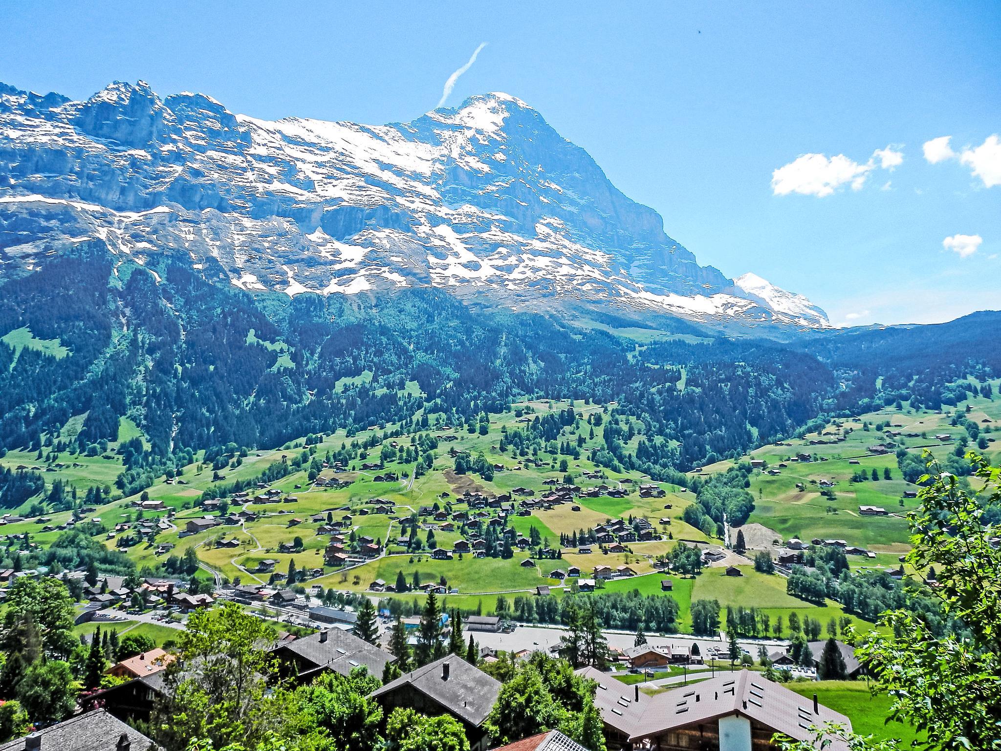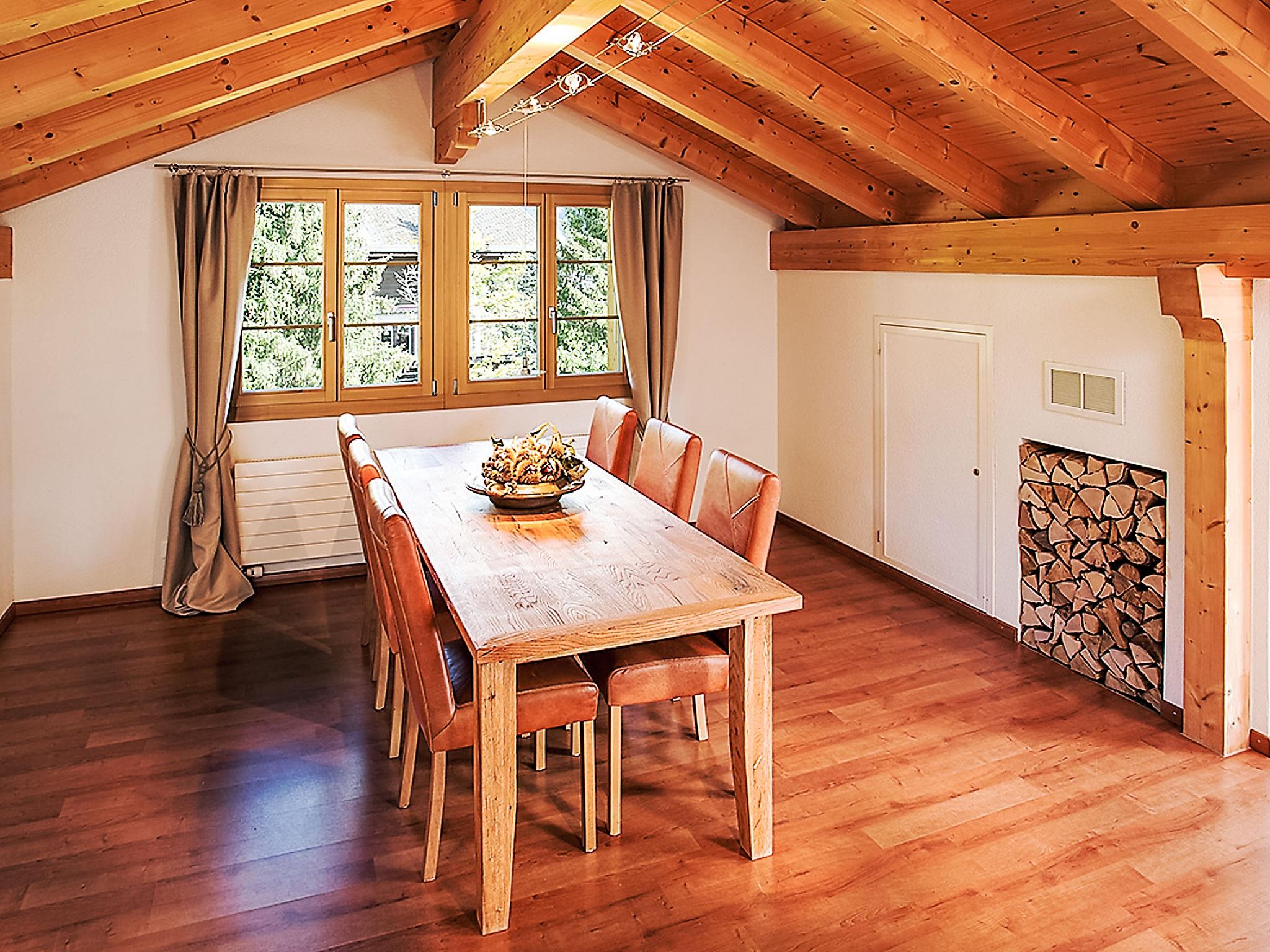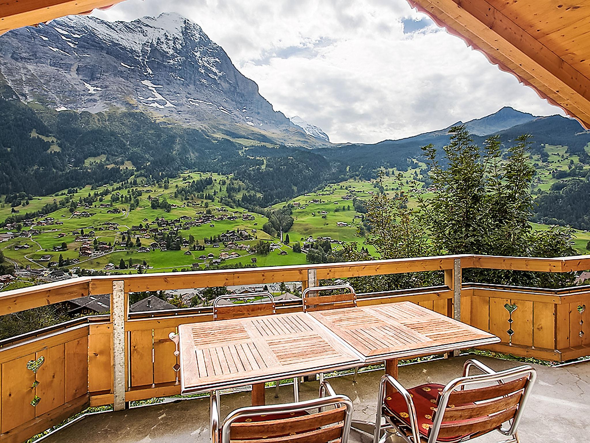 4-room apartment 130 m2, on the top floor, south facing position. Partly with sloping ceilings, beautiful and tasteful furnishings: open living/dining room with sloping ceilings with open-hearth fireplace and cable TV (flat screen), radio. Exit to the balcony, south facing position. 1 room with 1 double bed (2 x 90 cm, length 200 cm). 1 room with 2 beds (90 cm, length 200 cm). 1 small room with 1 bed (90 cm, length 200 cm). Open kitchen (oven, dishwasher, 4 ceramic glass hob hotplates, electric coffee machine, Capsules for coffee machine (Nespresso) extra, raclette grill, fondue Set (cheese)). Bath/WC, shower/WC. Floor heating, boiler (300 litres). Large balcony, south facing position. Balcony furniture. Marvellous view of the mountains, the valley and Eiger. Facilities: hair dryer. Internet (WiFi, free). Parking space n 2 (roofed, 1 car). Please note: non-smokers only. Private entrance, fire extinguisher.