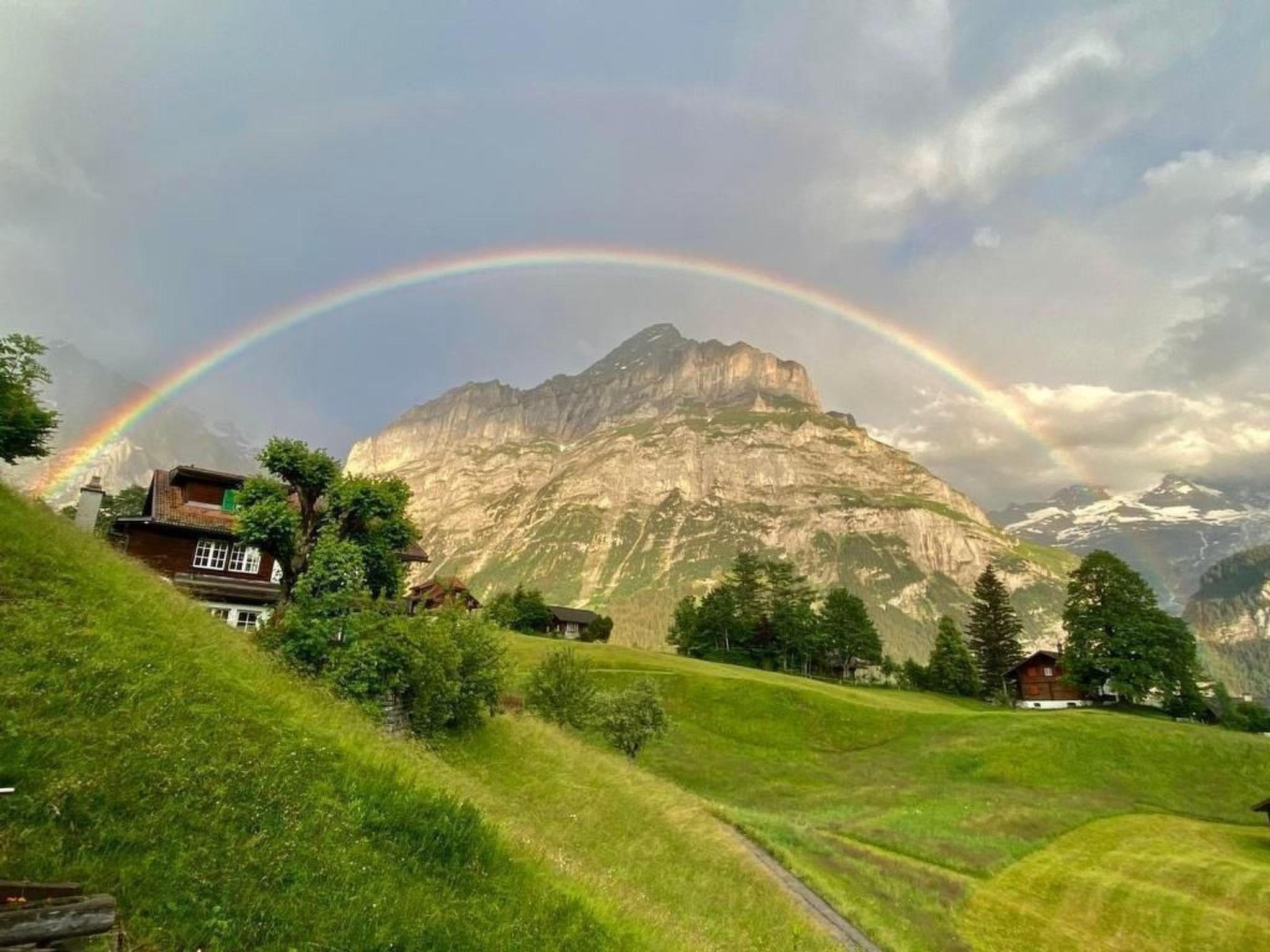 Bright, 37 m2 2-room flat in a cosy single-family chalet in a quiet and sunny location. 300° view of the unique Grindelwald mountains (Wetterhorn, Mettenberg, Eismeer, Fiescherhorn Eiger, Eiger north face, Tschuggen and Männlichen). Balcony/lawn with deckchairs and fountain as well as Ratan lounge on the large terrace.