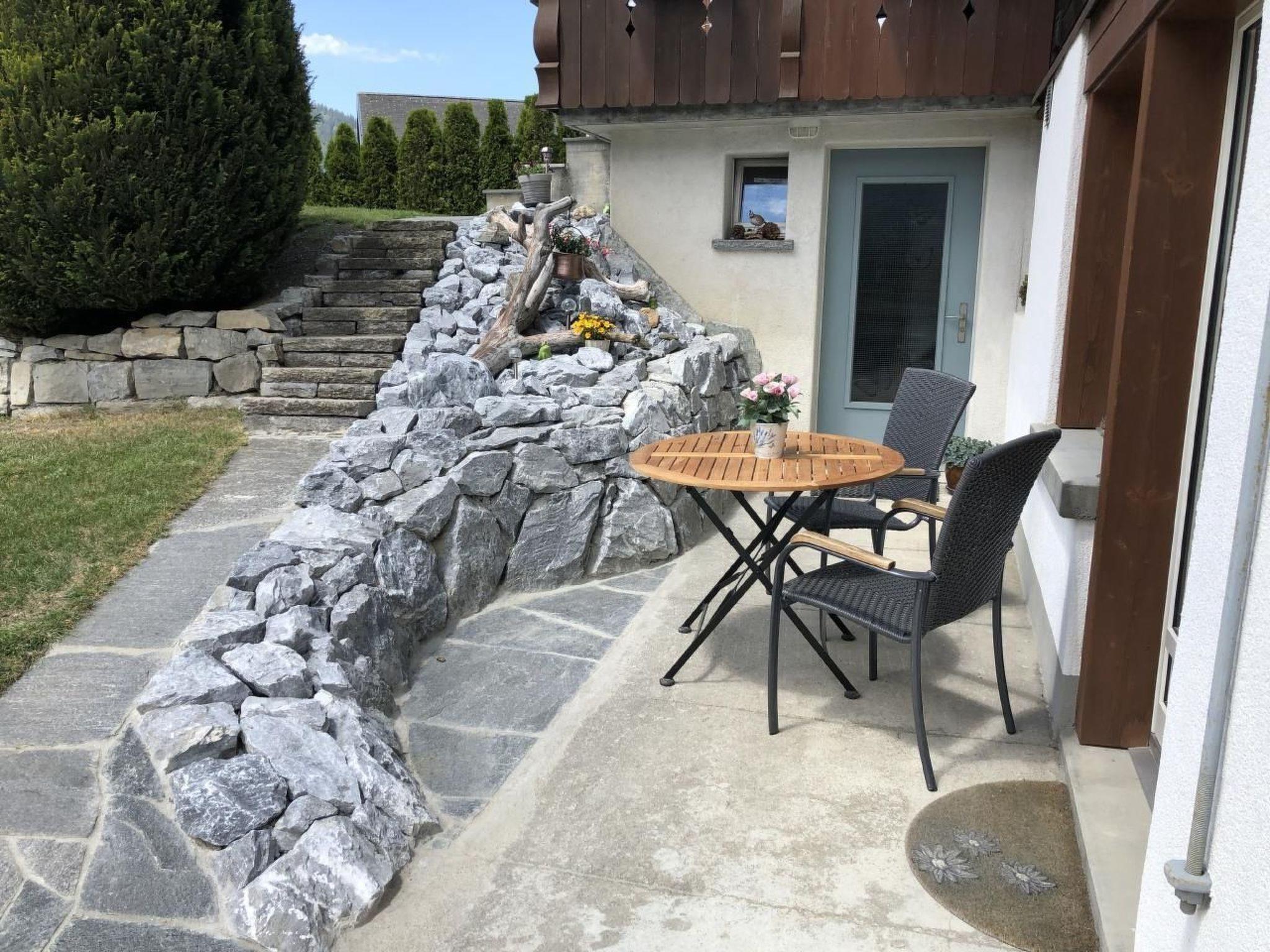 Direct access to the sunny outdoor seating area with a clear view of the north face of the Eiger and the surrounding mountains.