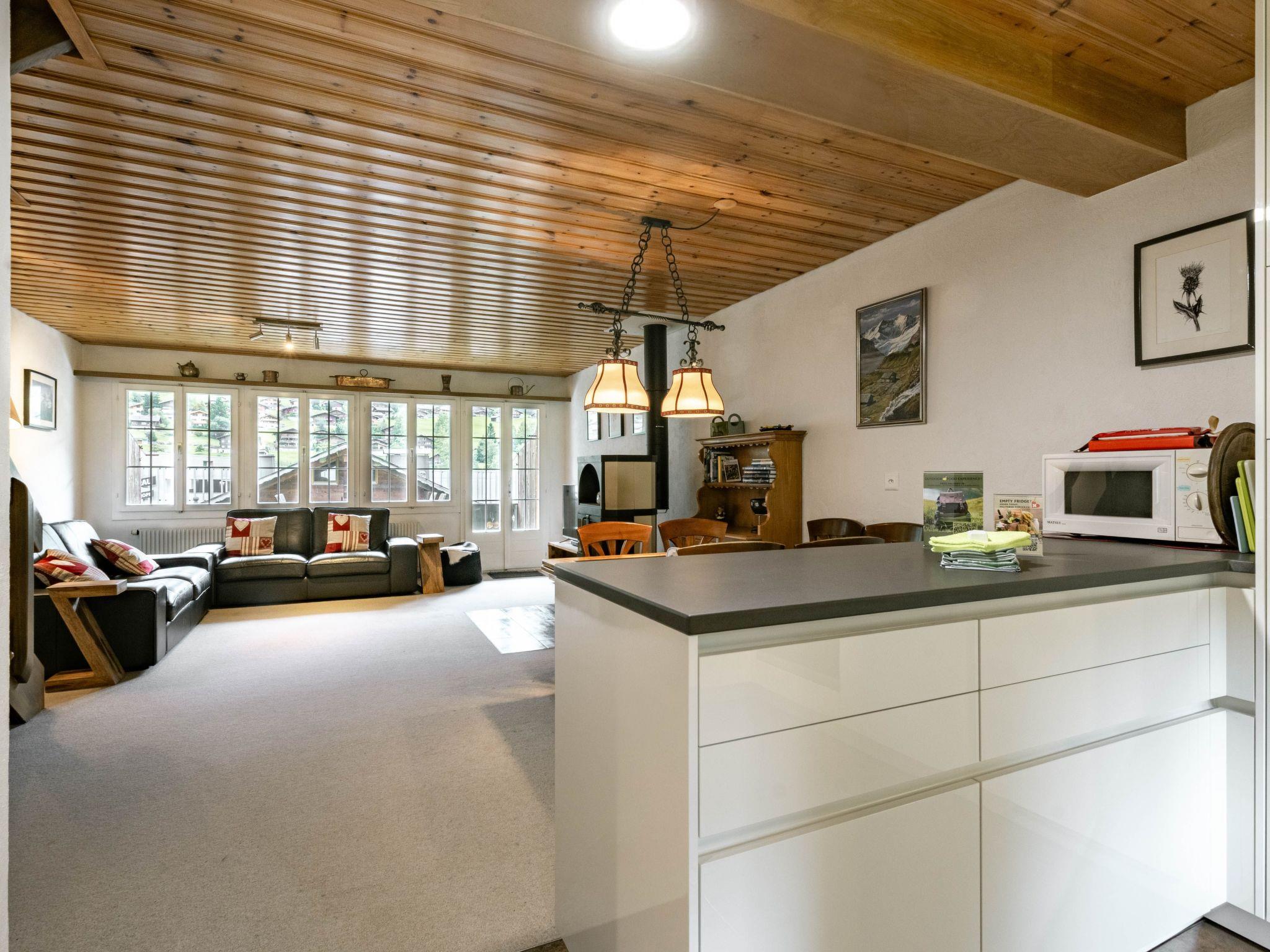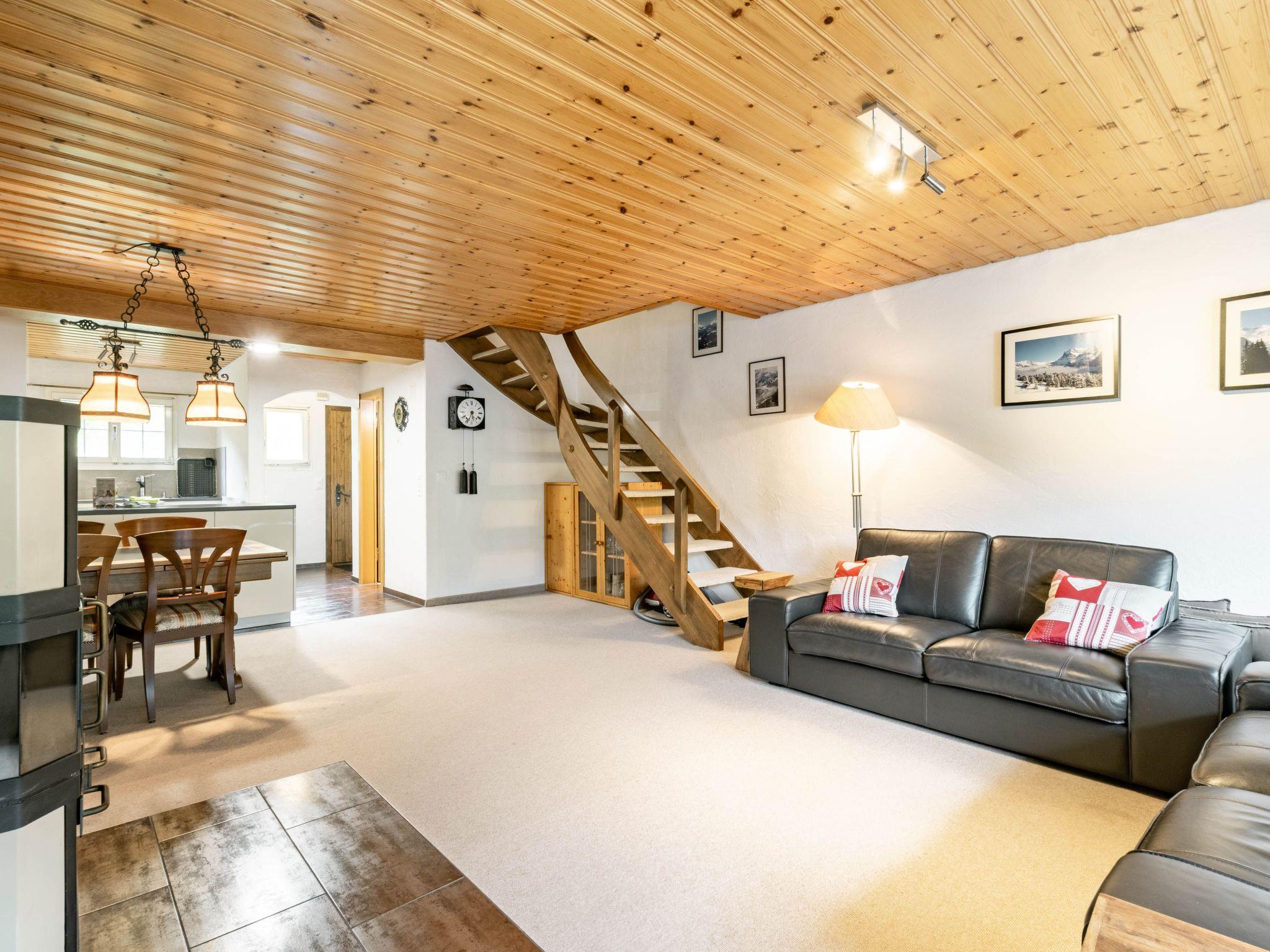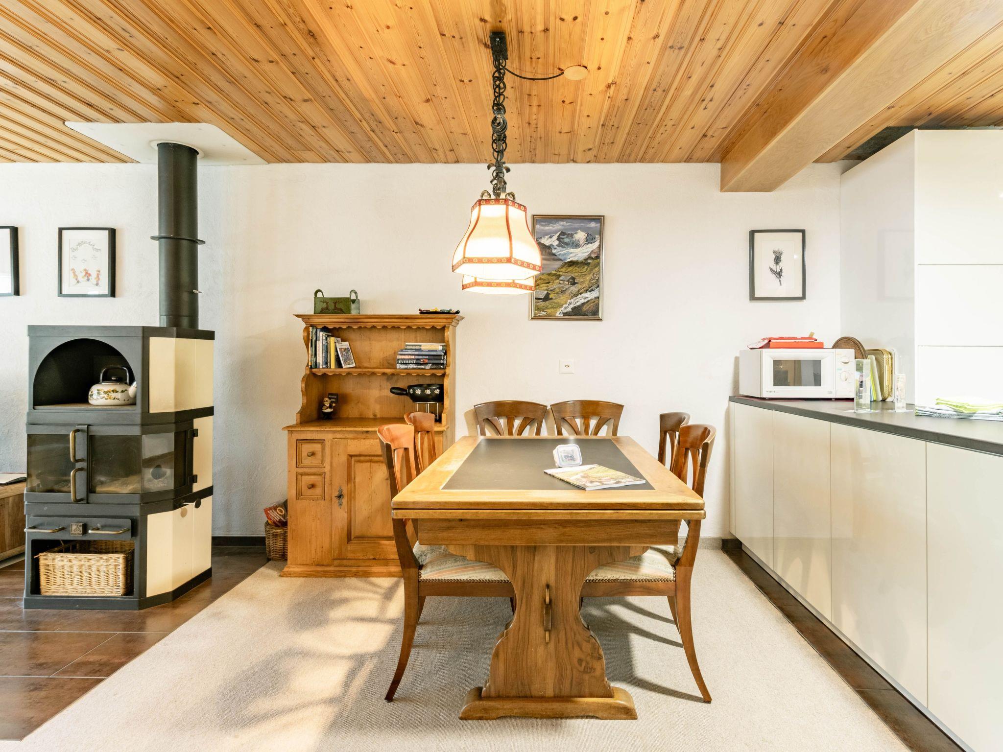 The cosy 4.5-room flat has three bedrooms, two double bedrooms and one bedroom with bunk beds, as well as a bathroom with shower and WC and a bathroom with bathtub and WC. The flat has a well-equipped kitchen and a cosy living and dining area with a fireplace. The spacious balcony offers a beautiful view of the surrounding mountain landscape.