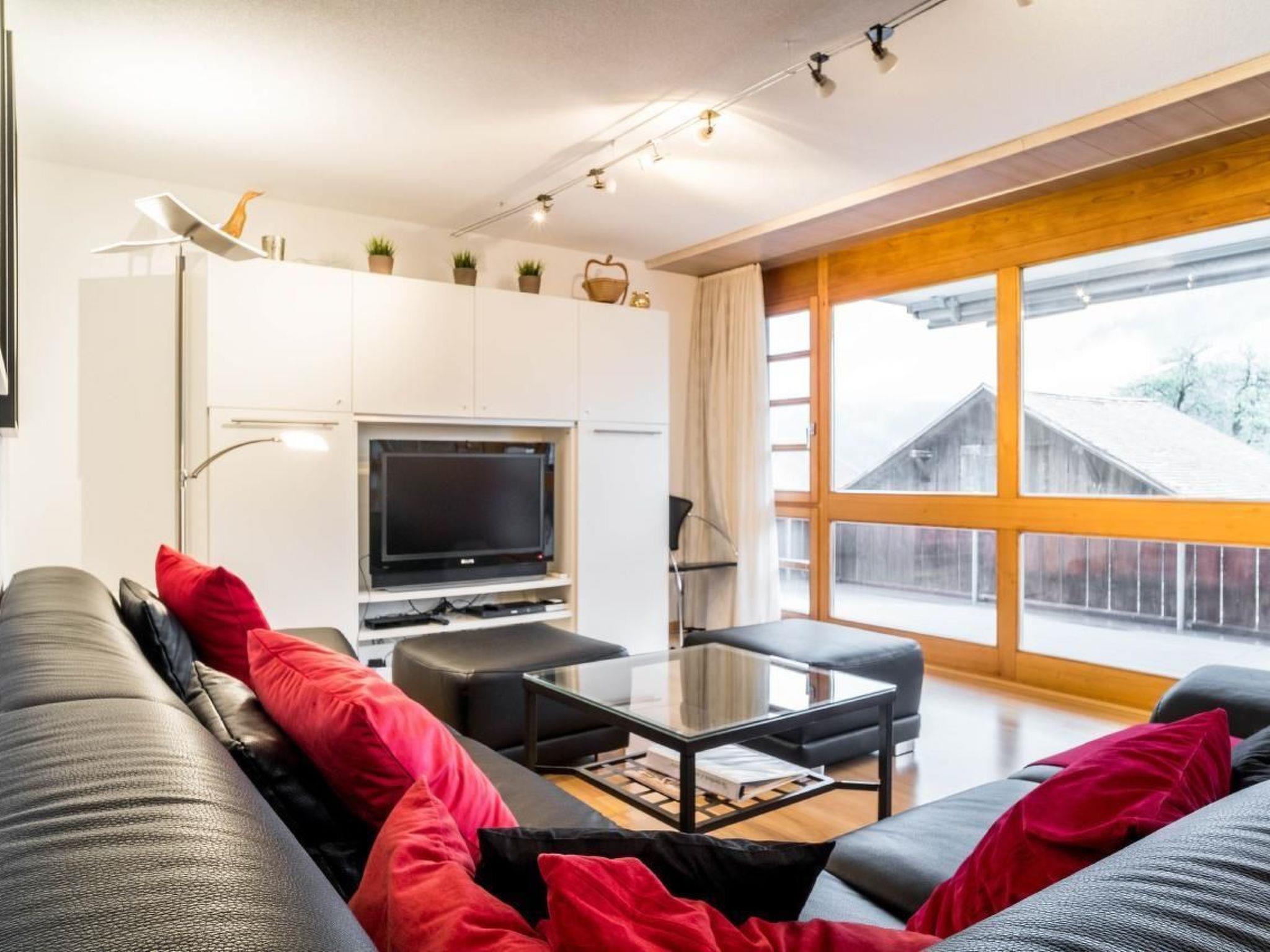 The 90m2 3.5-room apartment on the 2nd floor has a bedroom with double bed, a bedroom with two single beds, a bathroom with shower, toilet and bidet and a bathroom with bath and toilet. The well-equipped kitchen adjacent to the cosy dining/living area. From the balcony you can enjoy the unique mountain panorama.