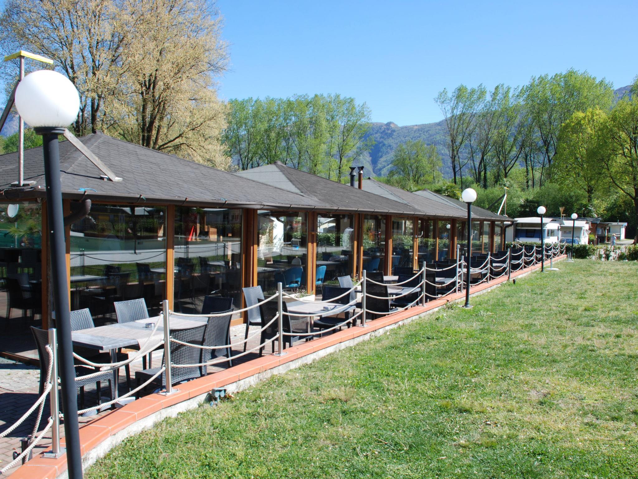 Gudo 16 km from Locarno: Modern, cosy bungalow "Isola", surrounded by trees and meadows. 6 houses in the resort. On the outskirts Gudo, in a sunny position, in the countryside. For shared use: natural state property, beautiful, well-kept garden, meadow, swimming pool angular (24 x 12 m, 300 m2, depth 40 - 160 cm, seasonal availability: 20.May. - 15.Oct.) with internal staircase. Outdoor shower, table tennis, children's playground. In the complex: reception, restaurant, lounge, WiFi, playroom, table football, shopping facilities, kiosk, storage room for bicycles, central heating system. Breakfast and half board possible on request (extra). Motor access to the grounds. Grocery 50 m, supermarket 4 km, restaurant 50 m, café, bus stop "Linie 311" 500 m, railway station "SBB- CFF Riazzino" 4.4 km. Cycle lane 200 m. Nearby attractions: Castelli di Bellinzona, Piazza Grande, Locarno, Ascona, Ronco sopra Ascona, Isole di Brissago, Cardada, Madonna del Sasso, Mercato Luino e Cannobio IT. Well-known lakes can easily be reached: Lago Maggiore, Lago di Lugano, Lago di Como. Hiking paths: Valle Verzasca, Centovalli, Vallemaggia. Please note: suitable for families. Groups of teenagers on request only. The complex has another 5 bungalows for rent.