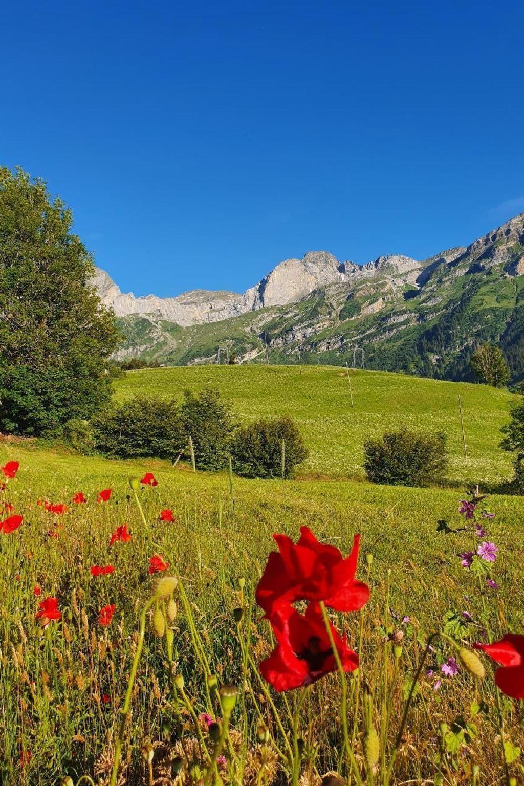 The Mu-(sik)heim holiday home is situated at 1,100 metres above sea level on the Haldi sun terrace in the heart of primeval Switzerland. Surrounded by imposing mountains and nestled in lush meadows, you can experience the Swiss mountains up close. If you are on holiday here, you can obtain a driving permit from the municipality for a fee. Otherwise, locals and tourists take the cable car to Haldi. This is probably one of the reasons why the area is a quiet oasis for people who want to escape the hustle and bustle of everyday life. Here you will find various places of power for quiet contemplation, numerous walking and hiking opportunities through forests, fields, alpine meadows with marvellously fragrant and beautiful alpine flowers up to the mountain peaks and rocky paths. A piano allows musicians to practise or compose to their heart's content. In winter, various snowshoe routes invite you to go on day or full moon and star hikes. The romantic toboggan run into the valley and the nearby family ski lift are also popular.