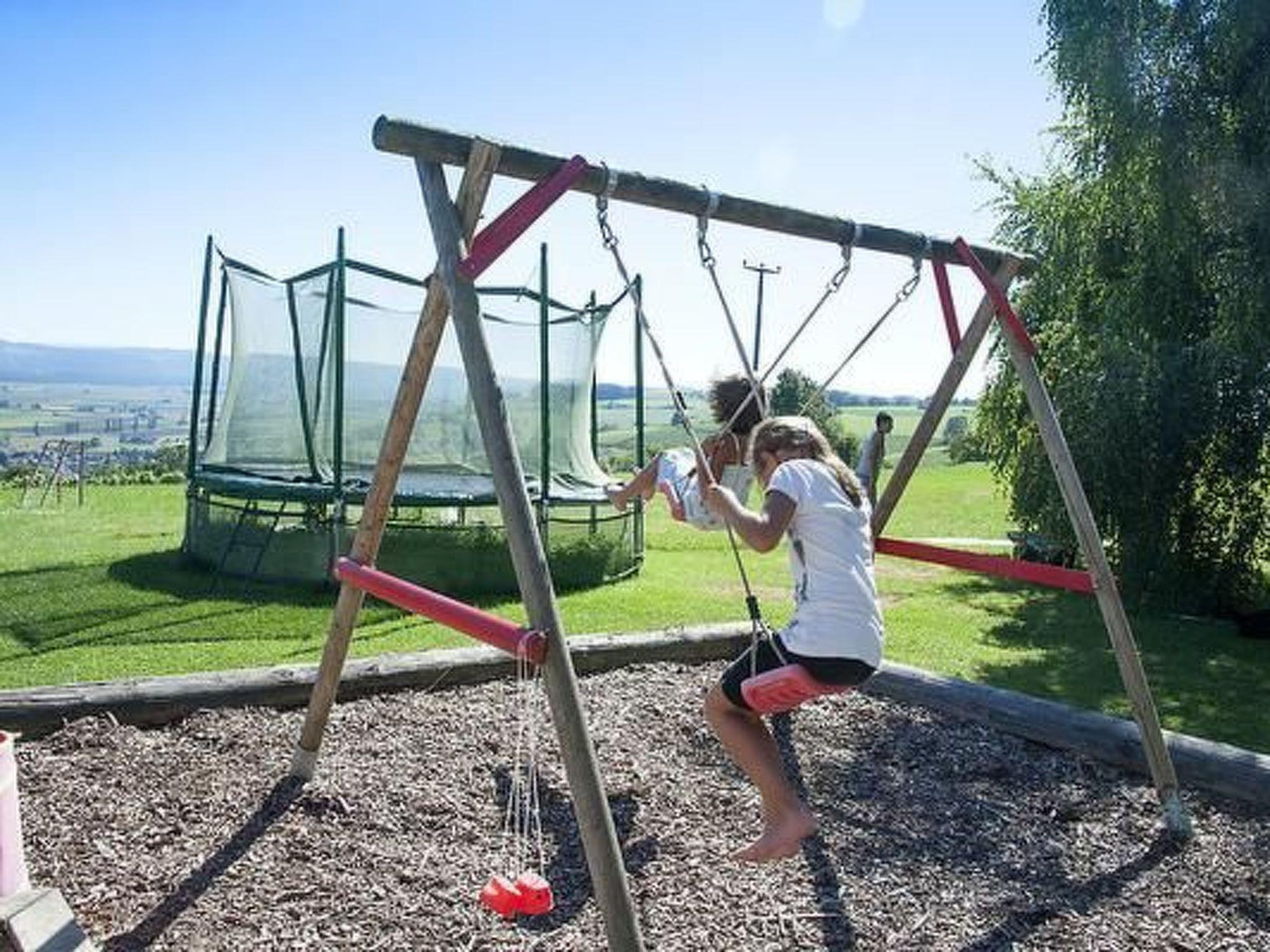 Holidays for the whole family? Then you've come to the right place. Our pretty holiday flat is located on the 2nd floor of our house and is easily accessible by lift. On the patio in front of the house you can enjoy the peace and quiet and the marvellous view of the vines and the Schaffhausen Blauburgunderland. The children can spend their time in the playground or petting the animals. The Klettgau is ideal for short hikes and cycle tours. We warmly welcome you to the Berghof Hallau!