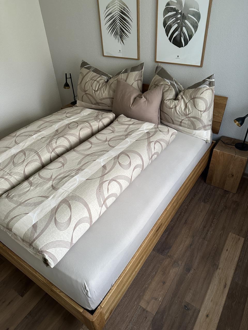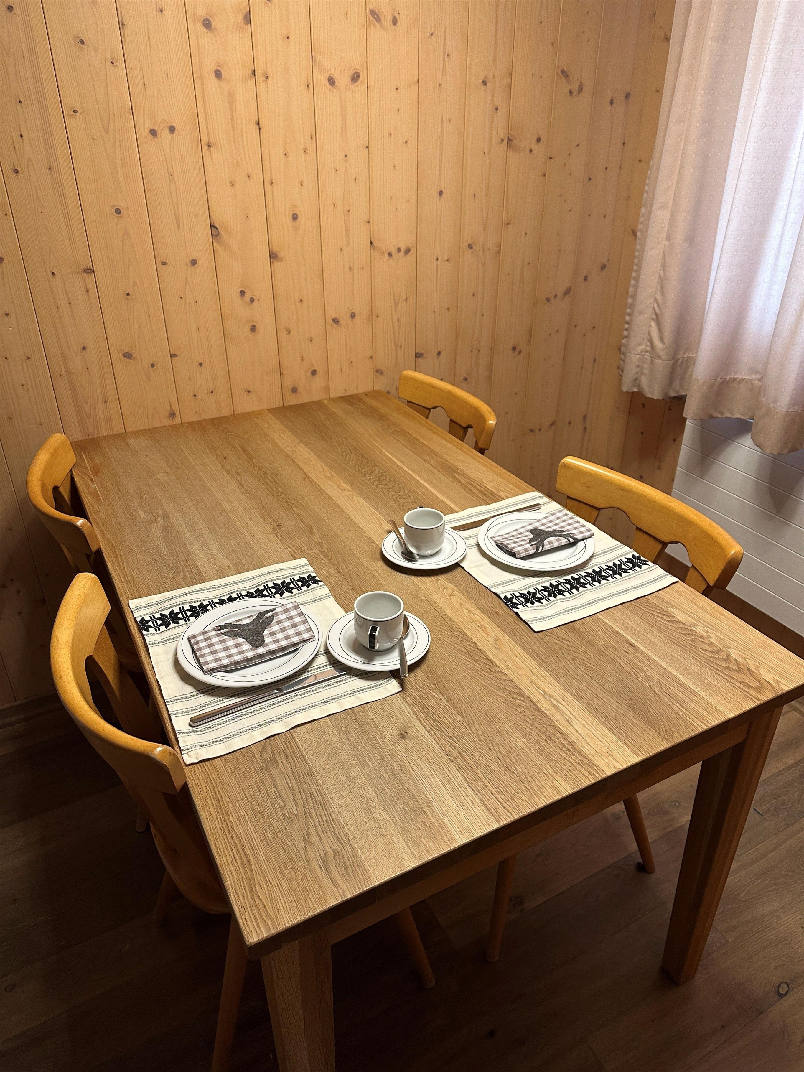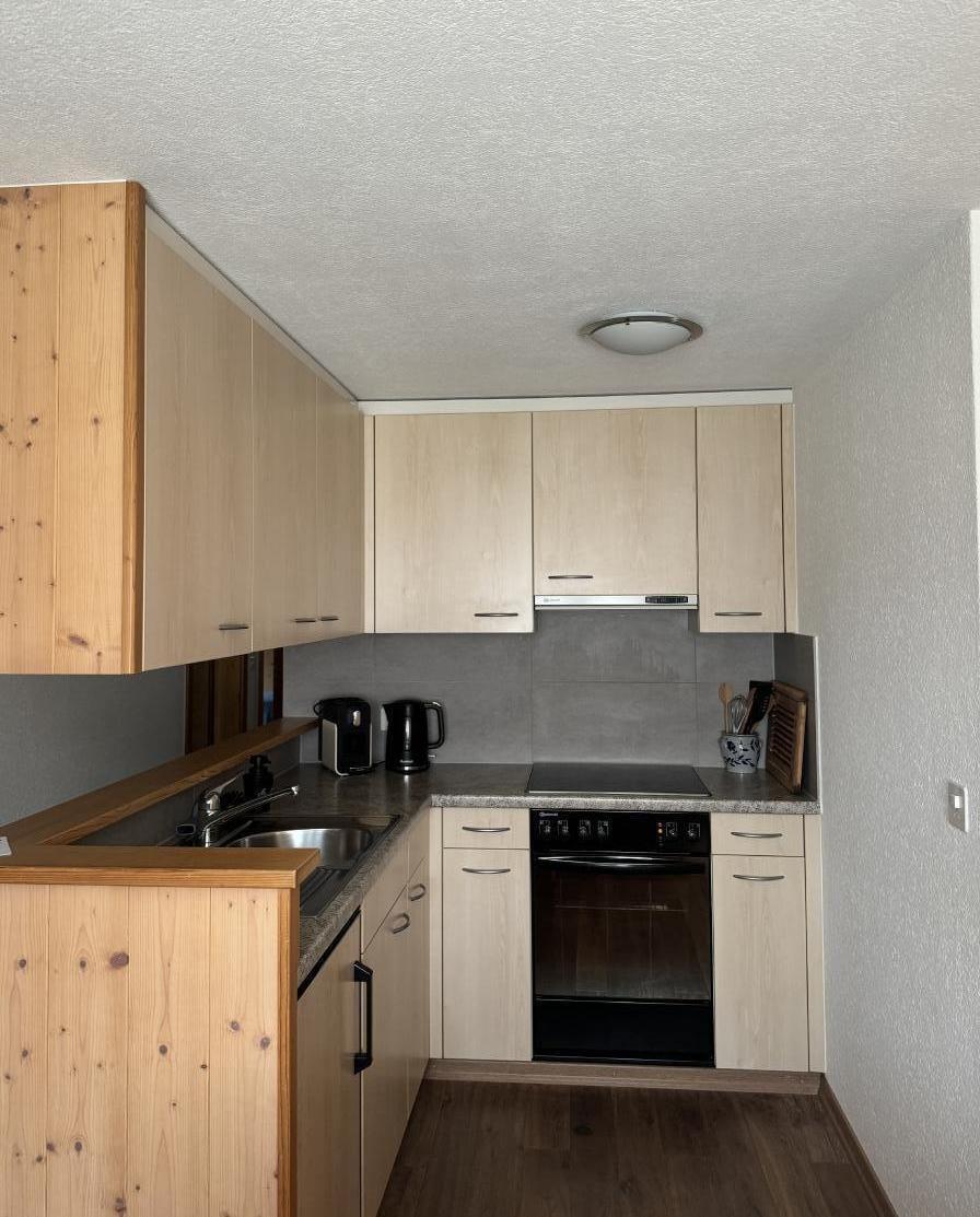 Inside, the flat impresses with high-quality furnishings that leave nothing to be desired: A well-equipped kitchen with ceramic hob, fridge, oven and a selection of coffee machines (filter and capsule), a kettle, a cheese fondue set and a raclette oven. In the living room, a comfortable leather upholstered suite invites you to relax, complemented by fabric armchairs, side tables, Swisscom TV and WLAN. The bedrooms are invitingly designed, one with a double bed, the other with two single beds that can be combined into one large bed, alongside practical clothes racks and bedside tables.