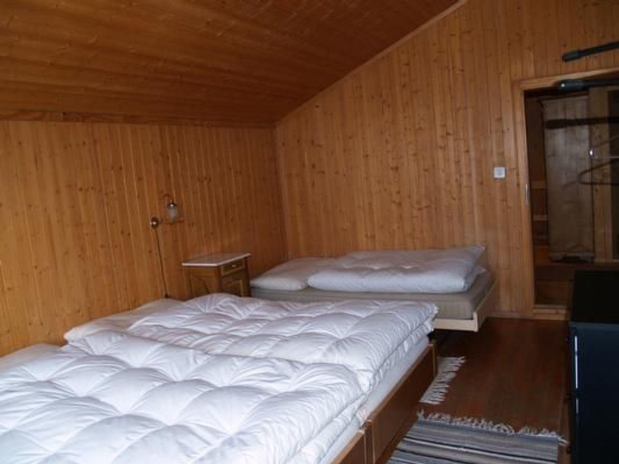Ground floor: Stairs in front of the house lead to the outside door to the arbour (unheated) for skis, sledges, prams etc. Second entrance door leads to the kitchen and to the fire door of the wood-burning stove, separate WC, parlour with stove, bedroom no. 1 with two beds.