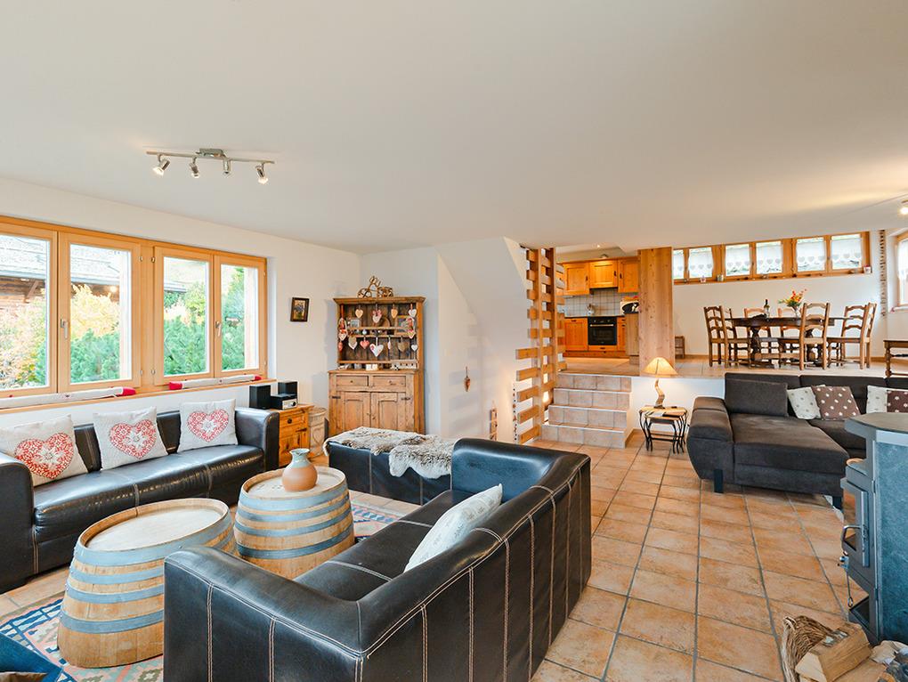 1. Etage: Wohnbereich mit großer Fensterfront, gemütlicher Sofa-Sitzgruppe am Kaminofen, Sat-TV, DVD, Stereoanlage. Küchen-/Essbereich mit Esstisch, gut ausgestatteter Einbauküche (Backofen, Spülmaschine). Separates WC.